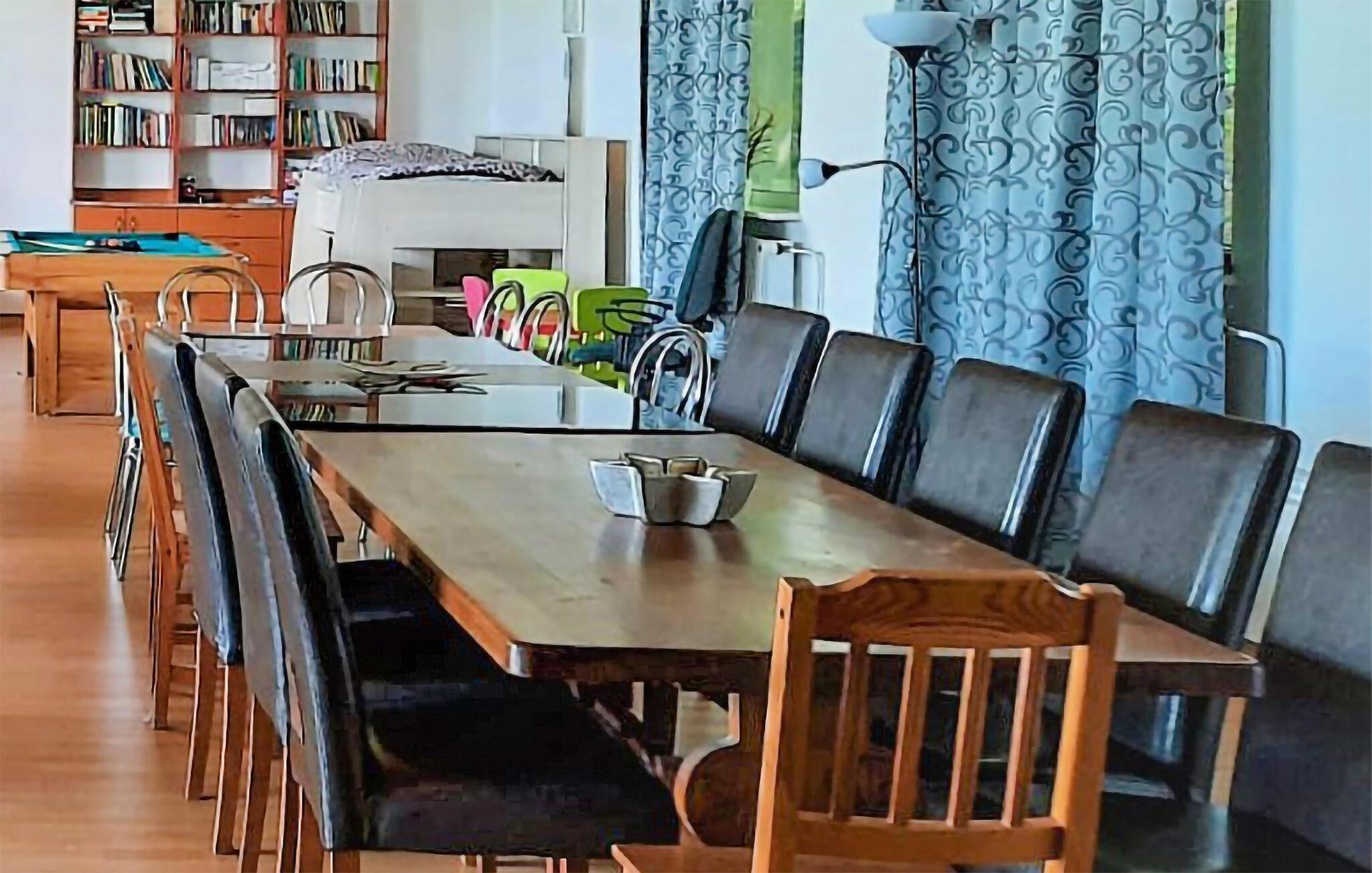 Dieses große Ferienhaus bietet alles, was Sie für einen entspannten Urlaub mit Ihrer Familie oder Freunden benötigen. Der offene Wohnraum mit Kamin, mehreren Sofas und einem langen Esstisch schafft eine einladende Atmosphäre für gemeinsame Mahlzeiten oder Spieleabende. Die gut ausgestattete Küche macht das Zubereiten Ihrer Lieblingsgerichte zum Vergnügen.