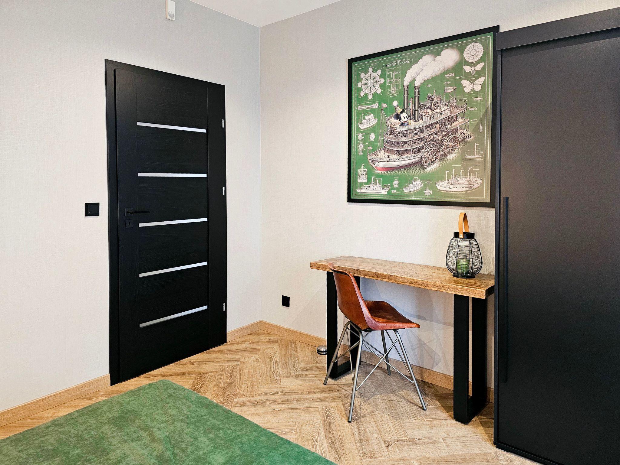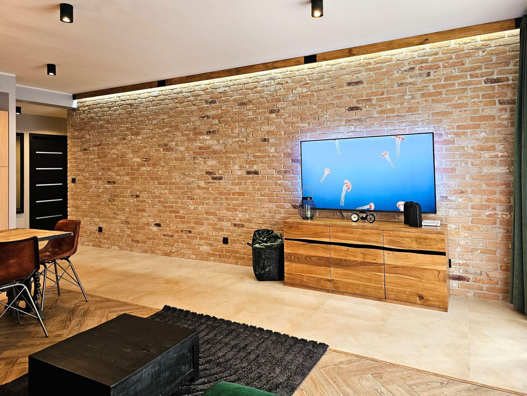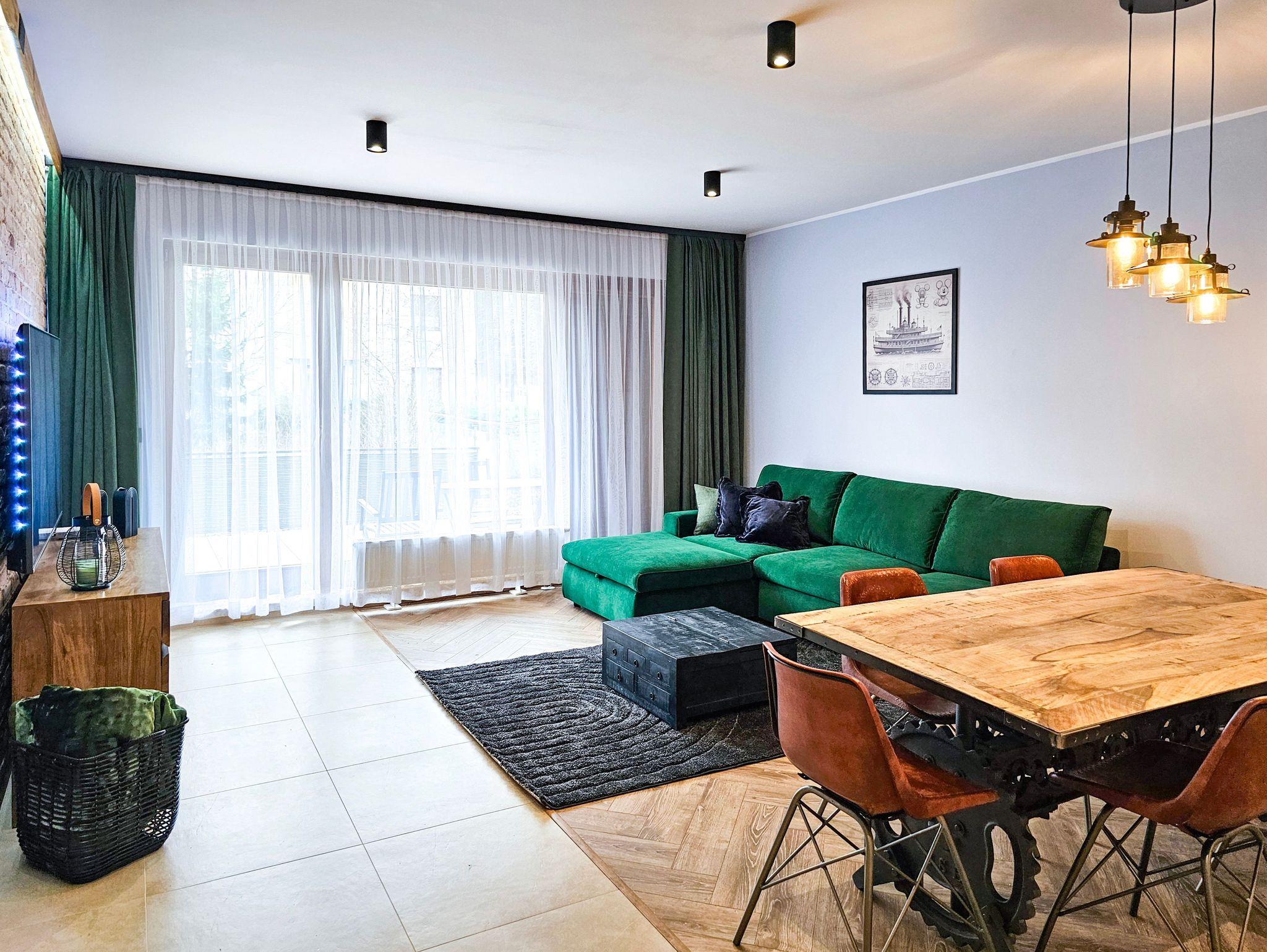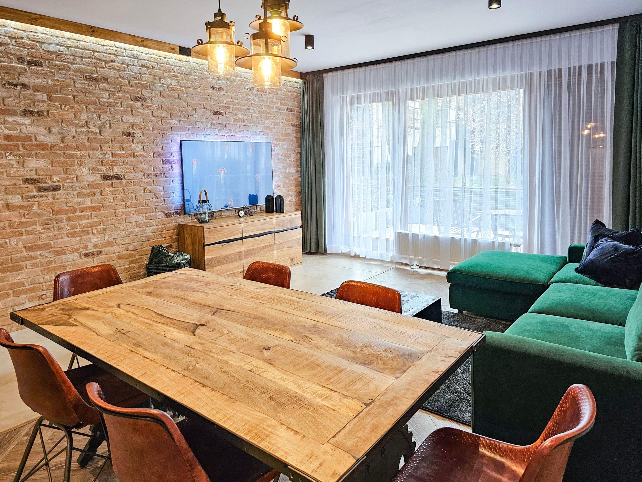Das Wohnzimmer besteht aus einem ausklappbaren Ecksofa (Fläche nach dem Ausklappen 140x200cm), welches man ebenfalls zum Schlafen nutzen kann, einem Couchtisch, einem Esstisch mit 6 Stühlen und einem Fernseher, der den Empfang polnischer und deutscher Sender ermöglicht.