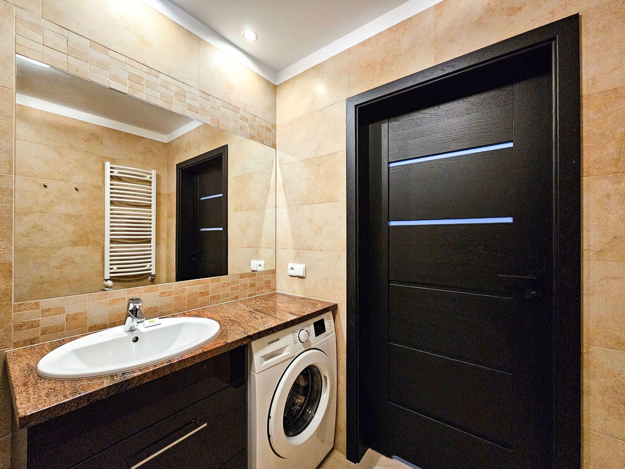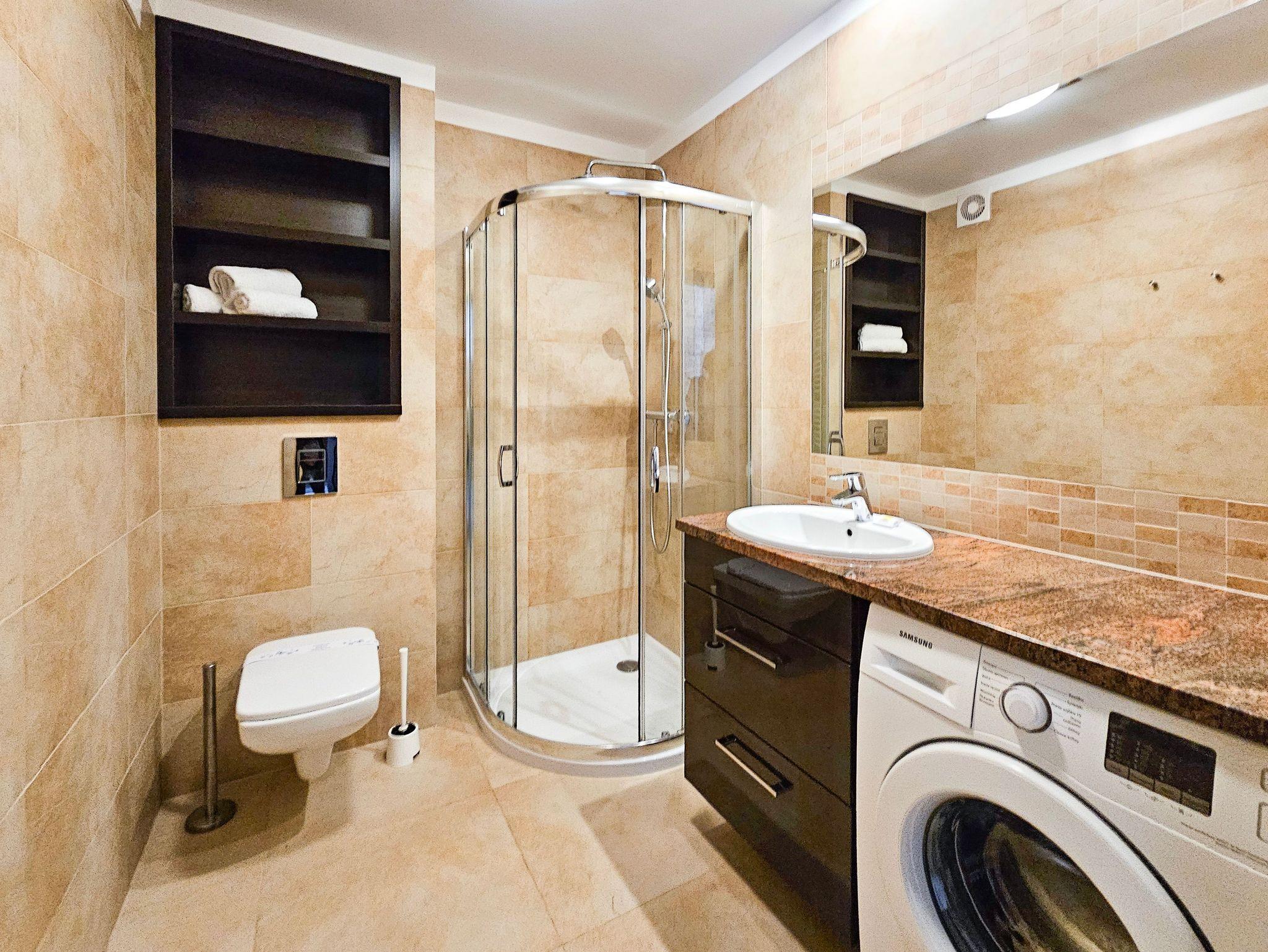 Im Badezimmer befindet sich eine Dusche, ein Waschbecken, eine Toilette und Waschmaschine.