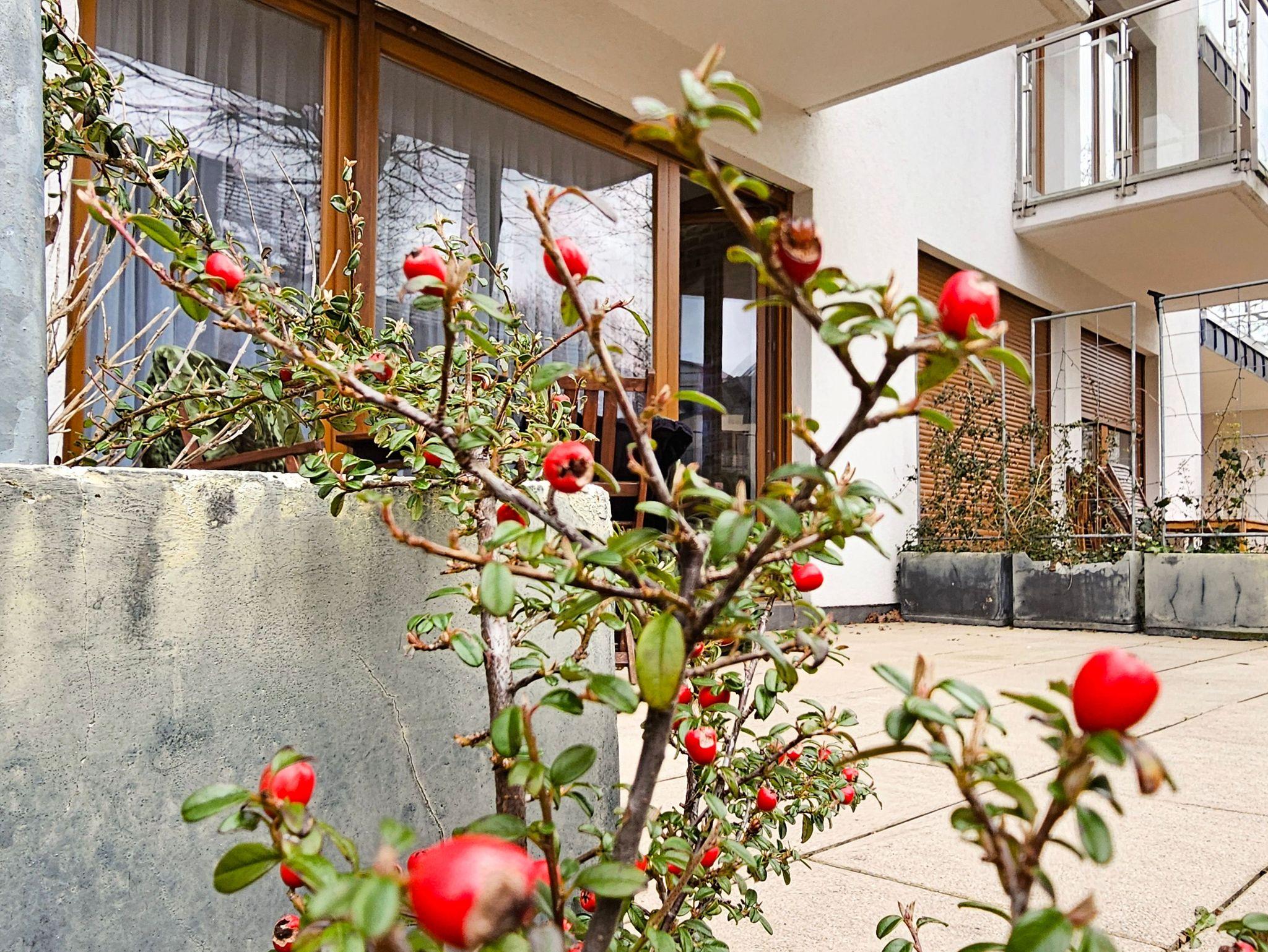 Die Fenster des Wohnzimmers und der Terrasse sind nach Süden zum Innenhof ausgerichtet.
