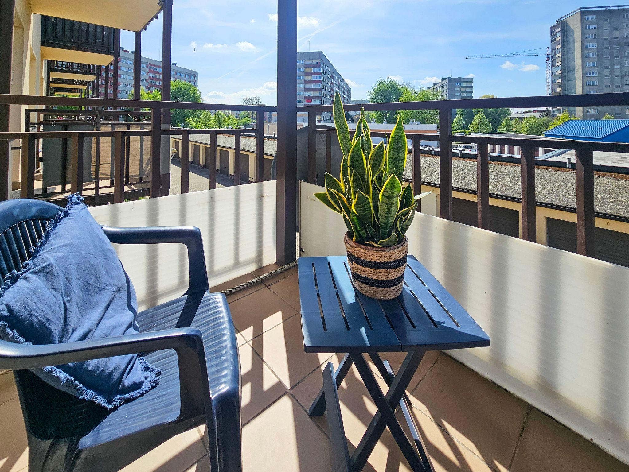 Ausgang vom Wohnzimmer auf den sonnigen Balkon mit 2 Stühlen und einem Tisch.