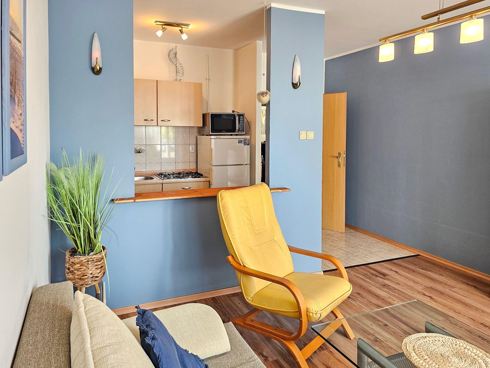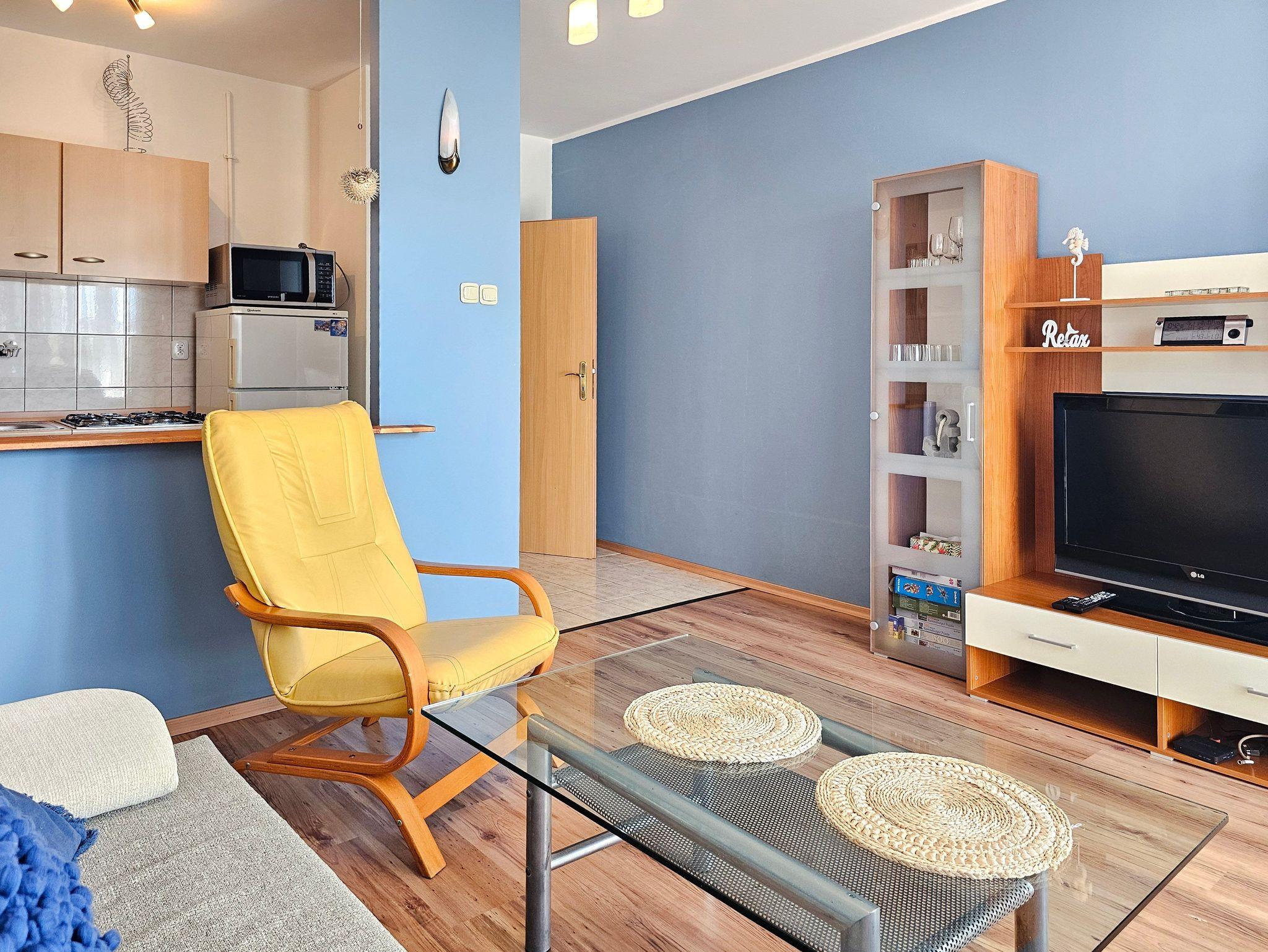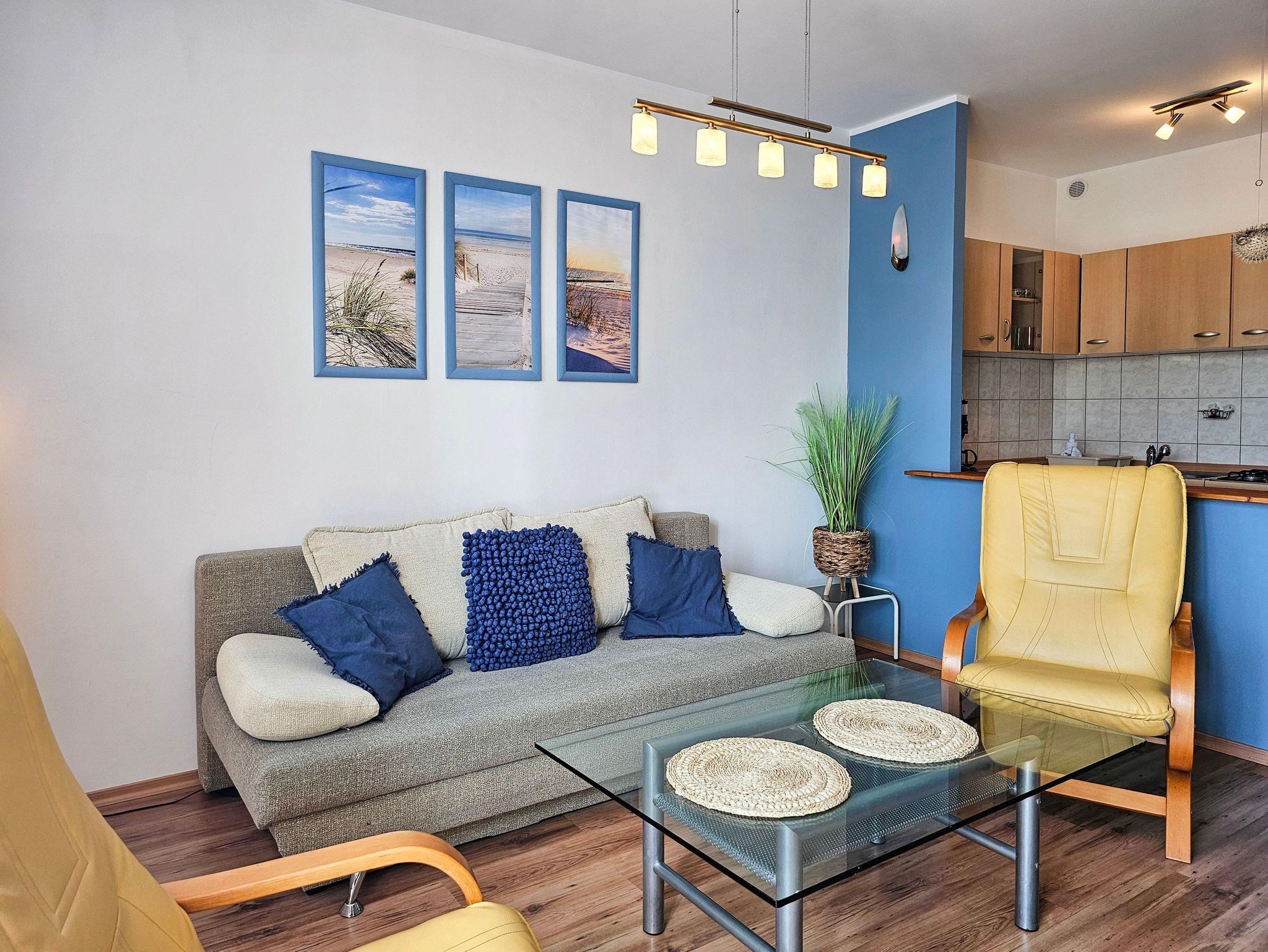 Wohnzimmer mit einem Schlafsofa (140x200cm), 2 Sesseln, TV-Ecke mit polnischem und deutschem TV, offene Küchenecke mit 4-Flammen-Gasherd, Kühlschrank mit Gefrierfach, Mikrowelle, Kaffeemaschine, Toaster, Geschirr, Besteck und Töpfe, die für die Zubereitung von Mahlzeiten notwendig sind.