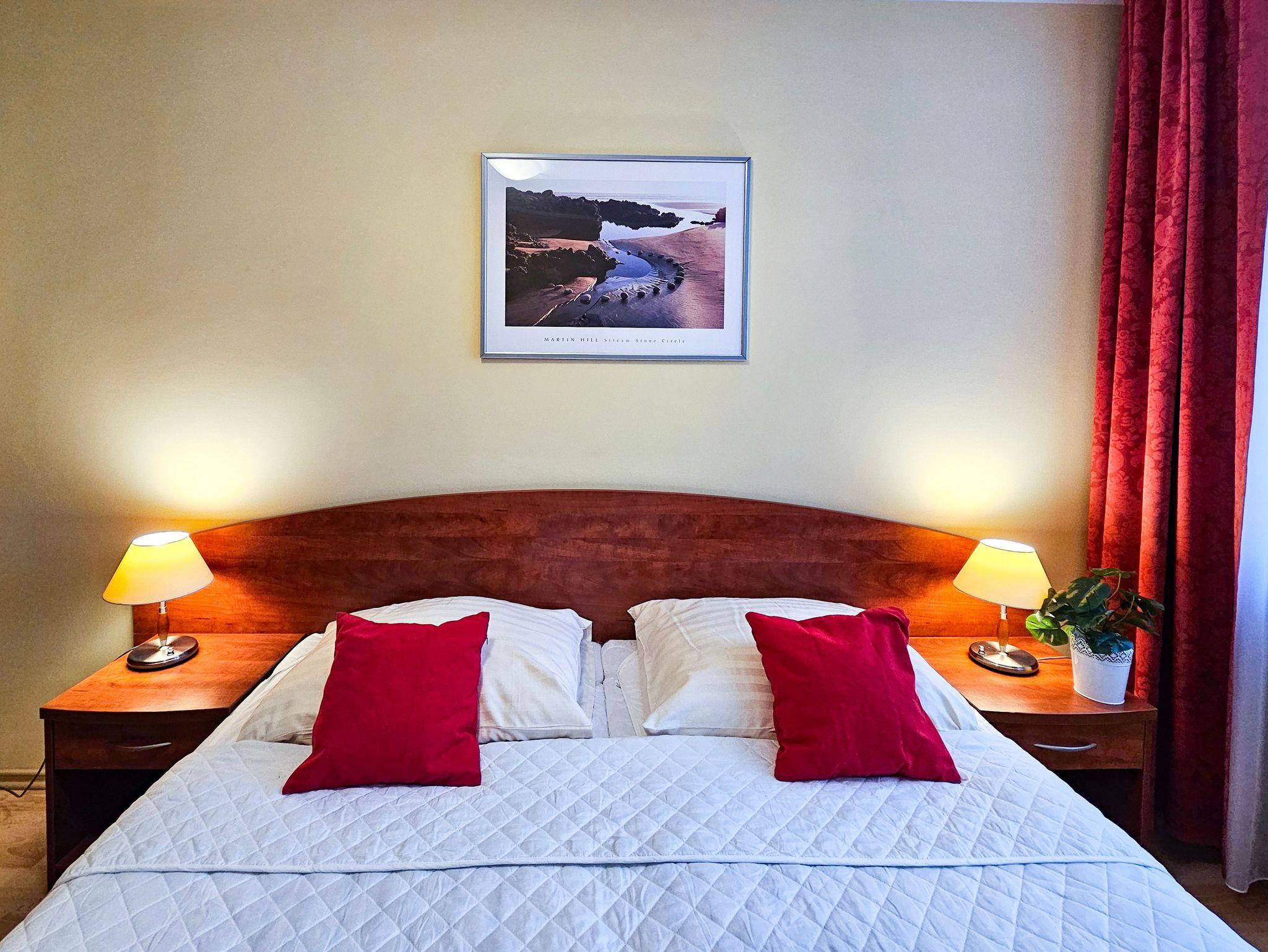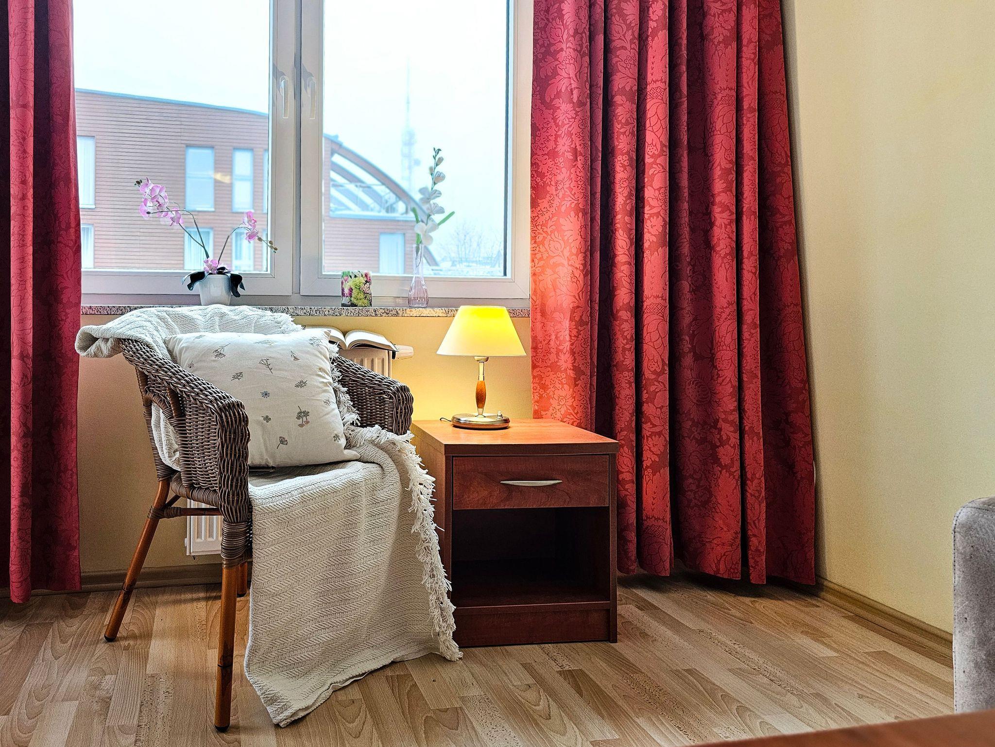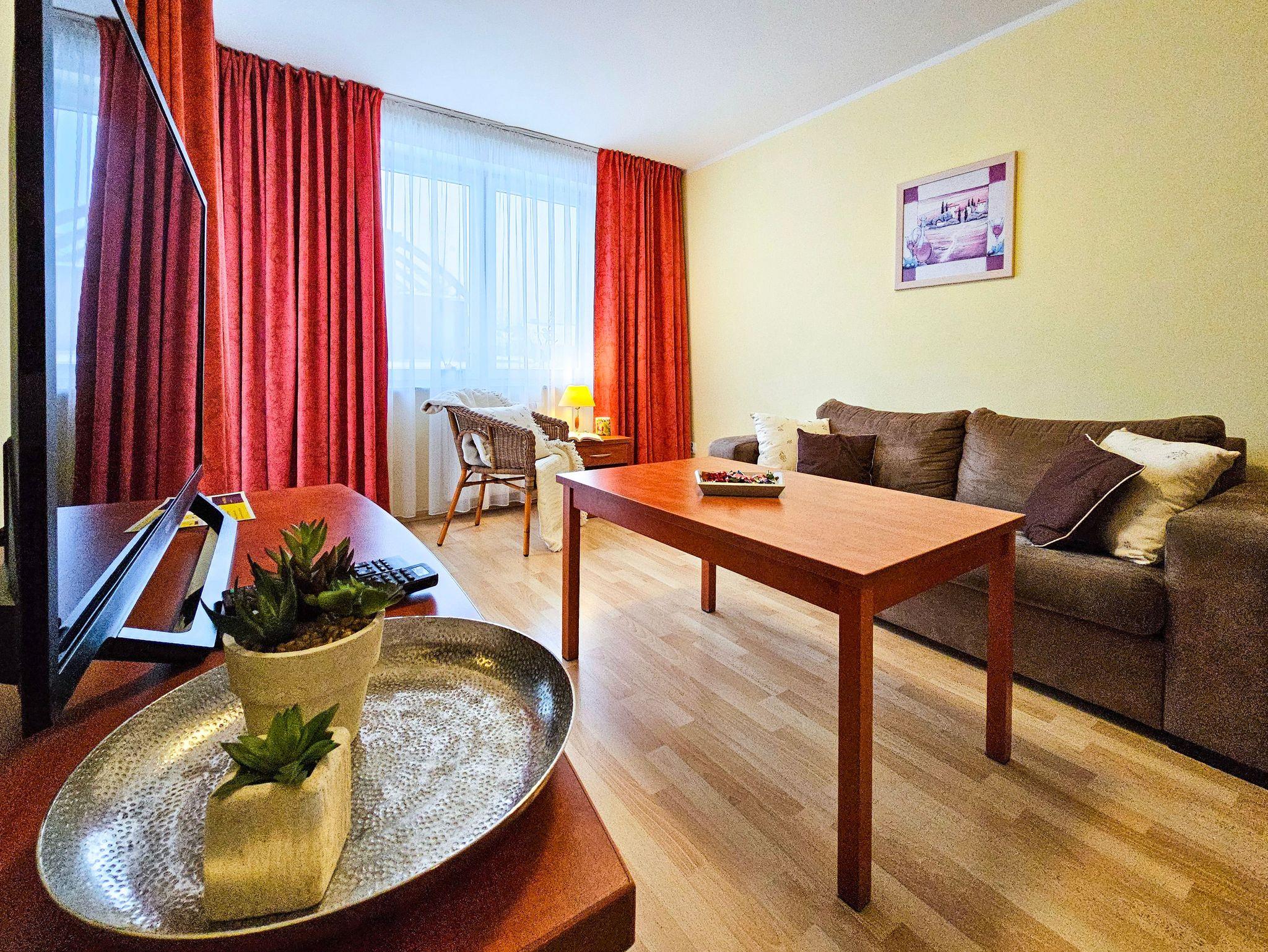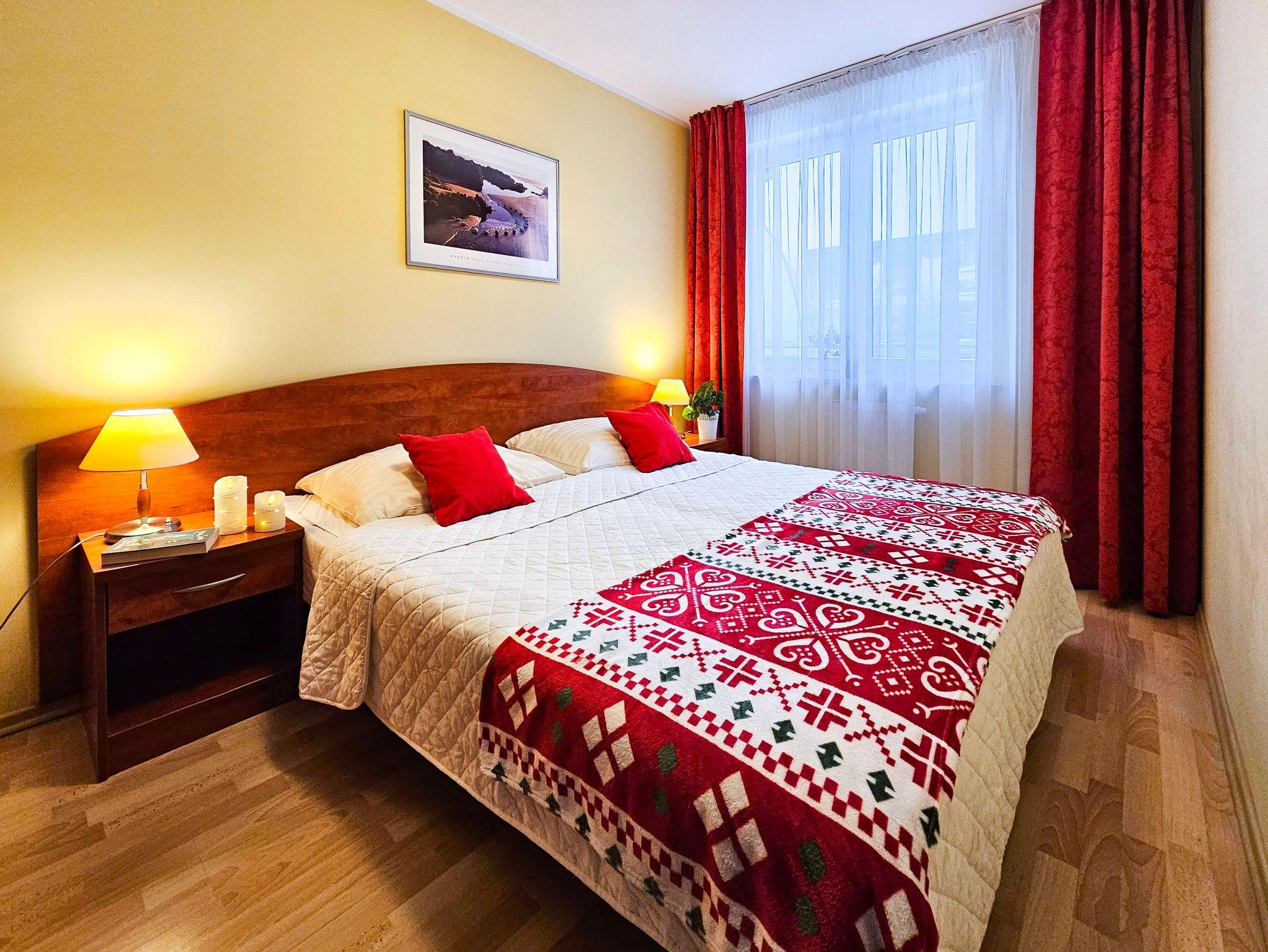 Schlafzimmer mit einem Doppelbett (160x200cm), Nachttischen, einem Kleiderschrank. Wohnzimmer mit Balkon und einem Tisch mit vier Stühlen. Die Wohnung hat der Balkon. Die Fenster und Balkon nach Nord ausgerichtet sind. Badezimmer mit Dusche, WC und Waschbecken.