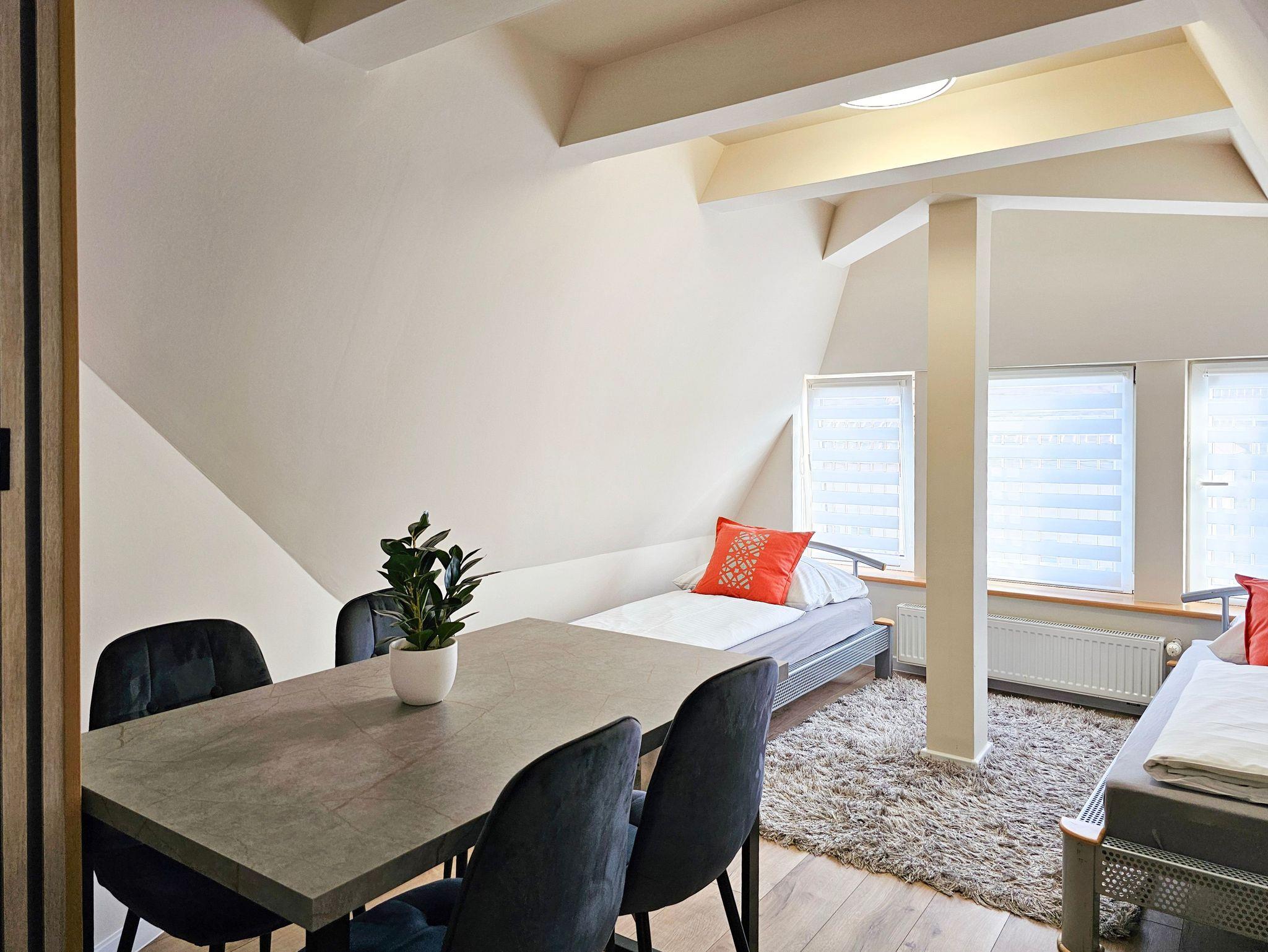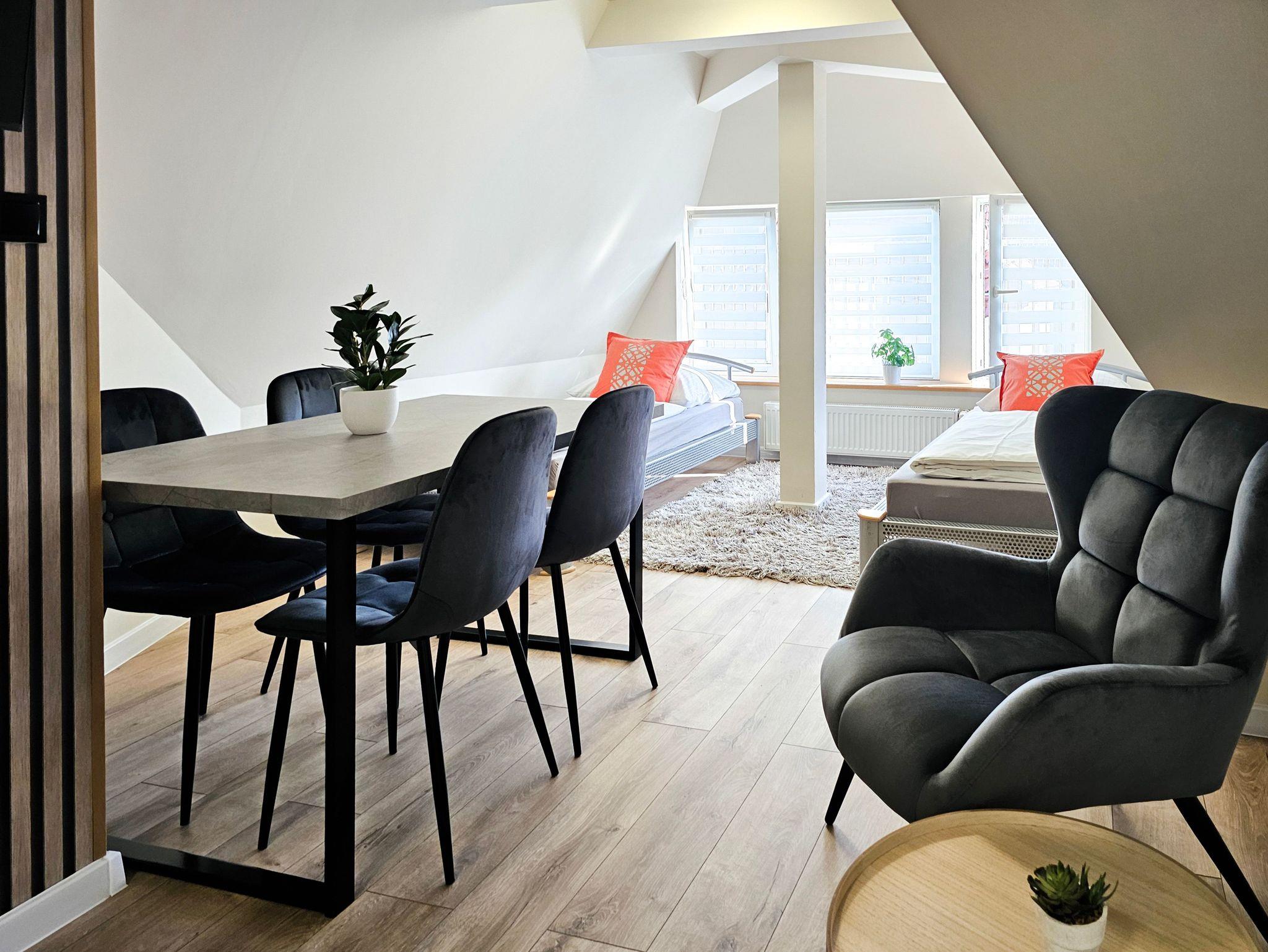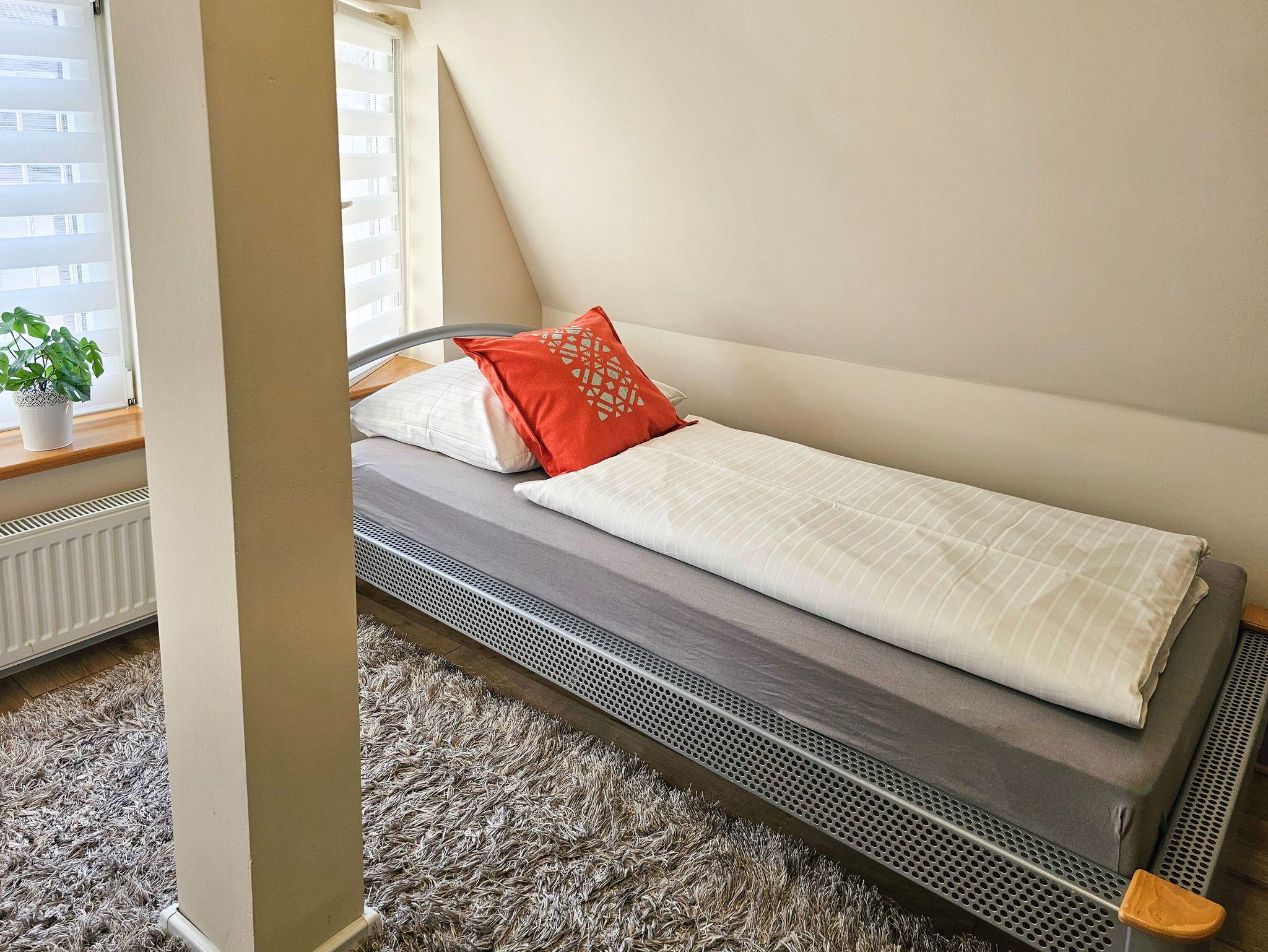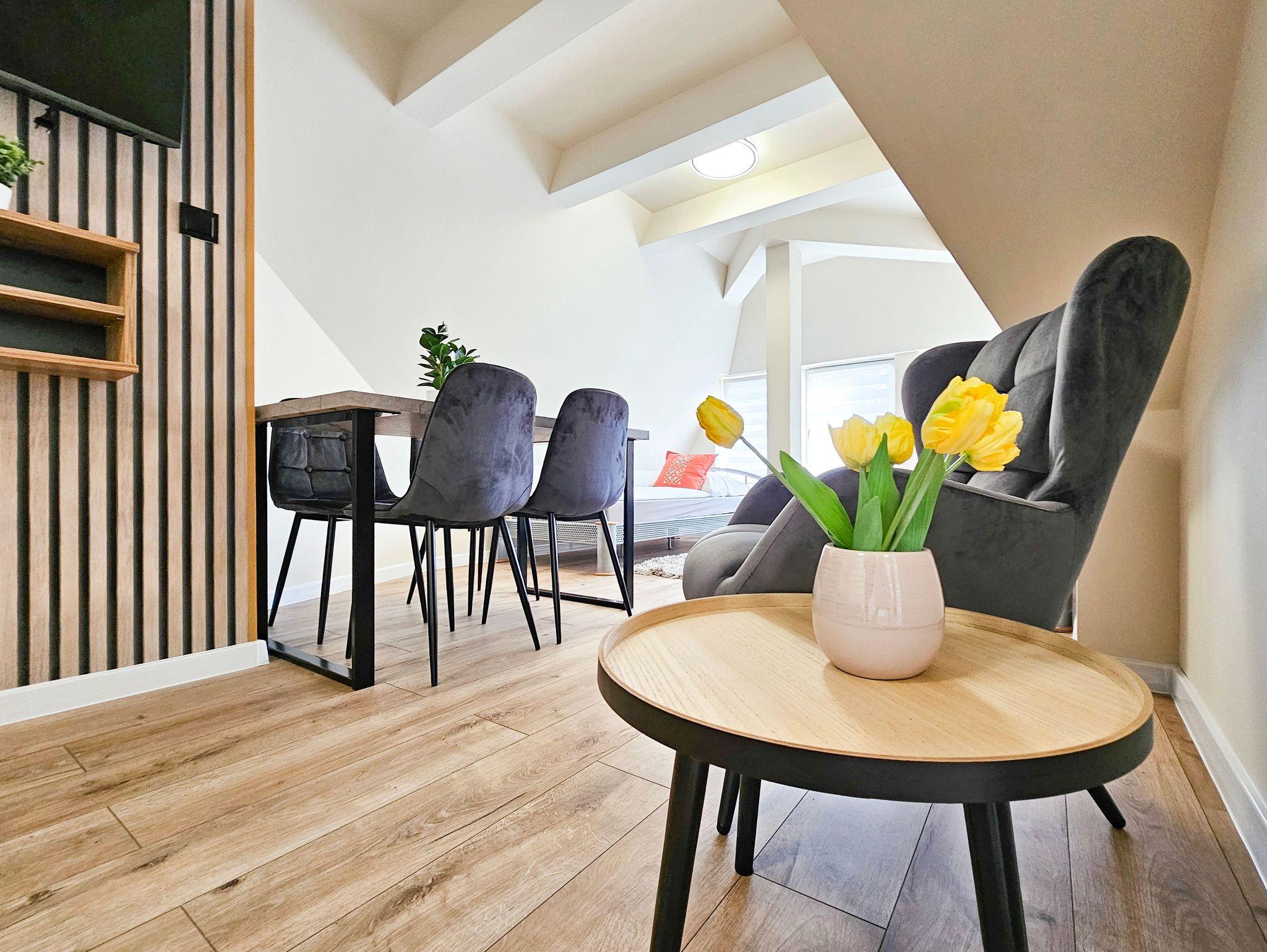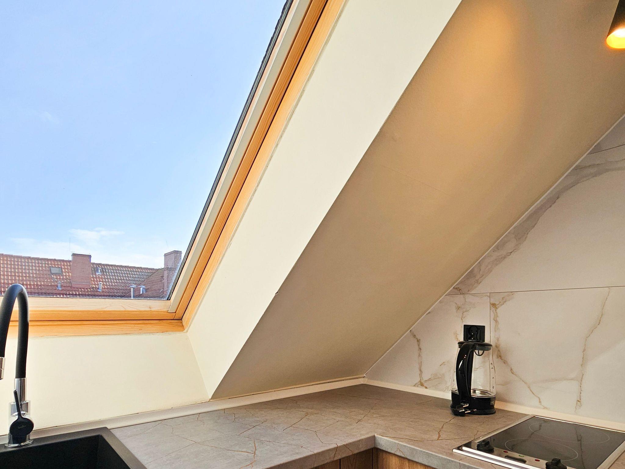 Das Studio befindet sich im 4. Stock (Dachgeschoss) eines mit einem Fahrstuhl ausgestatteten Gebäudes. Der Fahrstuhl fährt bis zum dritten Stock, für die eine Etage muss man die Treppe nutzen, um zu der Wohnung zu gelangen. Sie hat eine Fläche von ca. 35m2, ein Teil dieser ist mit Schrägen gefüllt. Die Wohnung ist für den Aufenthalt von 1-4 Personen vorbereitet. Sie ist mit 2 Einzelbetten mit Matratzen (90x200cm), welche sich an den Schrägen befinden, ausgestattet, ebenfalls mit einem Doppelbett (140x200), Esstisch mit Stühlen, einem Einbauschrank, einem Fernseher und einer kleinen Küchenzeile, sowie einem Badezimmer mit Dusche und WC. Die Fenster vom Zimmer, Küche und Bad sind nach Osten gerichtet. Die Küche und das Bad haben Dachfenster mit Jalousien. Die Küchenausstattung umfasst einen Unterbaukühlschrank, Wasserkocher, notwendiges Geschirr und Besteck, sowie eine Klimaanlage. WLAN ist verfügbar. Der Parkplatz ist nicht garantiert. Das Auto kann man auf der Straße parken, gebührenpflichtig (ganzjährig kostenpflichtige Parkzone). Ein bewachter, kostenpflichtiger Parkplatz ist etwa 350m von der Wohnung entfernt. Haustiere sind nicht erlaubt.