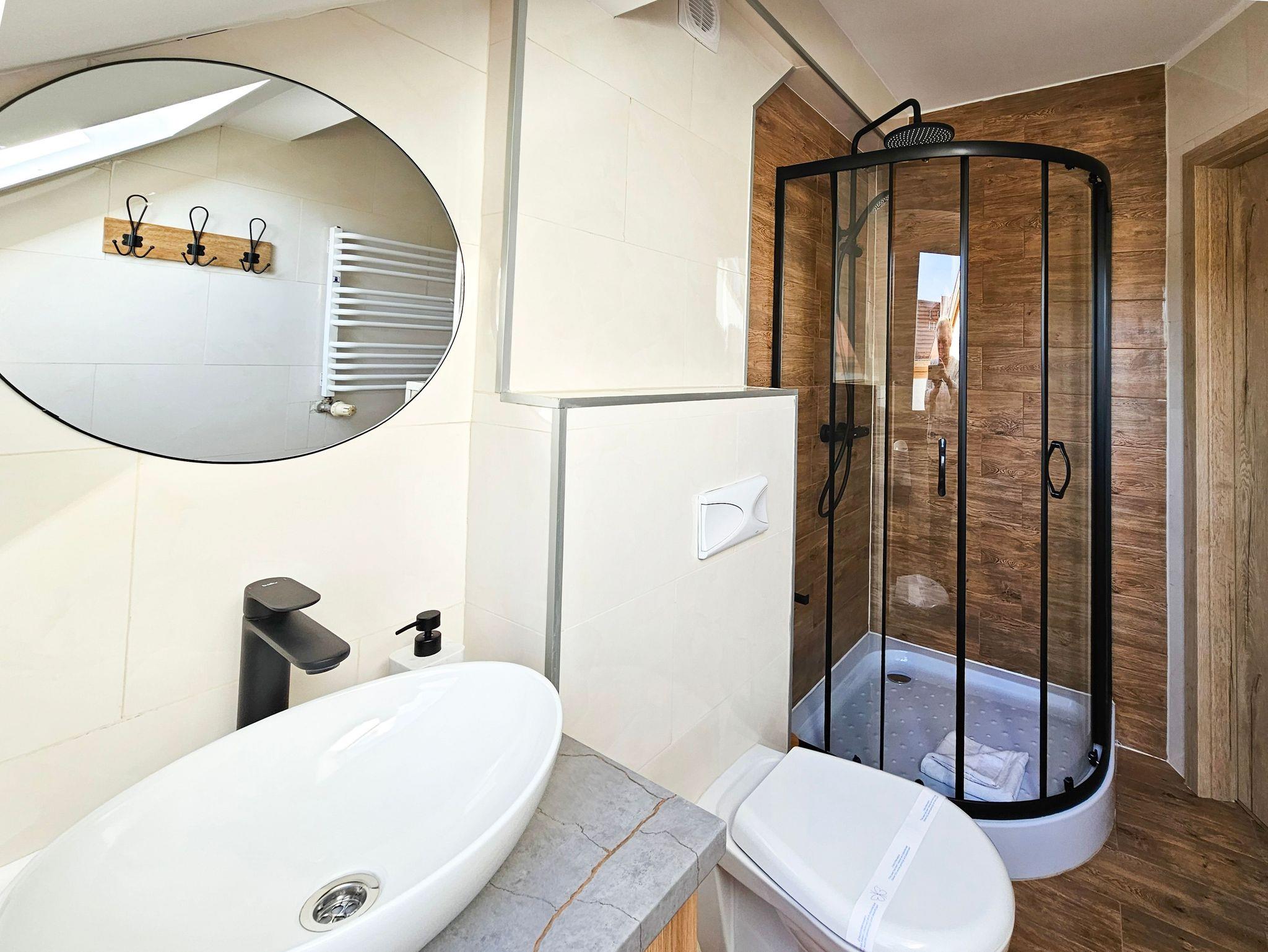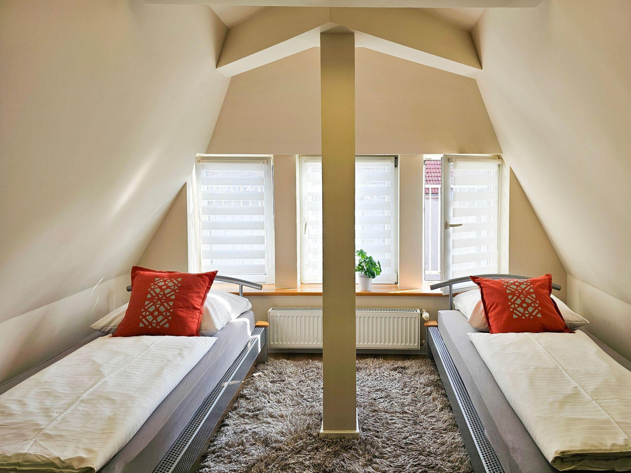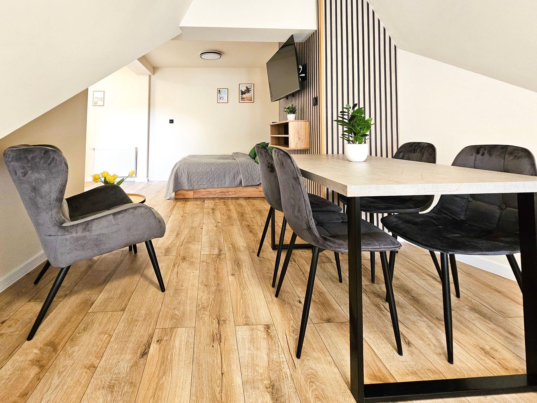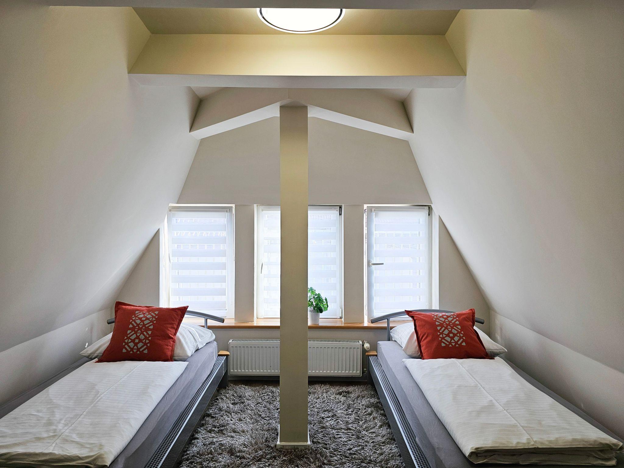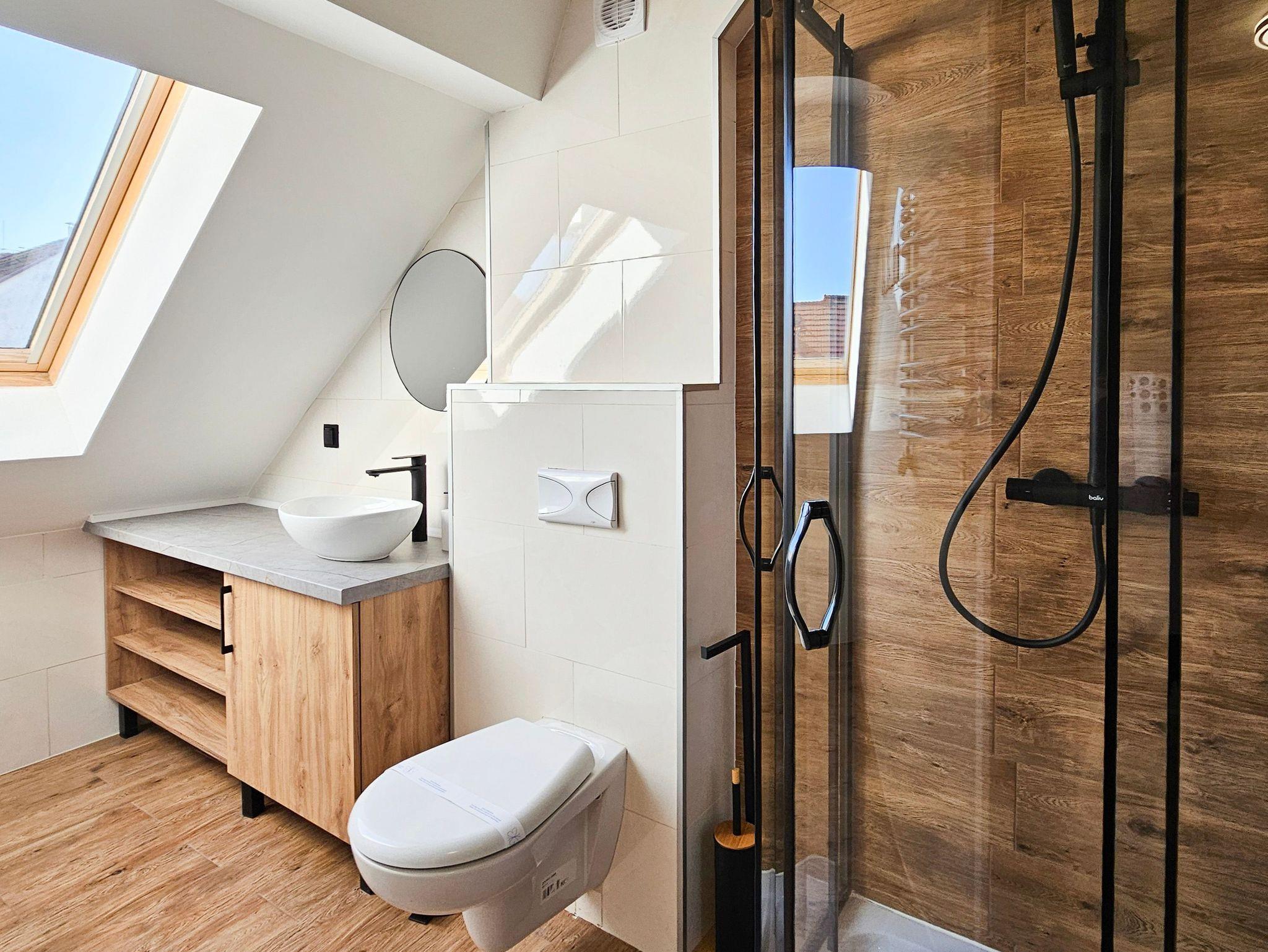 Das Studio befindet sich im 4. Stock (Dachgeschoss) eines mit einem Fahrstuhl ausgestatteten Gebäudes. Der Fahrstuhl fährt bis zum dritten Stock, für die eine Etage muss man die Treppe nutzen, um zu der Wohnung zu gelangen. Sie hat eine Fläche von ca. 35m2, ein Teil dieser ist mit Schrägen gefüllt. Die Wohnung ist für den Aufenthalt von 1-4 Personen vorbereitet. Sie ist mit 2 Einzelbetten mit Matratzen (90x200cm), welche sich an den Schrägen befinden, ausgestattet, ebenfalls mit einem Doppelbett (140x200), Esstisch mit Stühlen, einem Einbauschrank, einem Fernseher und einer kleinen Küchenzeile, sowie einem Badezimmer mit Dusche und WC. Die Fenster vom Zimmer, Küche und Bad sind nach Osten gerichtet. Die Küche und das Bad haben Dachfenster mit Jalousien. Die Küchenausstattung umfasst einen Unterbaukühlschrank, Wasserkocher, notwendiges Geschirr und Besteck, sowie eine Klimaanlage. WLAN ist verfügbar. Der Parkplatz ist nicht garantiert. Das Auto kann man auf der Straße parken, gebührenpflichtig (ganzjährig kostenpflichtige Parkzone). Ein bewachter, kostenpflichtiger Parkplatz ist etwa 350m von der Wohnung entfernt. Haustiere sind nicht erlaubt.