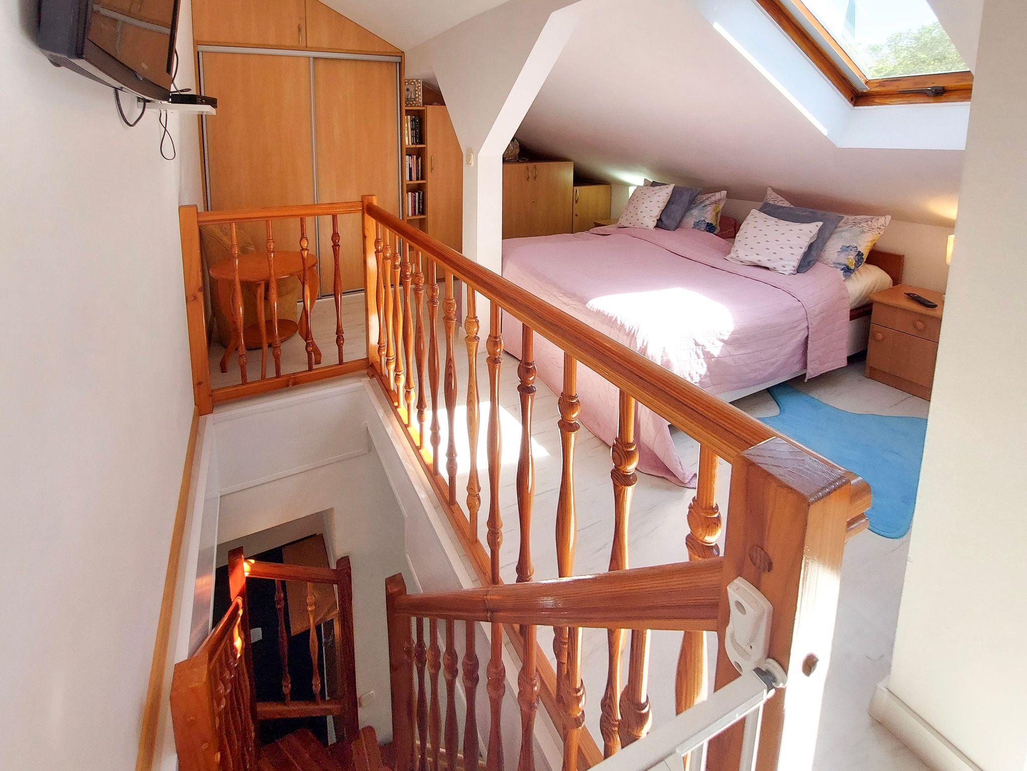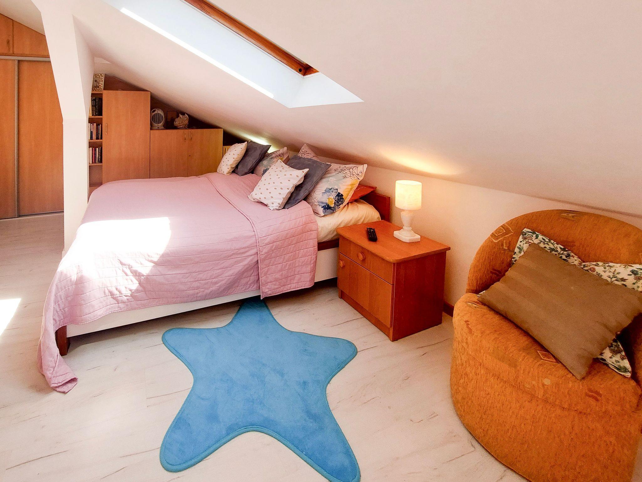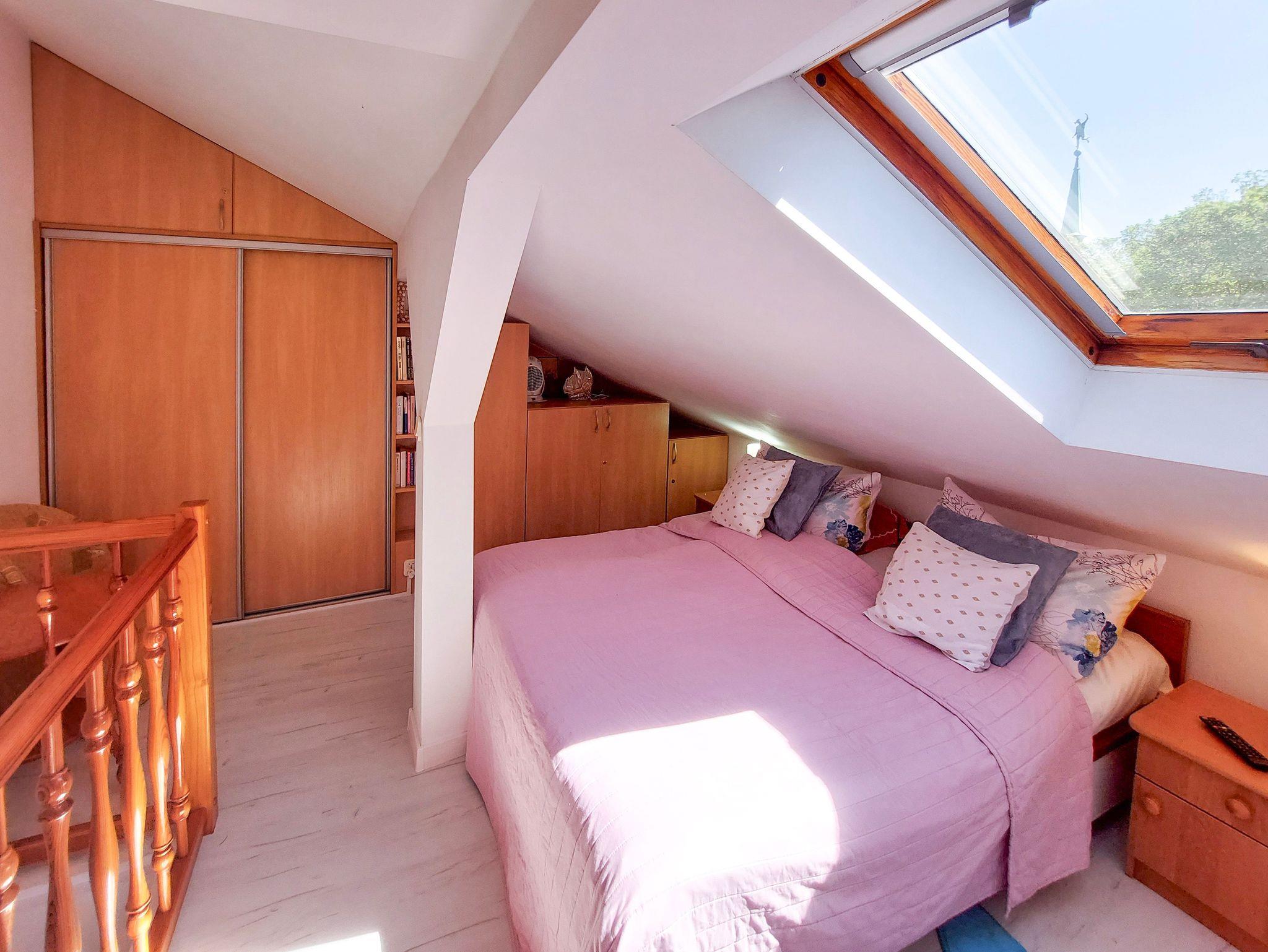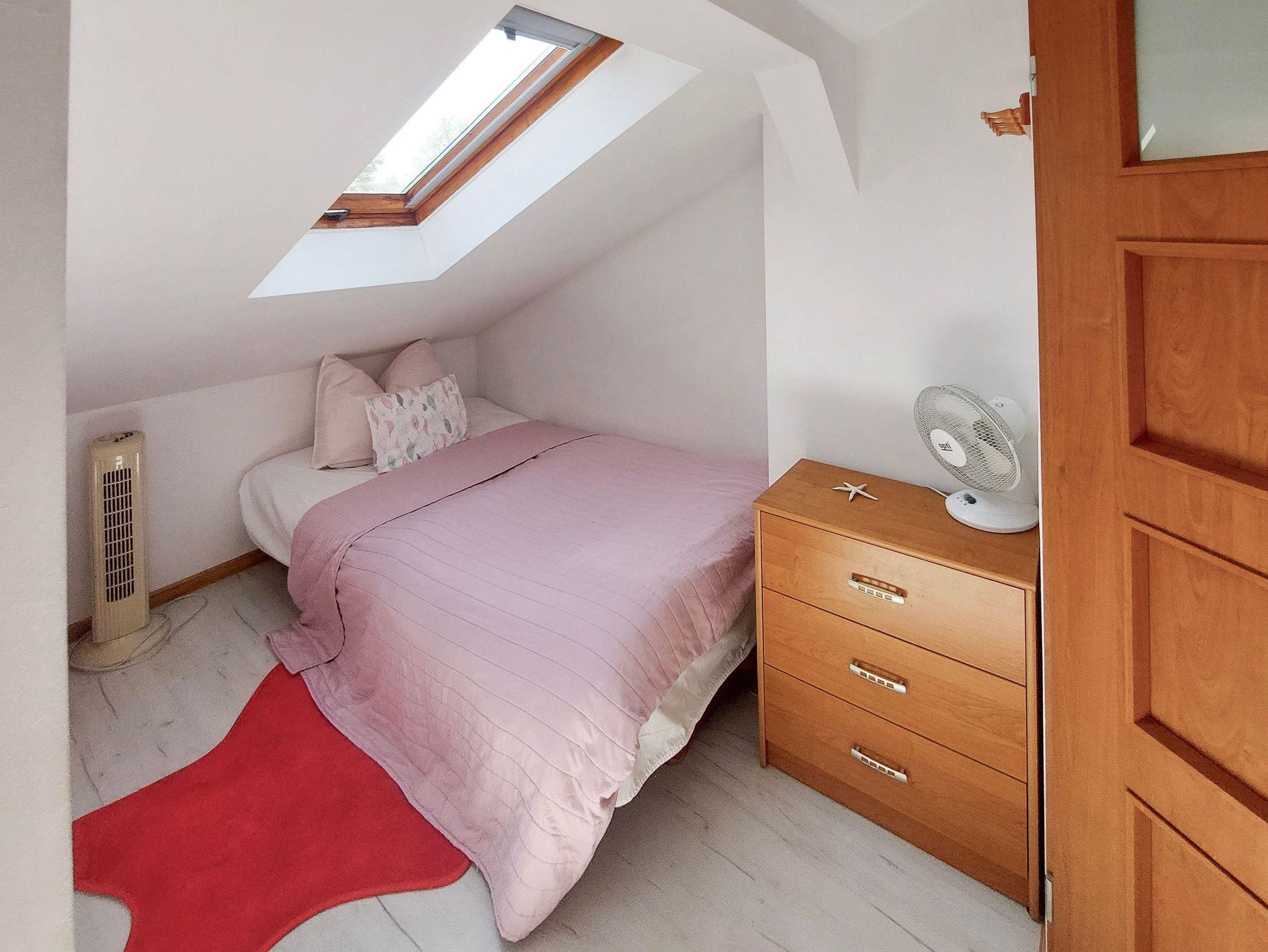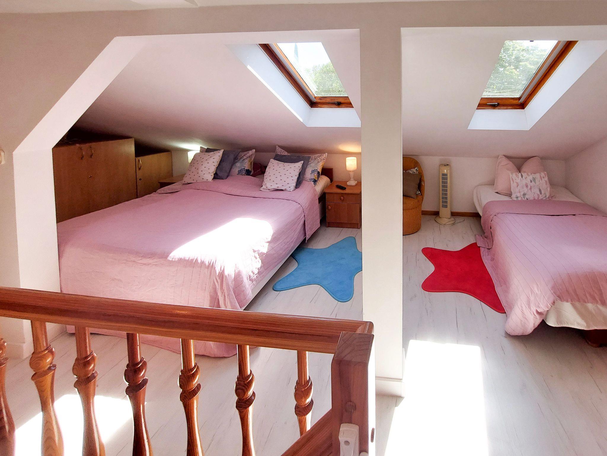 Im Obergeschoss (mit Schrägen) Einbauschrank, Doppelbett 160x200cm und Einzelbett 100x200cm, schräge Fenster, kleine Toilette.