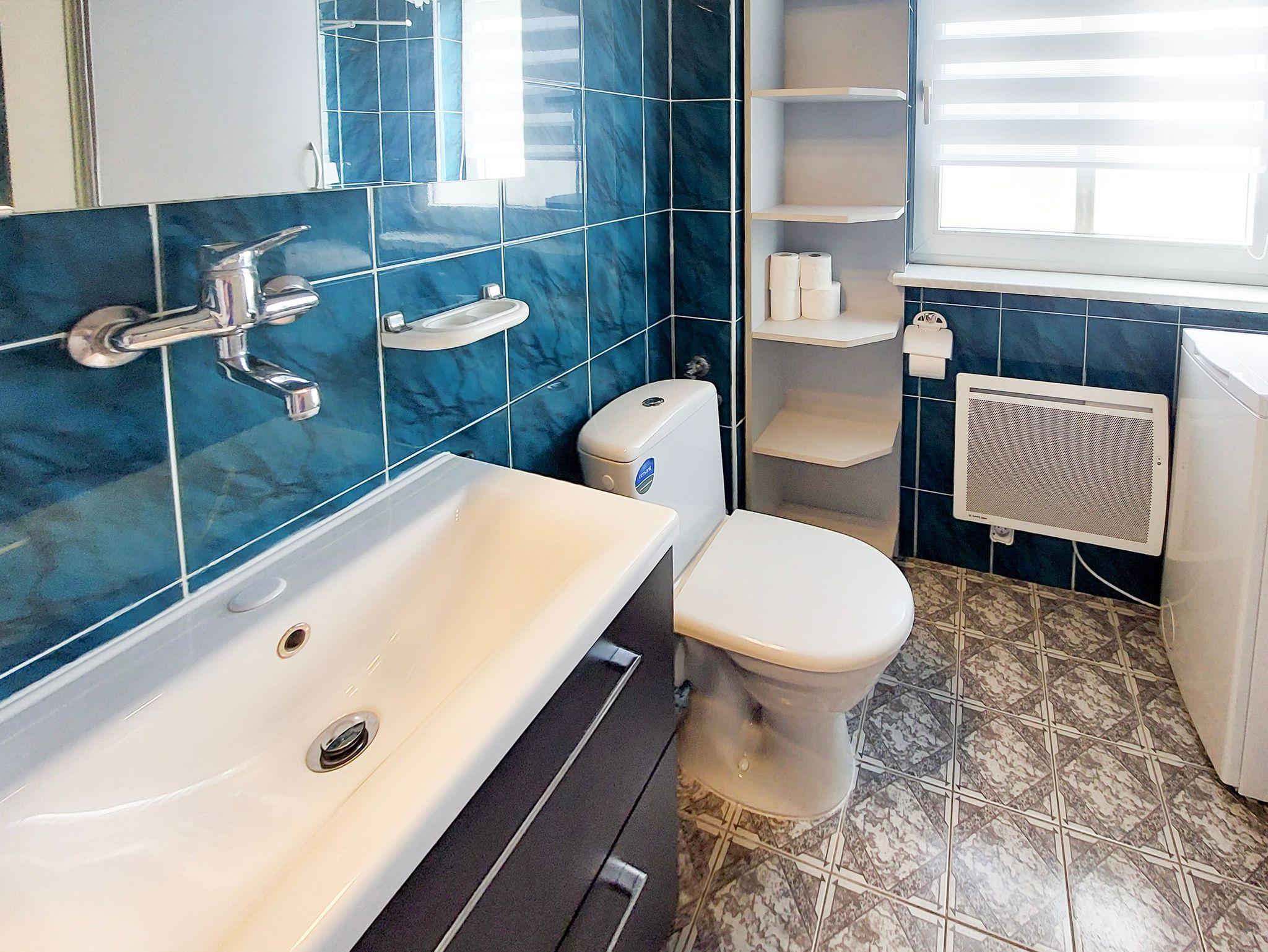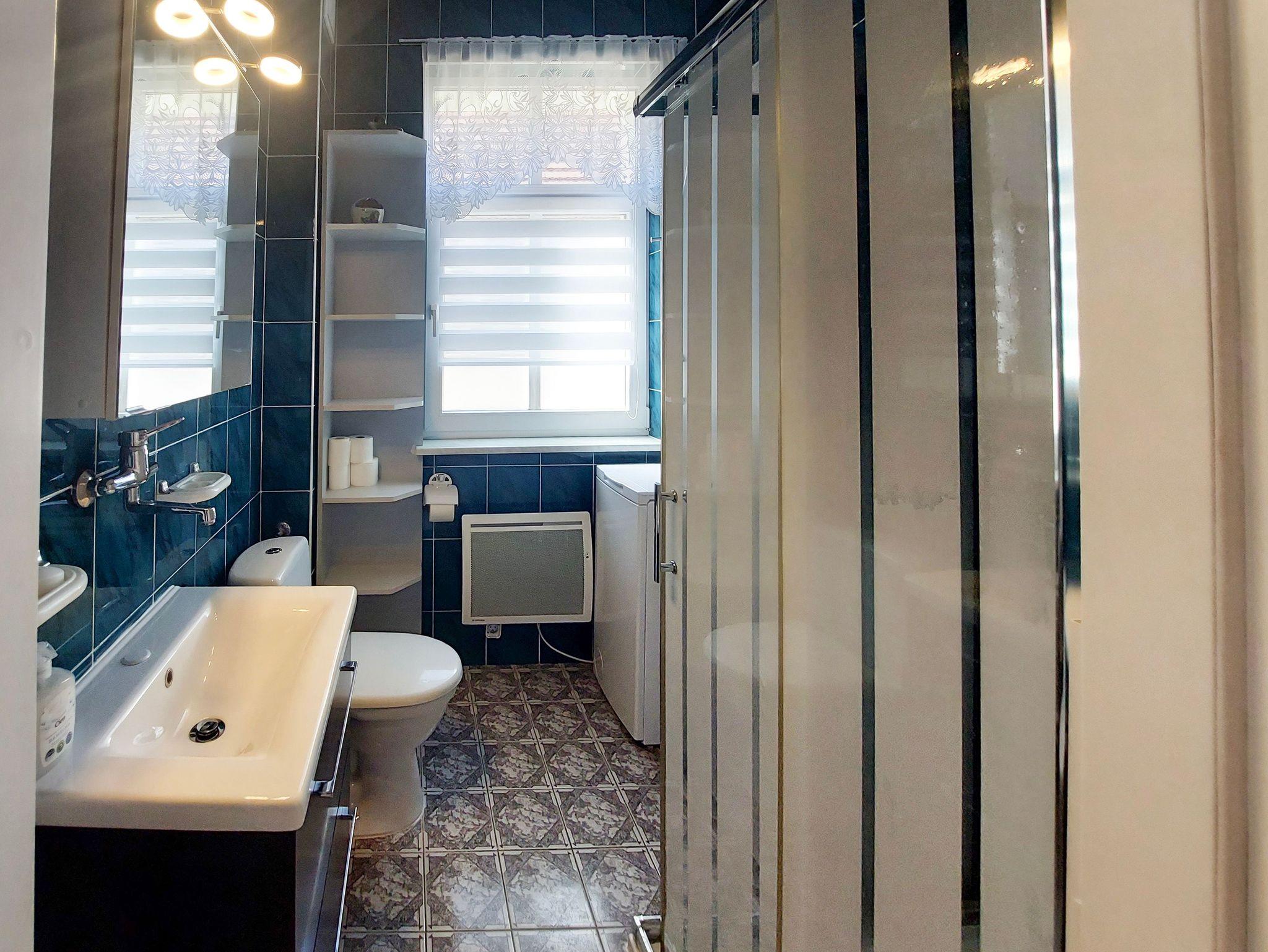 Badezimmer mit Duschkabine, Toilette, Waschmaschine.