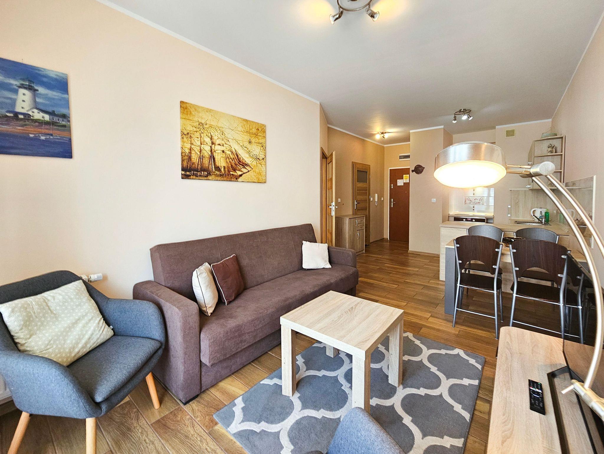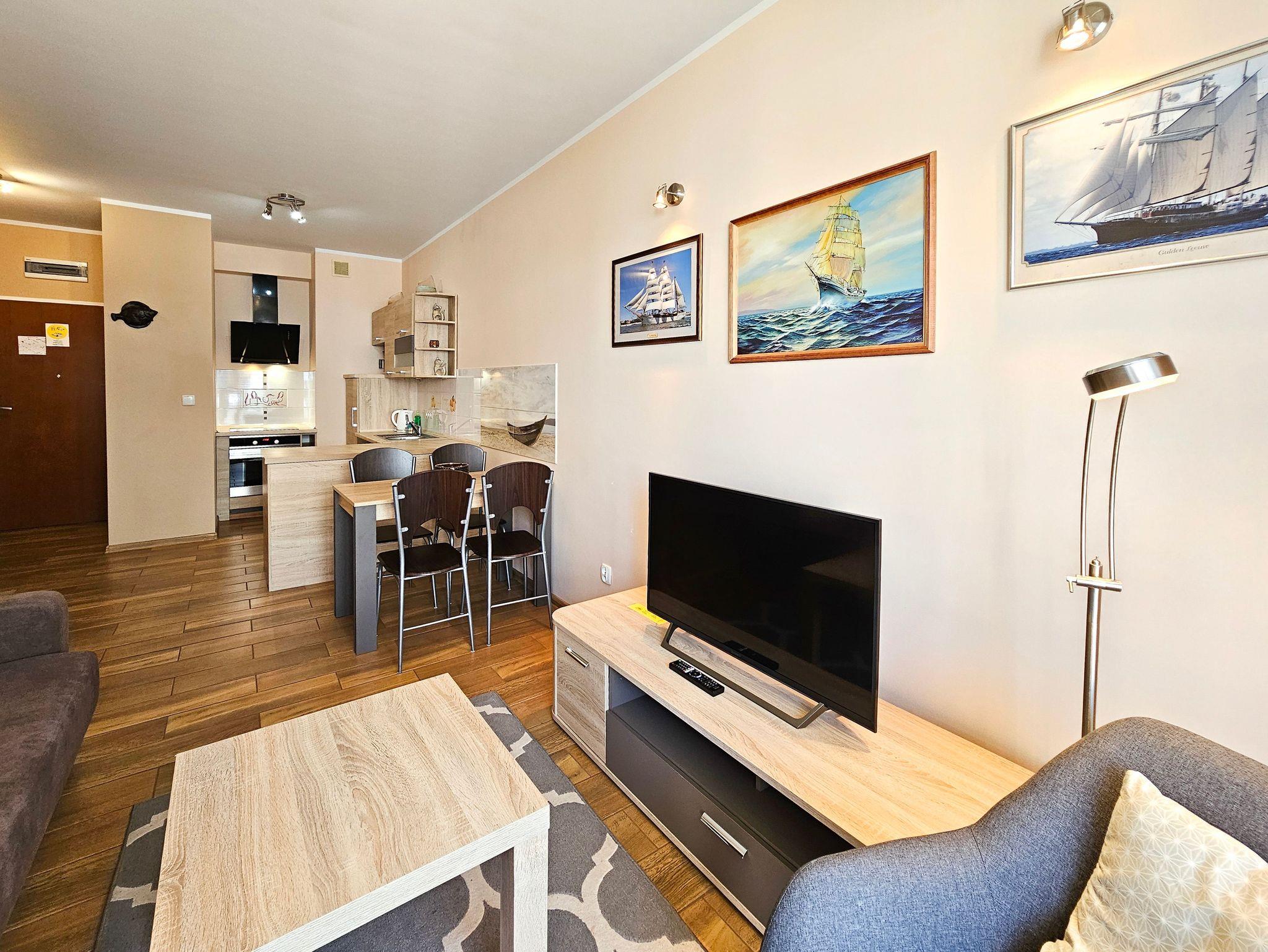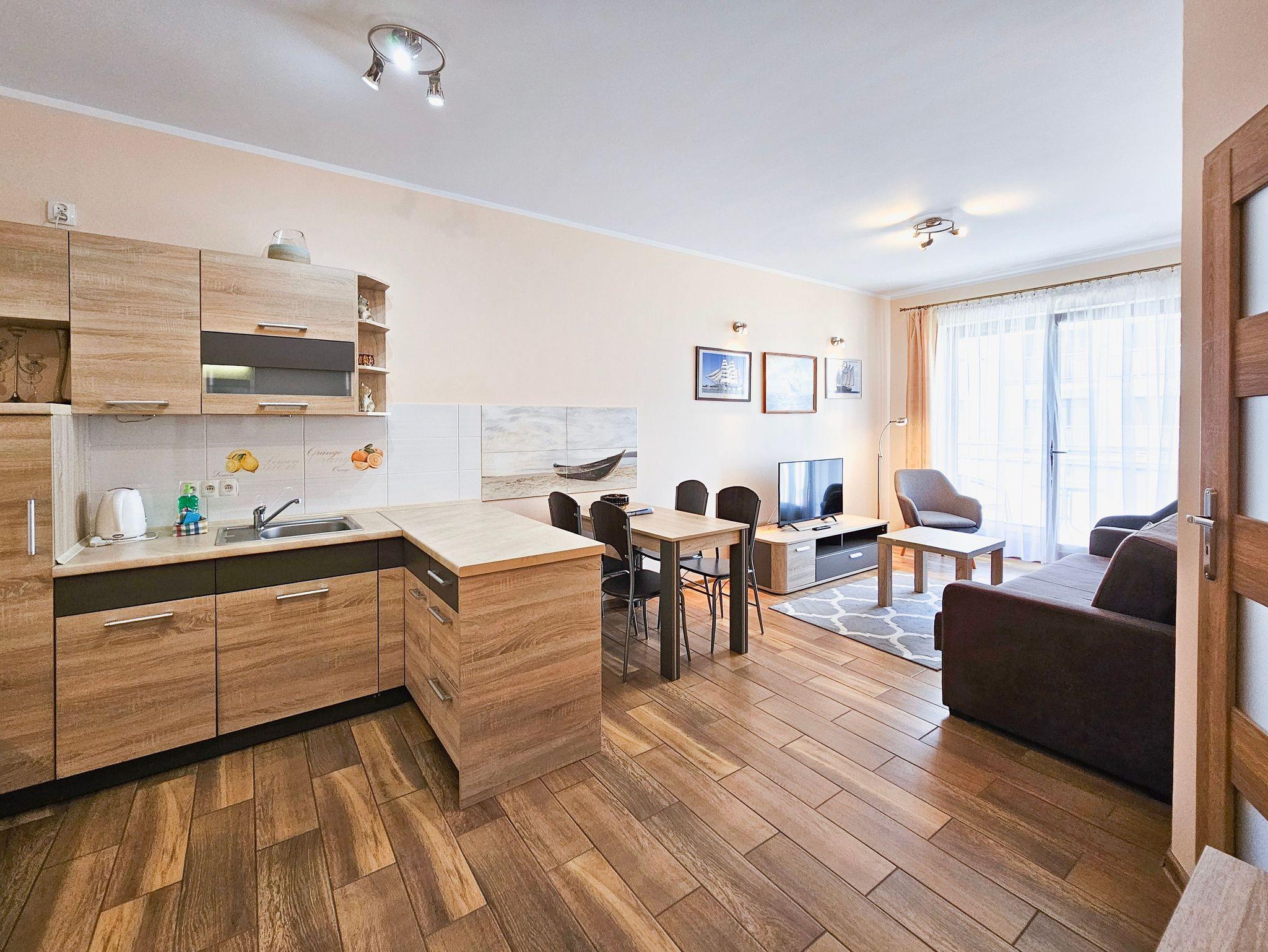 Es besteht aus einem Wohnzimmer mit Küchenzeile, Schlafzimmer, Balkon und Bad mit Dusche und Waschingmaschine. Im Wohnzimmer steht ein gemütliches Schlafsofa für zwei Personen, ein Couchtisch, ein Esstisch mit vier Stühlen und ein Schrank. Im Schlafzimmer befindet sich ein Ehebett. Zwei geräumige Kleiderschränke, eins im Schlafzimmer und der andere im Flur bieten viel Stauraum für die Sachen der Gäste. Die funktionelle, voll ausgestattete Küchenzeile verfügt über einen Kühlschrank mit Gefrierfach, Herd mit Ceranfeld, Backofen, Geschirrspüler, Wasserkocher, Toaster, Kaffeemaschine, Töpfe, Geschirr und Besteck. In der Wohnung ist Kabel-TV. Die Wohnungsfenster und der Balkon sind nach Westen gerichtet. Tiere sing erlaubt.