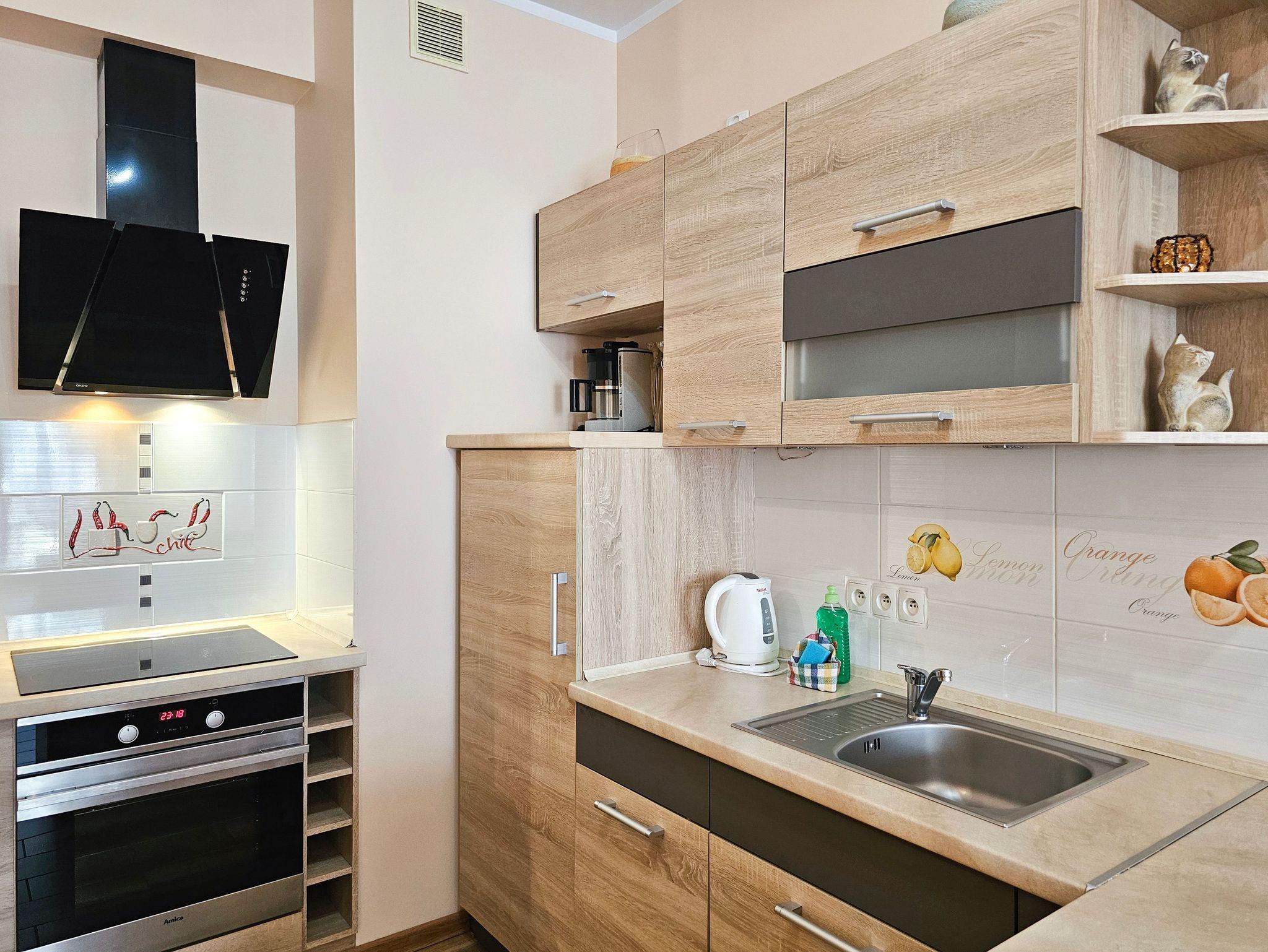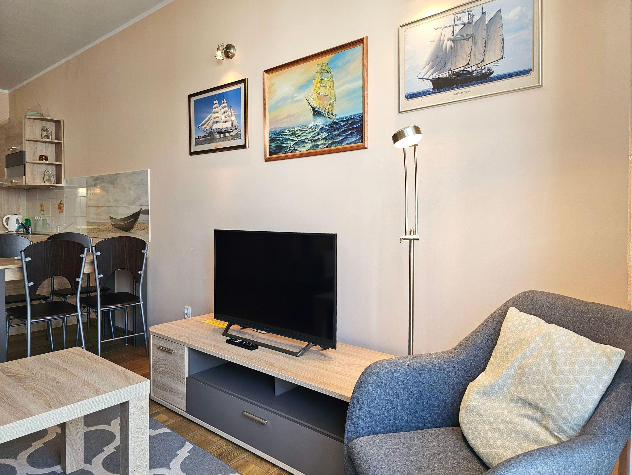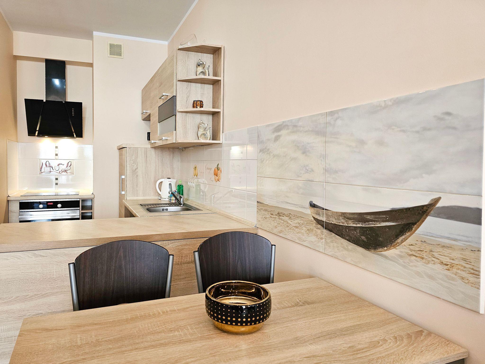 Es besteht aus einem Wohnzimmer mit Küchenzeile, Schlafzimmer, Balkon und Bad mit Dusche und Waschingmaschine. Im Wohnzimmer steht ein gemütliches Schlafsofa für zwei Personen, ein Couchtisch, ein Esstisch mit vier Stühlen und ein Schrank. Im Schlafzimmer befindet sich ein Ehebett. Zwei geräumige Kleiderschränke, eins im Schlafzimmer und der andere im Flur bieten viel Stauraum für die Sachen der Gäste. Die funktionelle, voll ausgestattete Küchenzeile verfügt über einen Kühlschrank mit Gefrierfach, Herd mit Ceranfeld, Backofen, Geschirrspüler, Wasserkocher, Toaster, Kaffeemaschine, Töpfe, Geschirr und Besteck. In der Wohnung ist Kabel-TV. Die Wohnungsfenster und der Balkon sind nach Westen gerichtet. Tiere sing erlaubt.