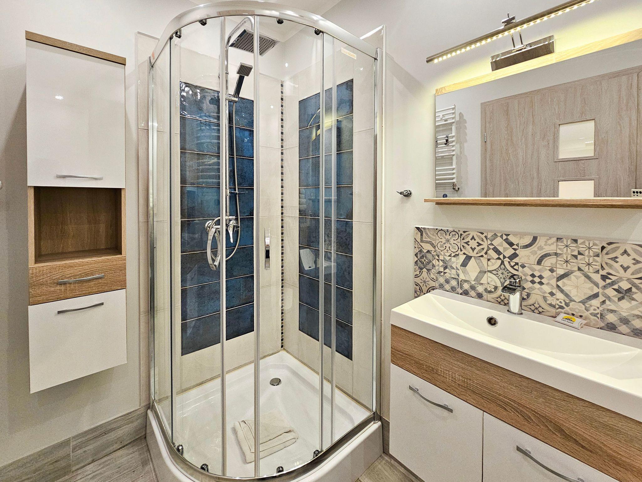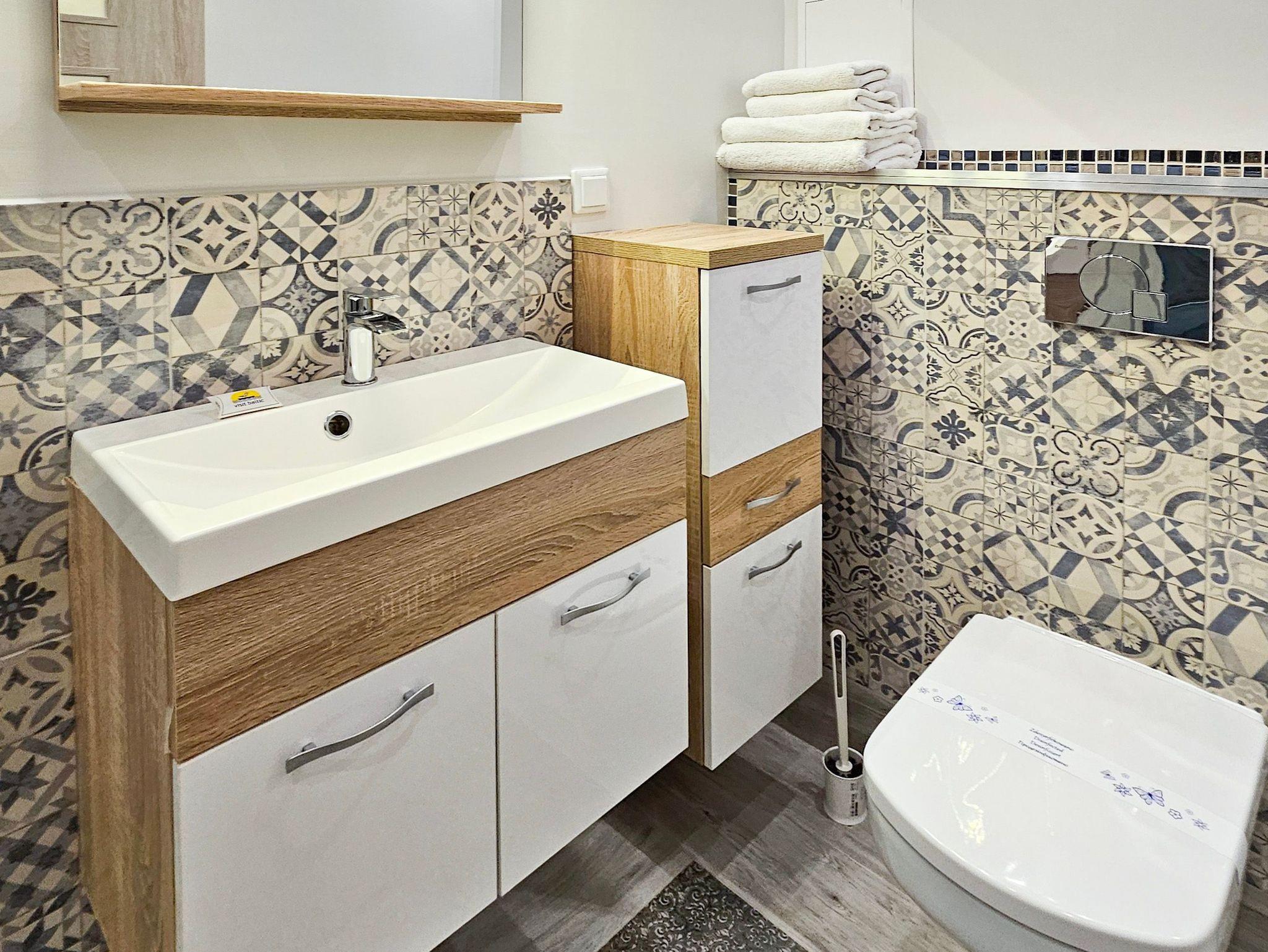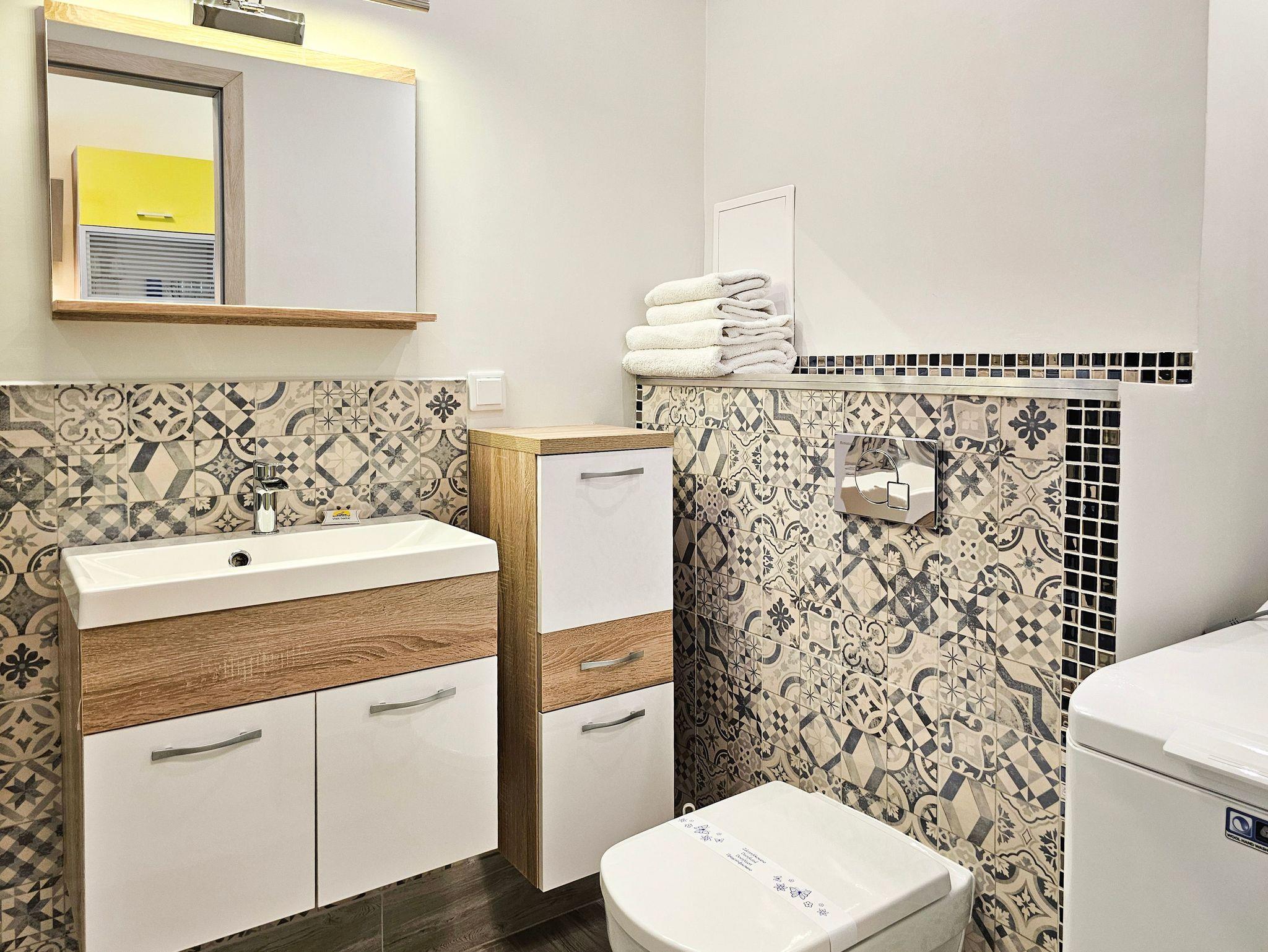 Badezimmer mit WC und Dusche und Waschmaschine.