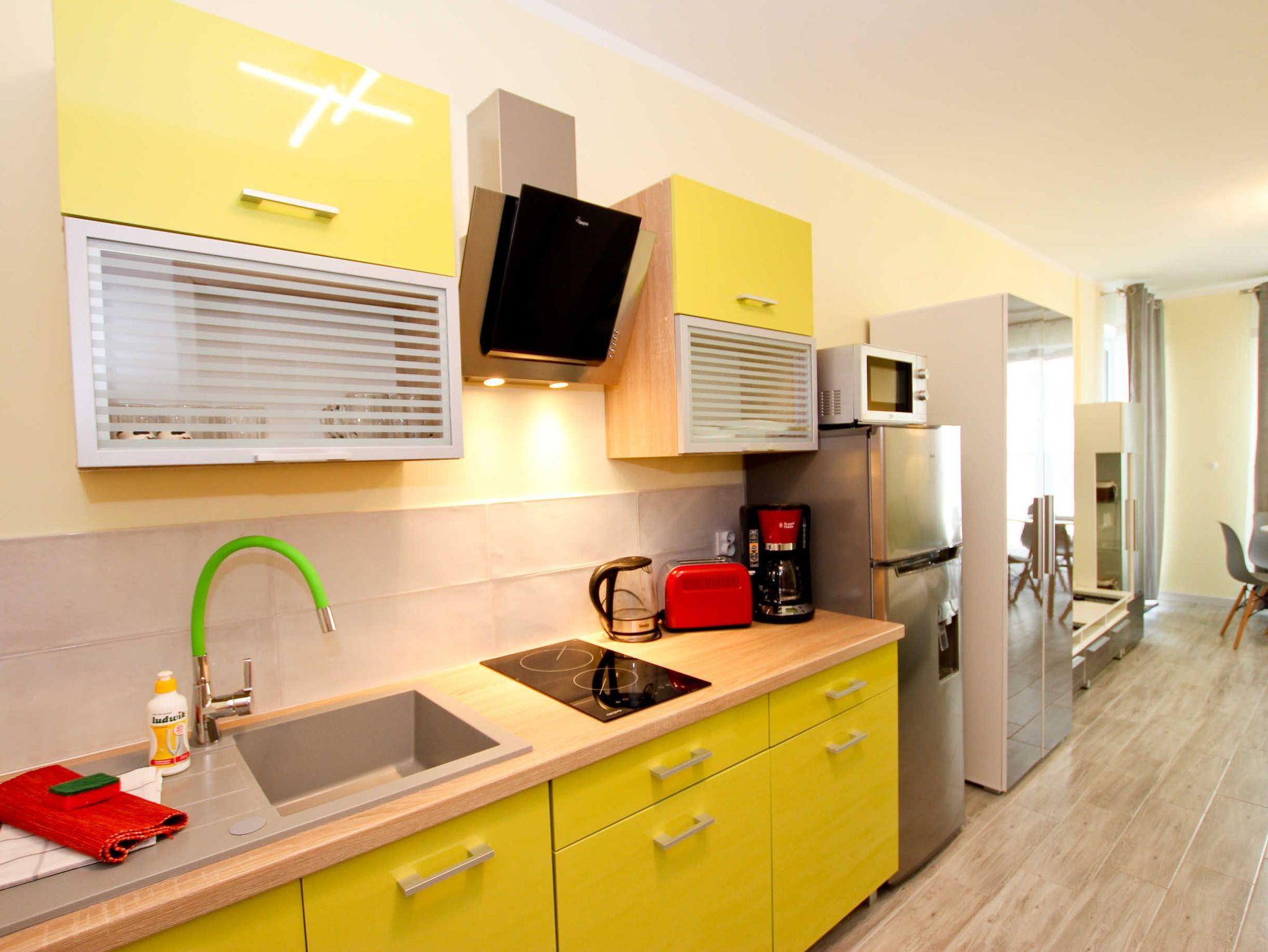 Die Küchenzeile ist mit notwendigen Geschirr und Besteck für die Zubereitung und den Verzehr von Mahlzeiten ausgestattet, ebenfalls mit einem Elektroherd mit 2 Heizflächen, einer Überlauf-Kaffeemaschine und einem Toaster.
