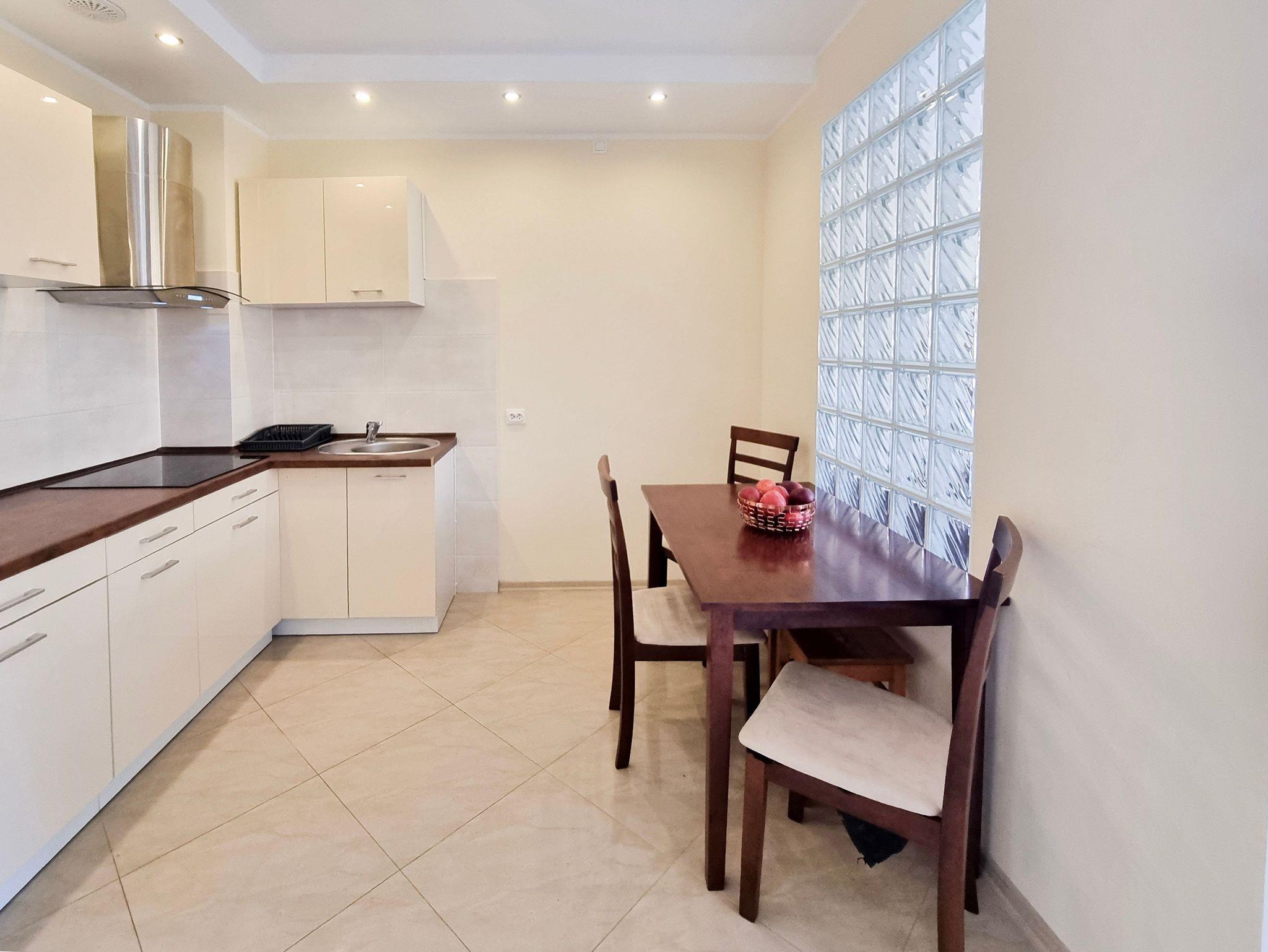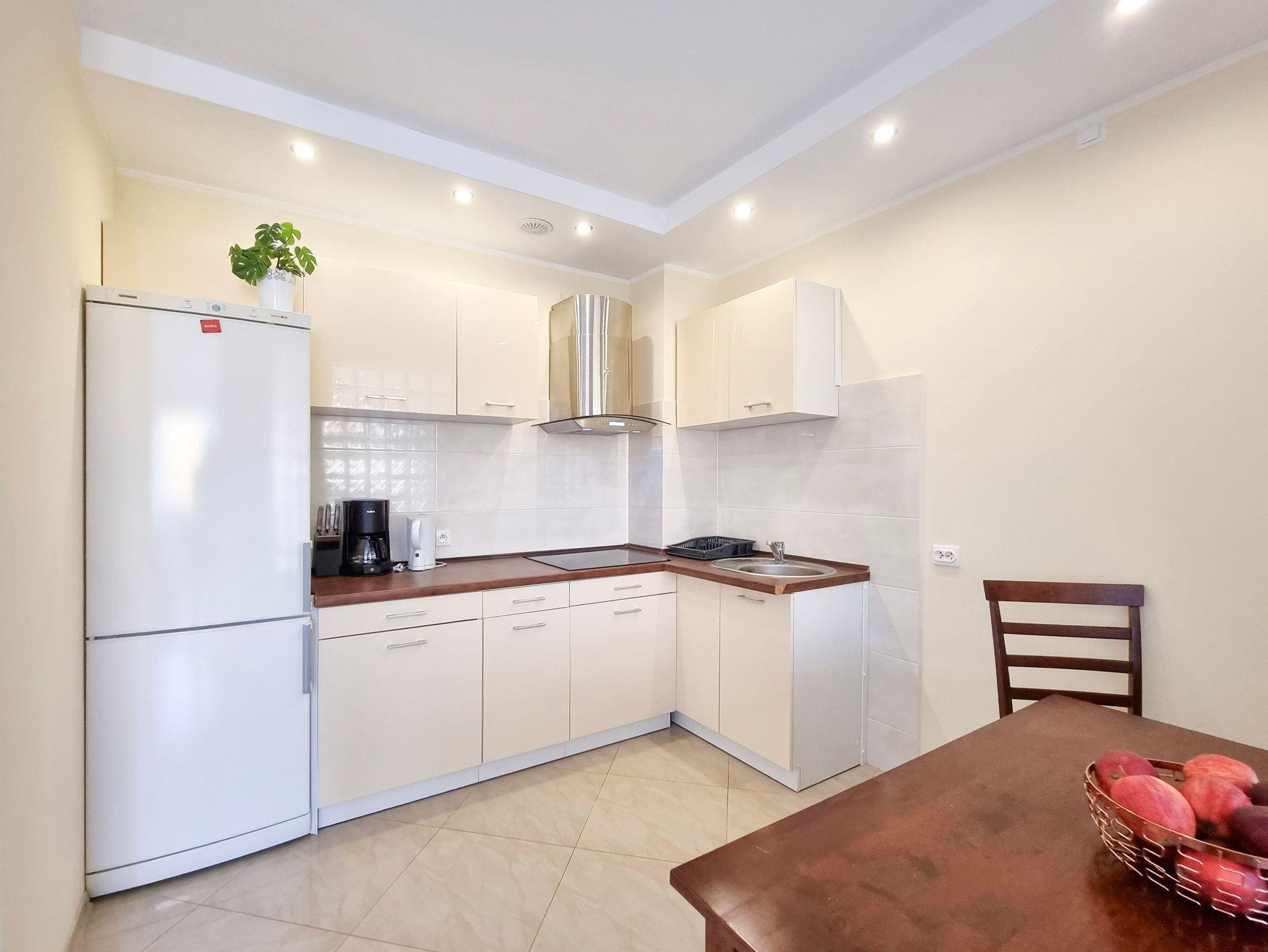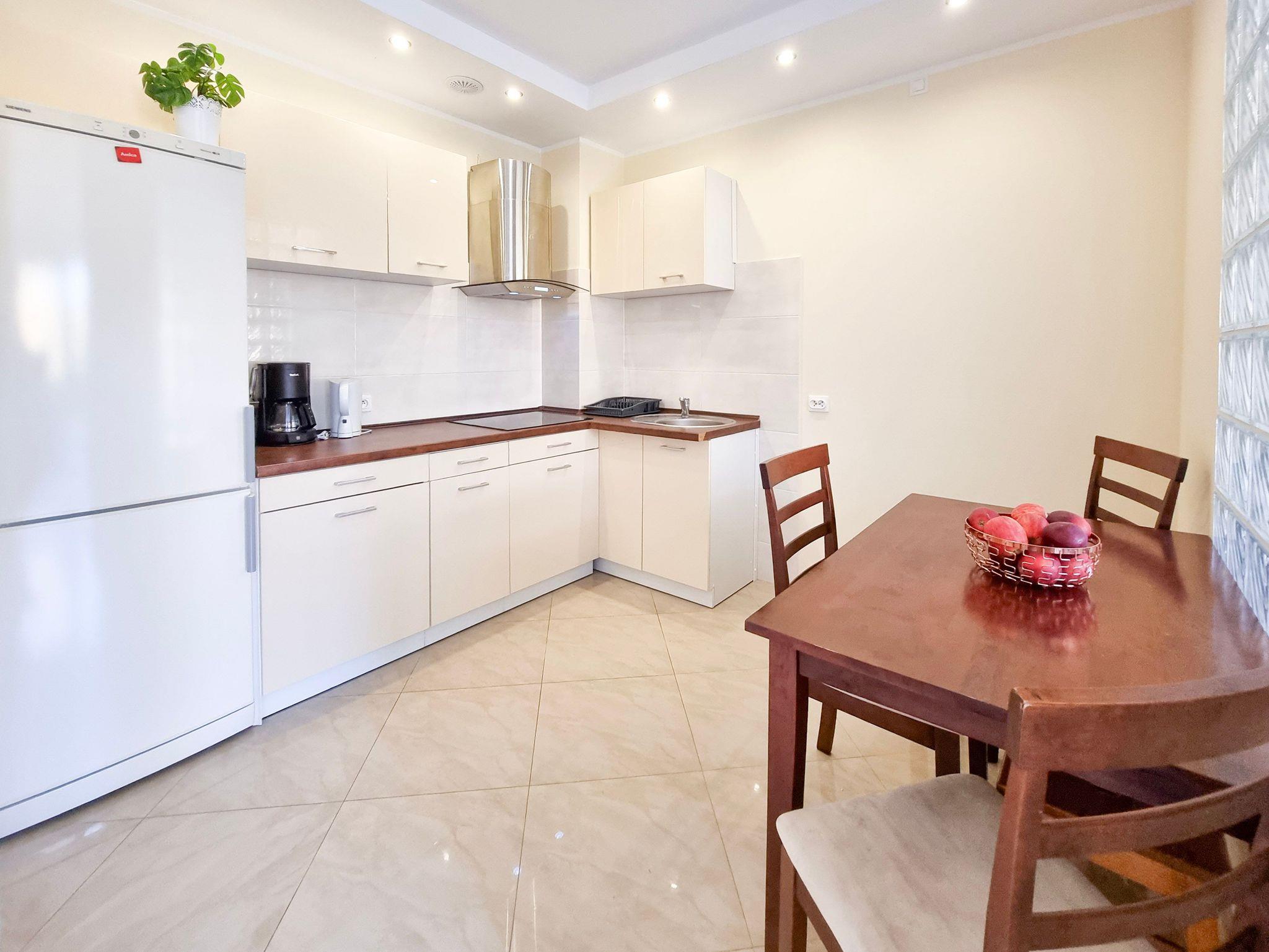Einer Küchenzeile befindet sich ein Esstisch mit 4 Stühlen. Die Küchenzeile mit Einbaumöbeln, mit den notwendigen Utensilien und Geschirr für die Zubereitung von Speisen ausgestattet, außerdem mit einem großen Kühlschrank mit Gefrierfach, Induktionskochfeld mit 4 Kochzonen, Geschirrspüler. Zusätzliche Küchenausstattung: Kaffeemaschine, Waserkocher