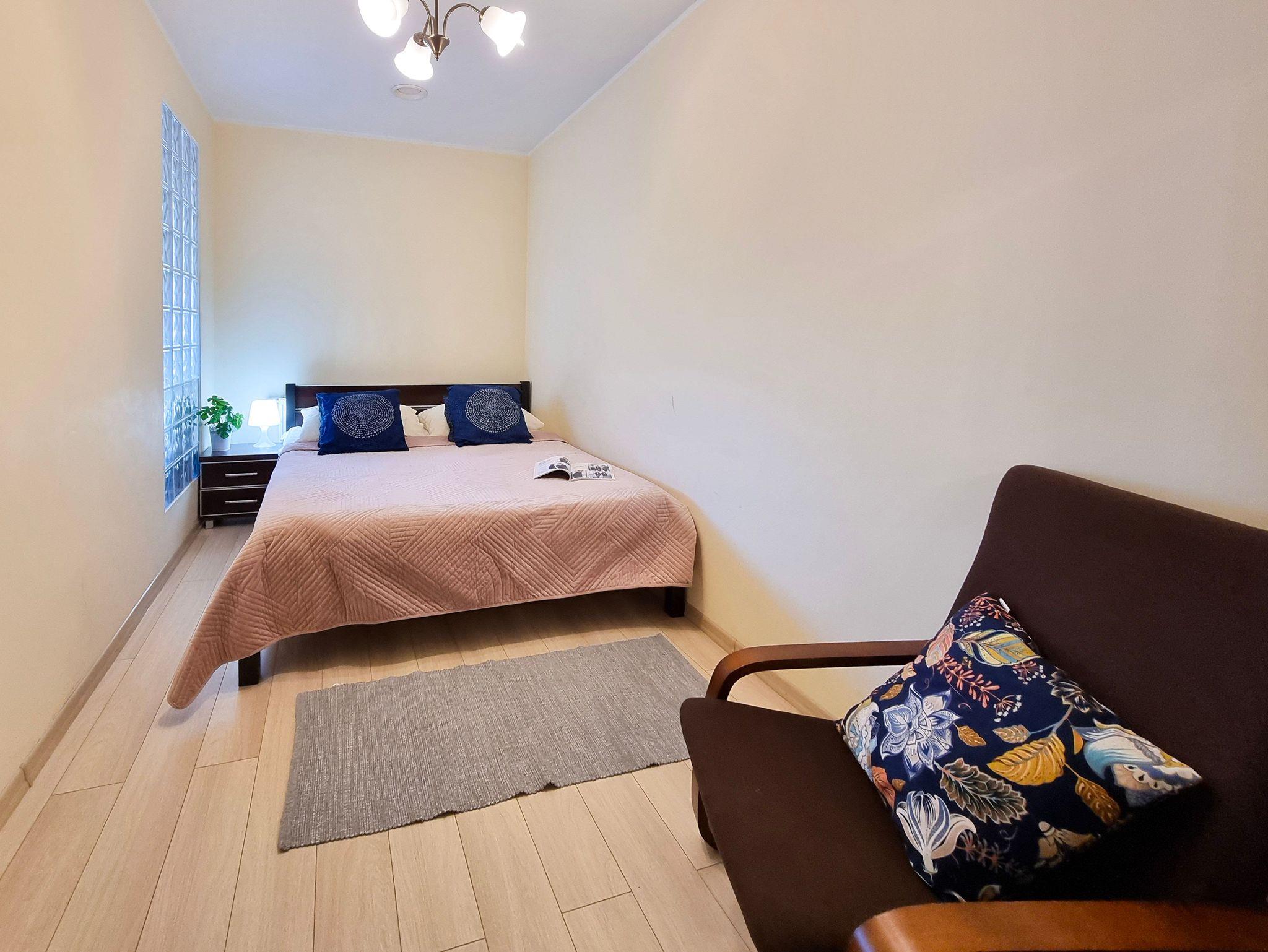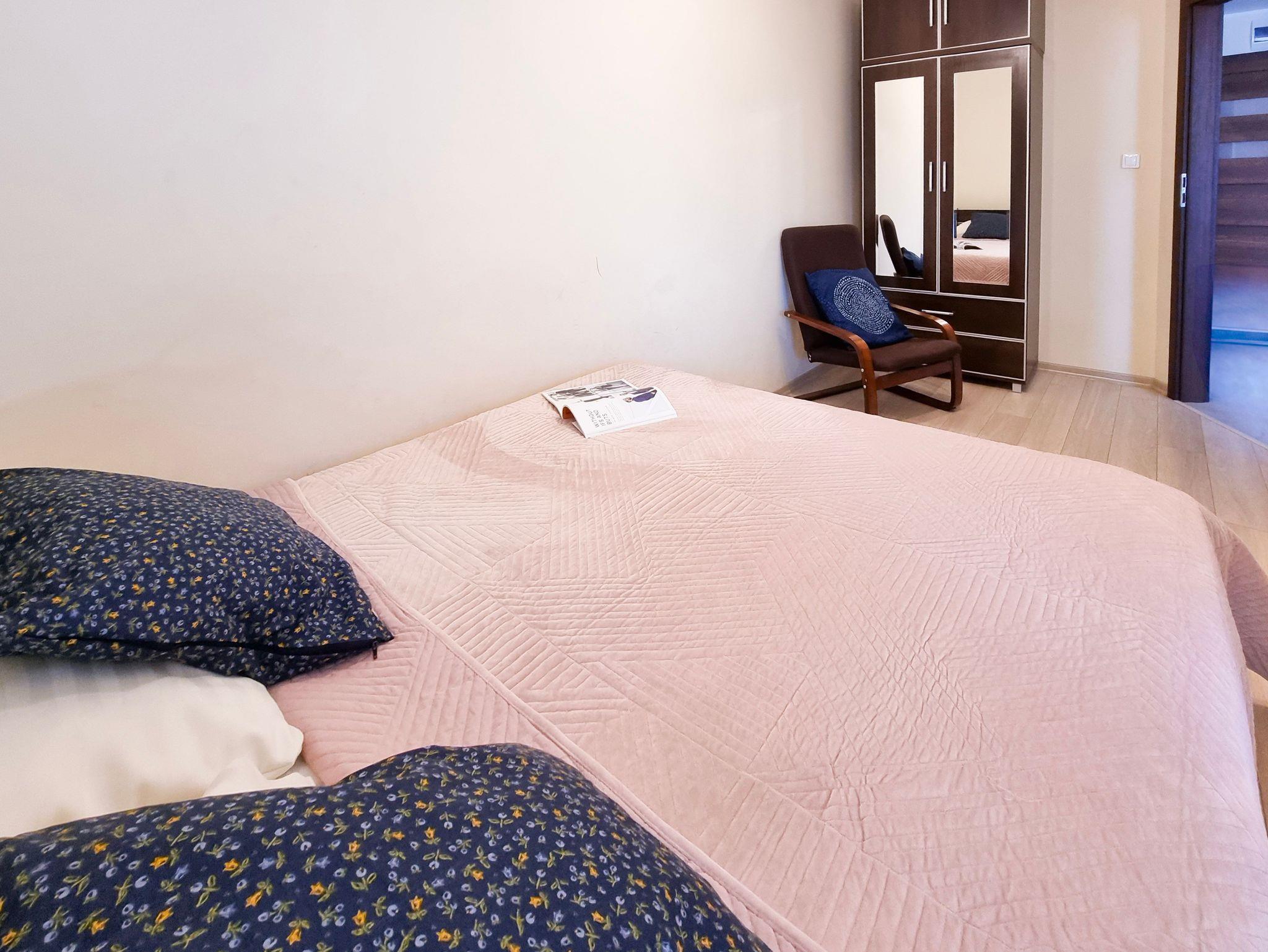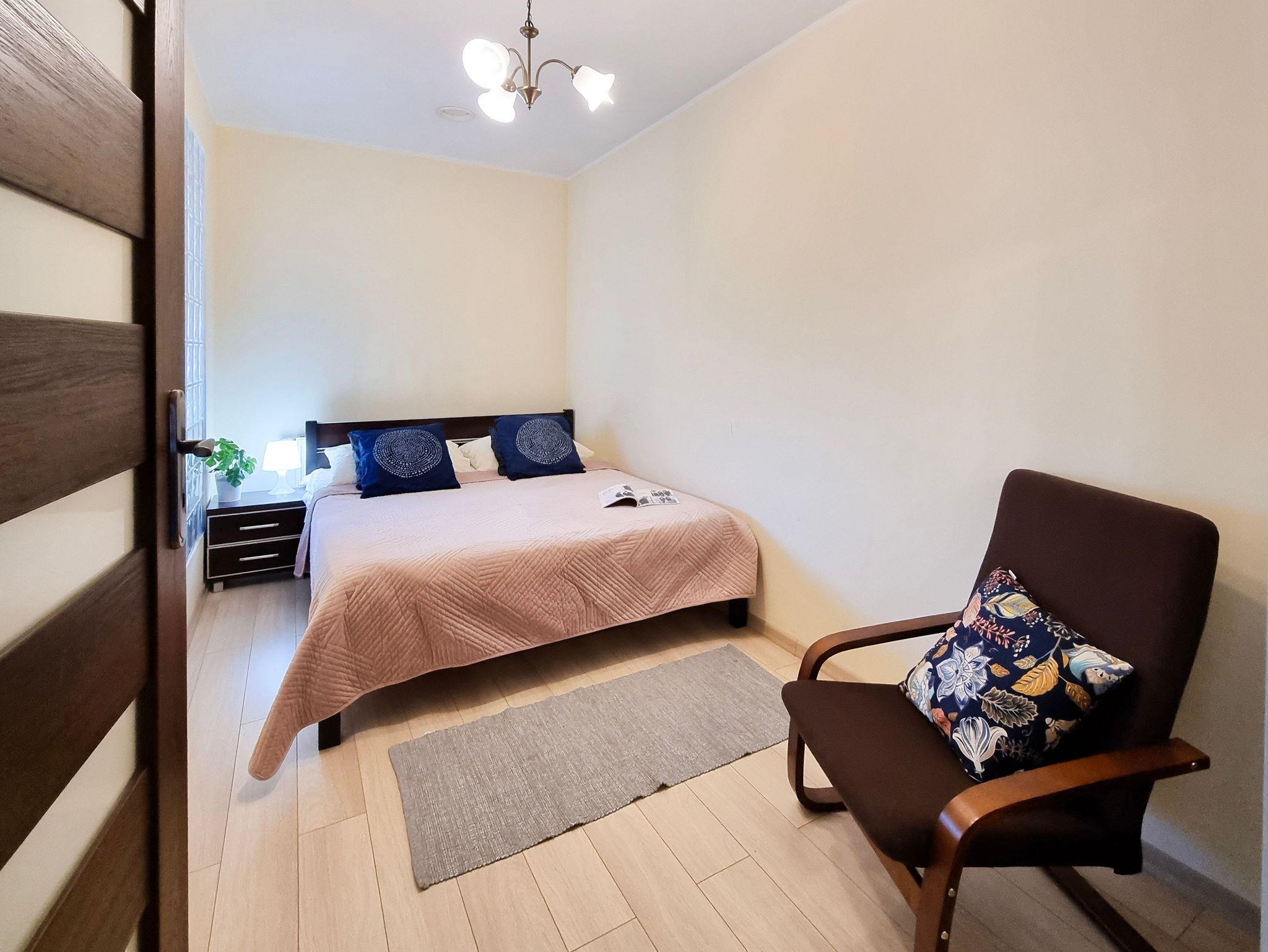 Das Schlafzimmer besteht aus einem Doppelbett mit einer Matratze (160x200), Nachttisch. In Schlafziemmer gibt kein Fenster.