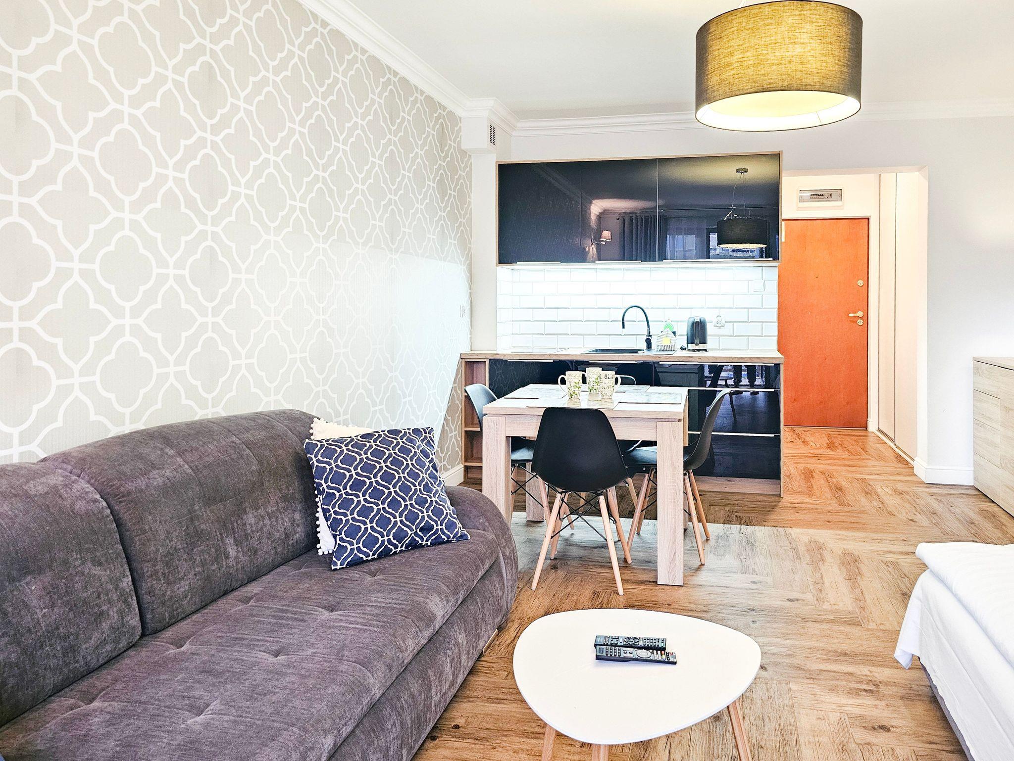Im Wohnbereich stehen den Gästen zwei bequeme Schlafsofas (Liegefläche nach dem Ausklappen: 150x200 cm), ein Couchtisch, ein Esstisch mit 4 Stühlen sowie eine Kommode zur Verfügung. Ein Flachbildfernseher empfängt polnische und deutsche terrestrische Digitalfernsehsender.