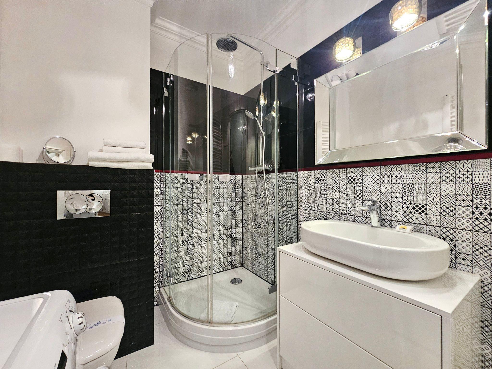 Das Badezimmer verfügt über eine Duschkabine, ein WC, ein Waschbecken sowie eine Waschmaschine.
