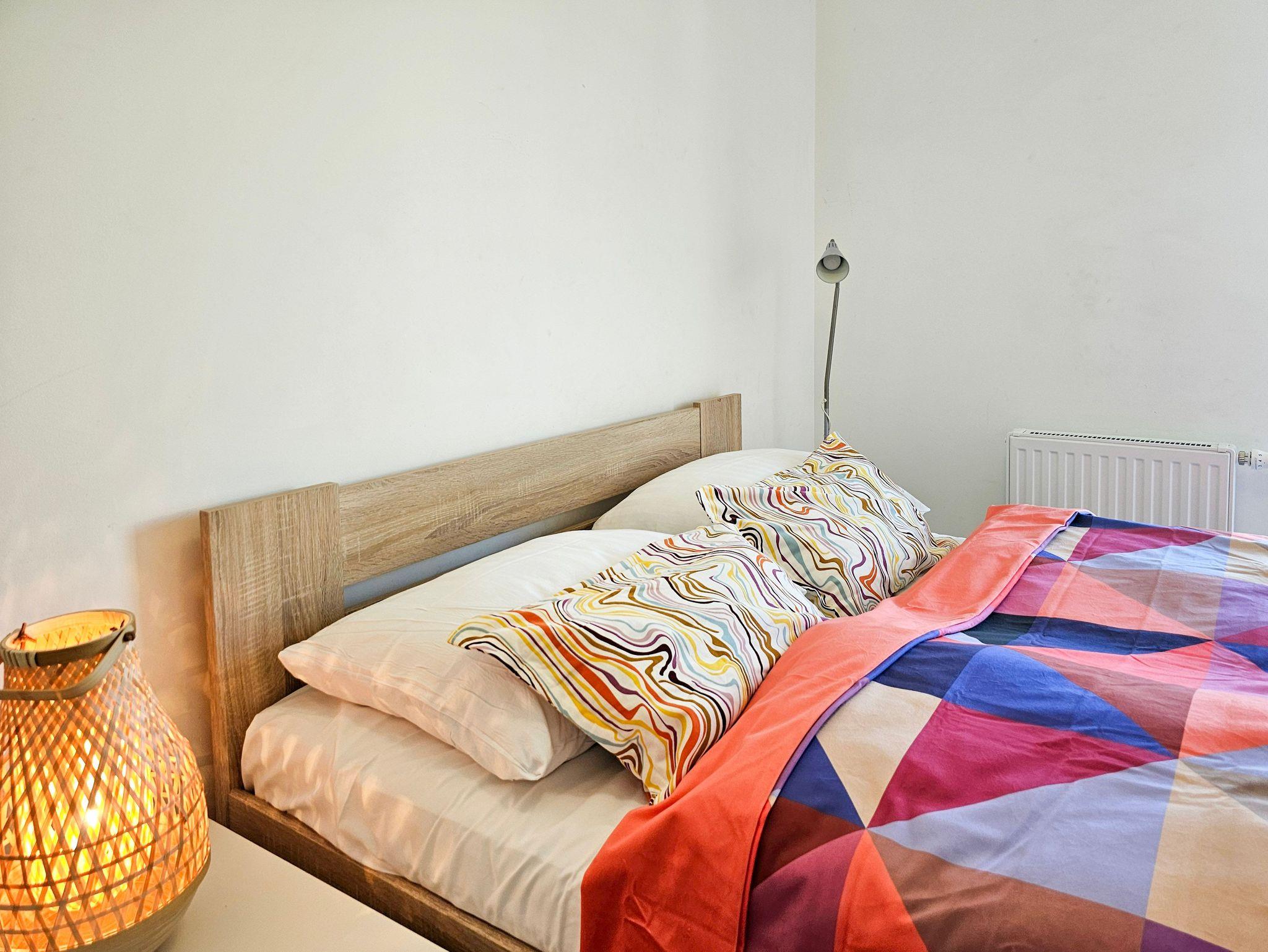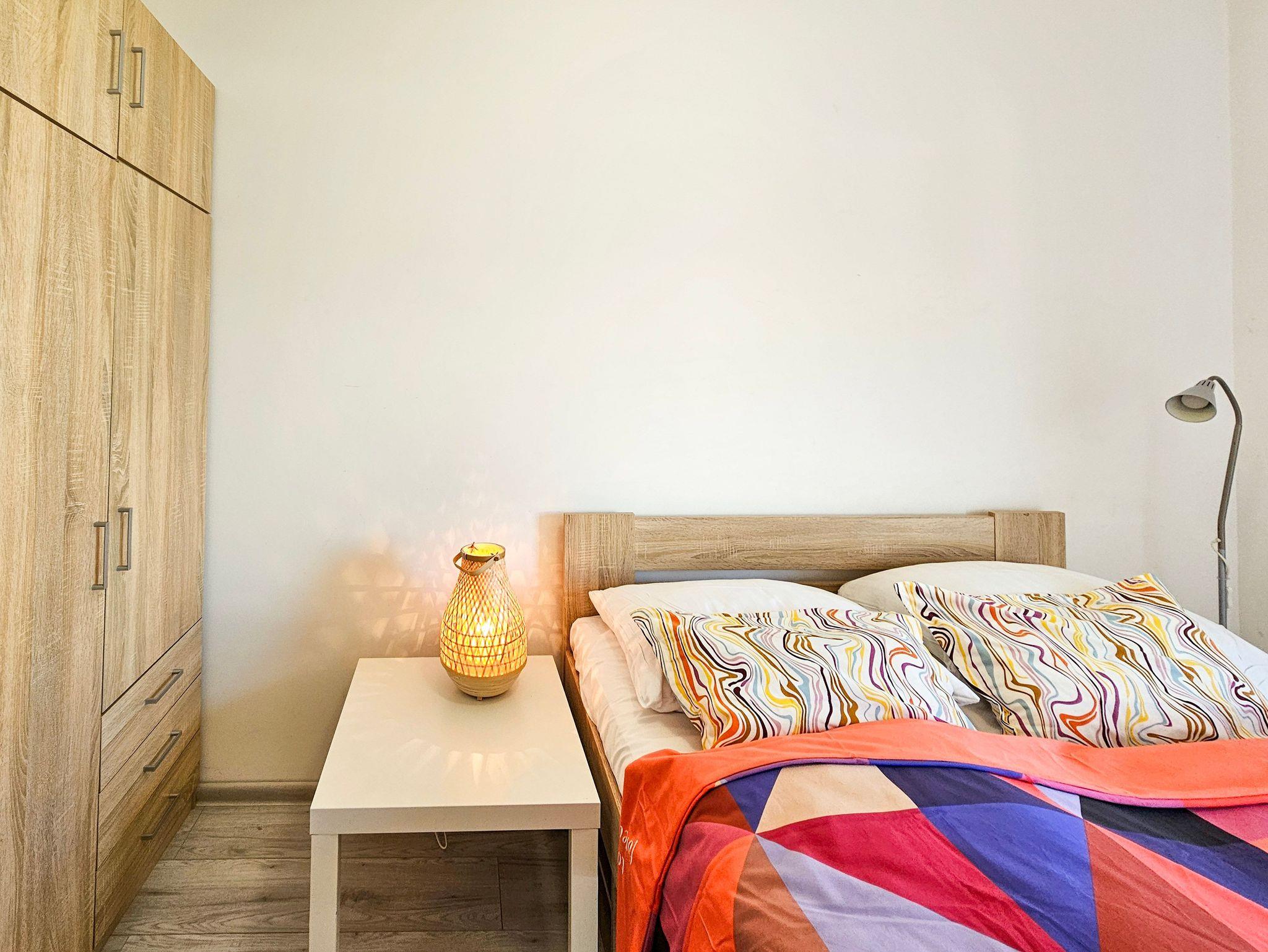 Die Ferienwohnung besteht aus einem Wohnzimmer mit Küchenzeile und einem Schlafzimmer. Es befindet sich im zweiten Stock eines Gebäudes mit Aufzug. Im Schlafzimmer gibt es ein Doppelbett (140x200 cm), einen zweitürigen Kleiderschrank und einen Nachttisch. Das Wohnzimmer ist mit einem Schlafsofa (ausgeklappt 150x200 cm), einer Kommode, einem Fernseher mit Zugang zu lokalen Kabelprogrammen sowie einem Esstisch mit vier Stühlen ausgestattet.