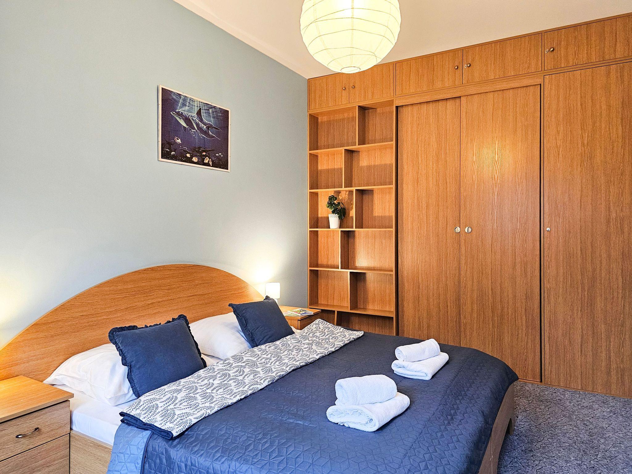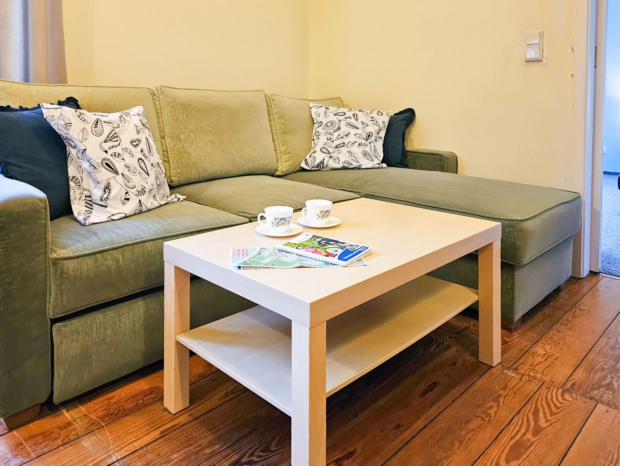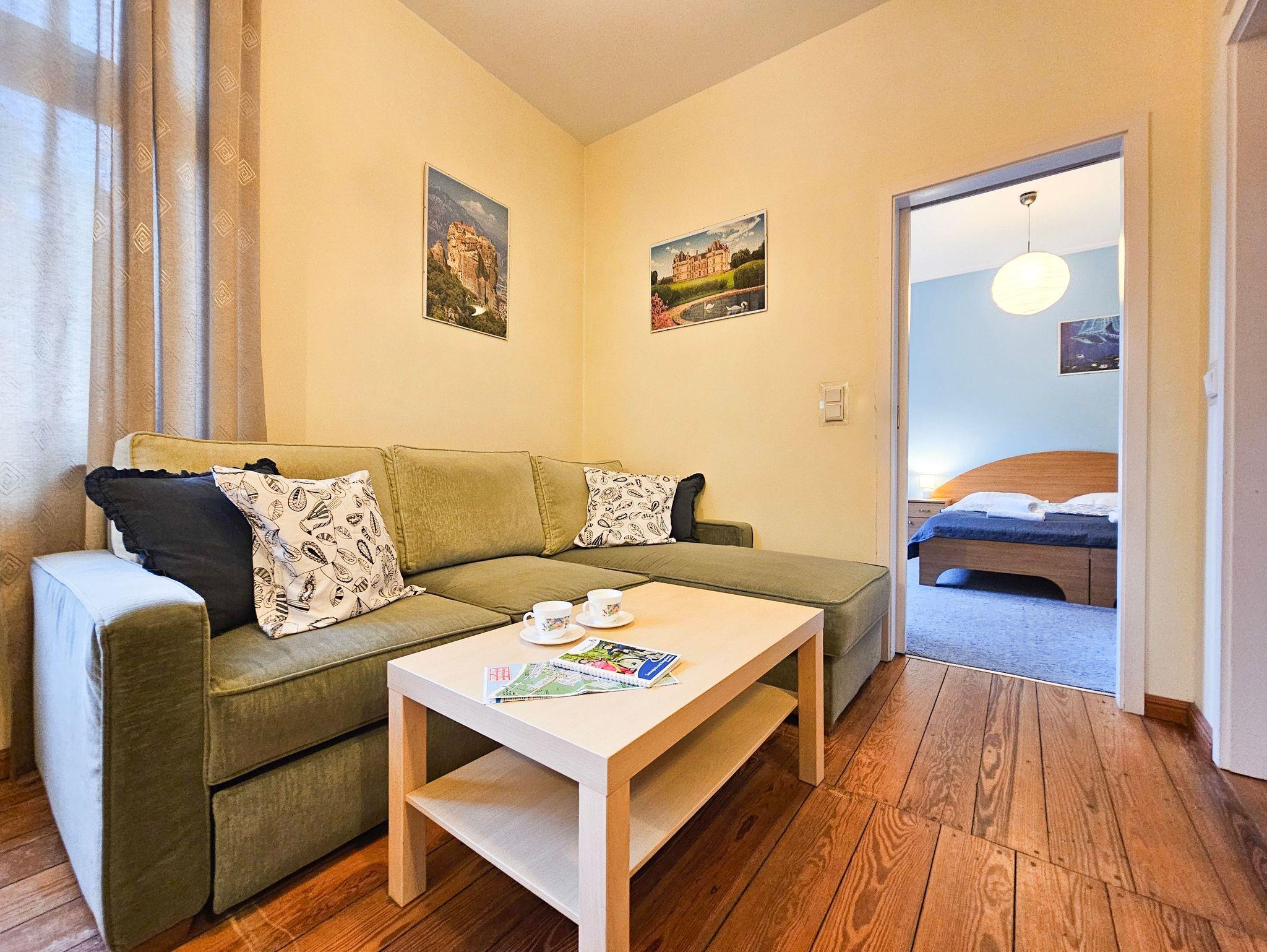 Eine komfortabel eingerichtete 2-Zimmer Wohnung mit Schlafzimmer mit Ehebett (160 x 200 cm) und Wohnzimmer mit Doppelcouch (140 x 200 cm) und Küchenzeile. Wohnung ausgestattet mit Waschmaschine und Mikrowelle.