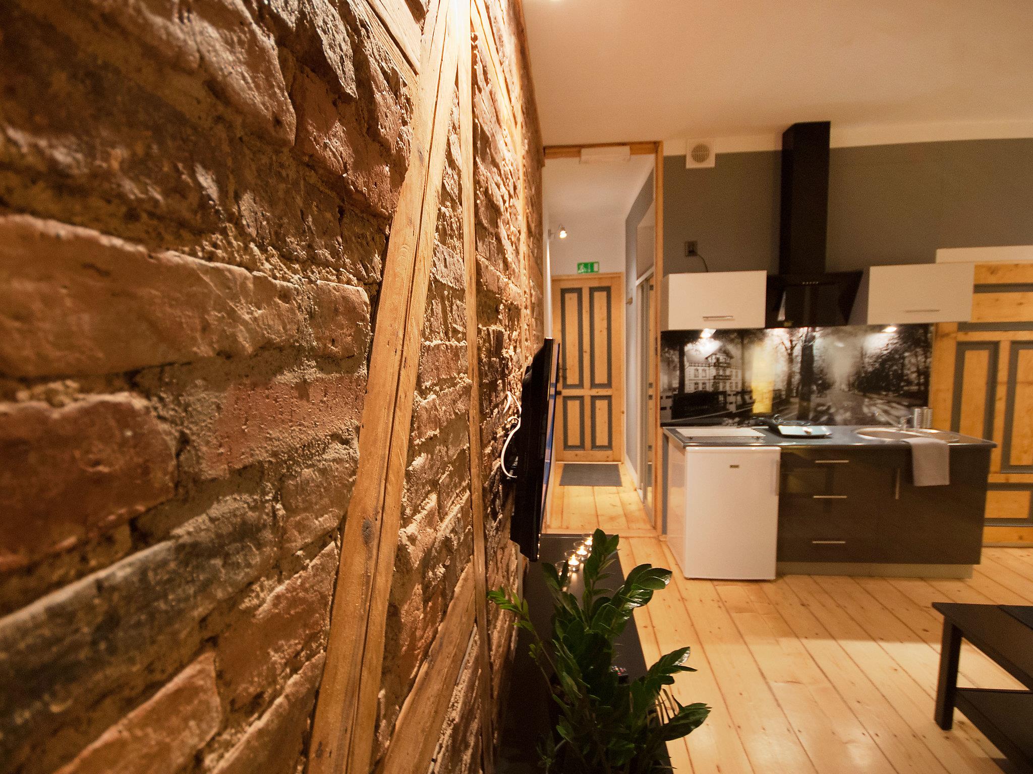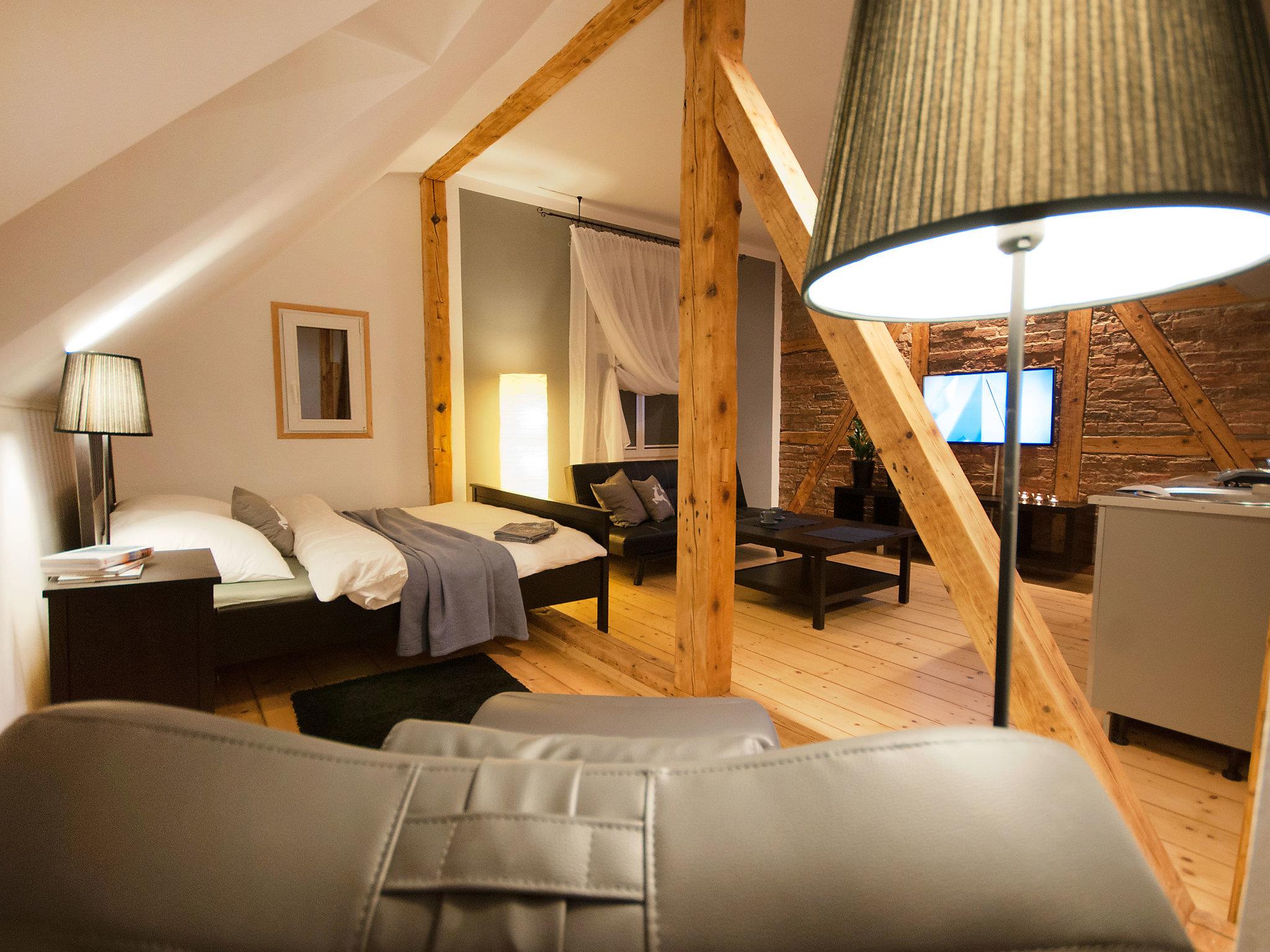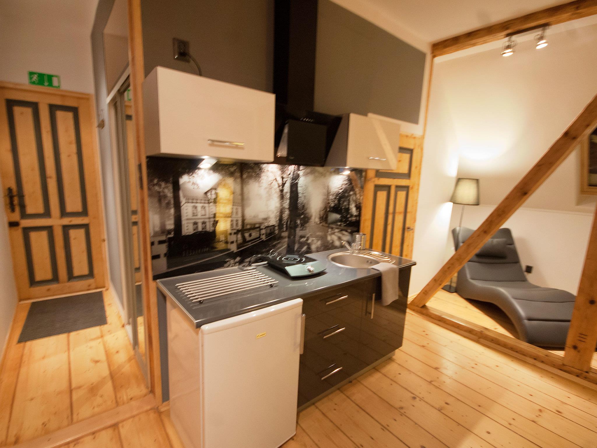 "Popiel", 1-room studio 30 m2 on 2nd floor. Studio with 1 double sofabed (140 cm, length 180 cm), 1 french bed (160 cm, length 200 cm), cable TV (flat screen). Small kitchenette (1 hot plate). Shower/WC. Gas heating. Facilities: Internet (WiFi, free). Parking.