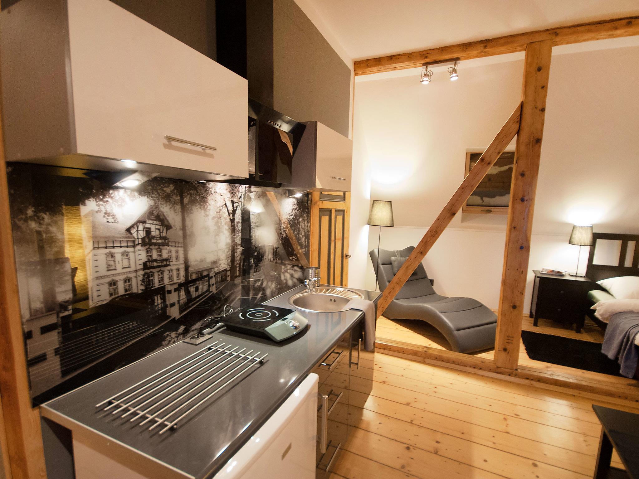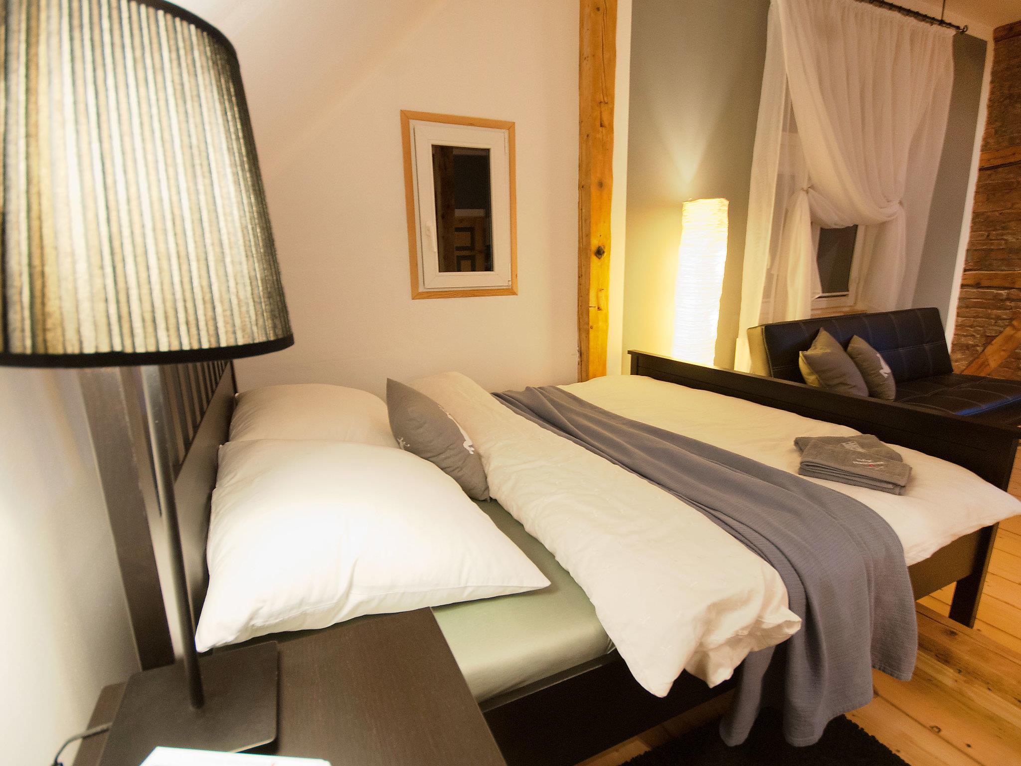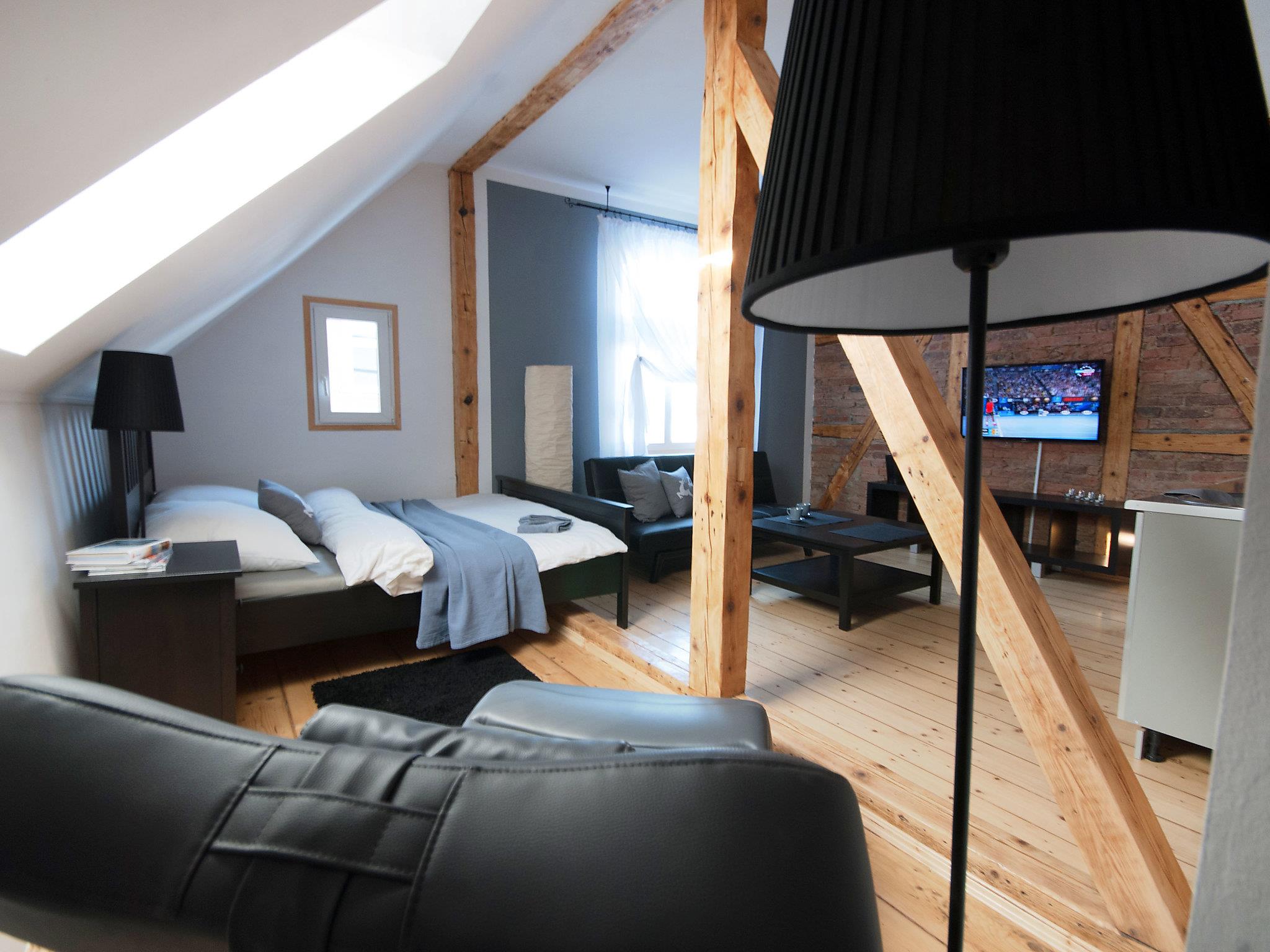"Popiel", 1-room studio 30 m2 on 2nd floor. Studio with 1 double sofabed (140 cm, length 180 cm), 1 french bed (160 cm, length 200 cm), cable TV (flat screen). Small kitchenette (1 hot plate). Shower/WC. Gas heating. Facilities: Internet (WiFi, free). Parking.