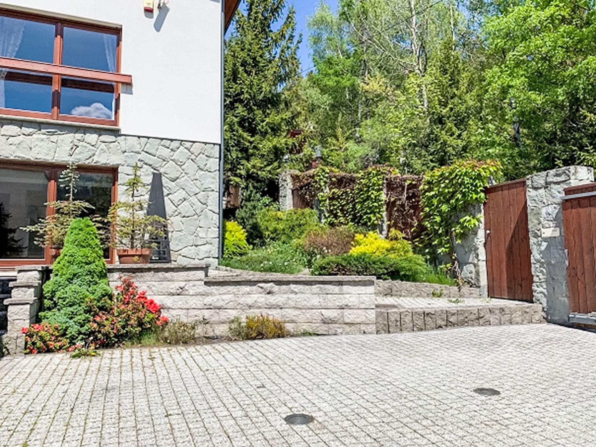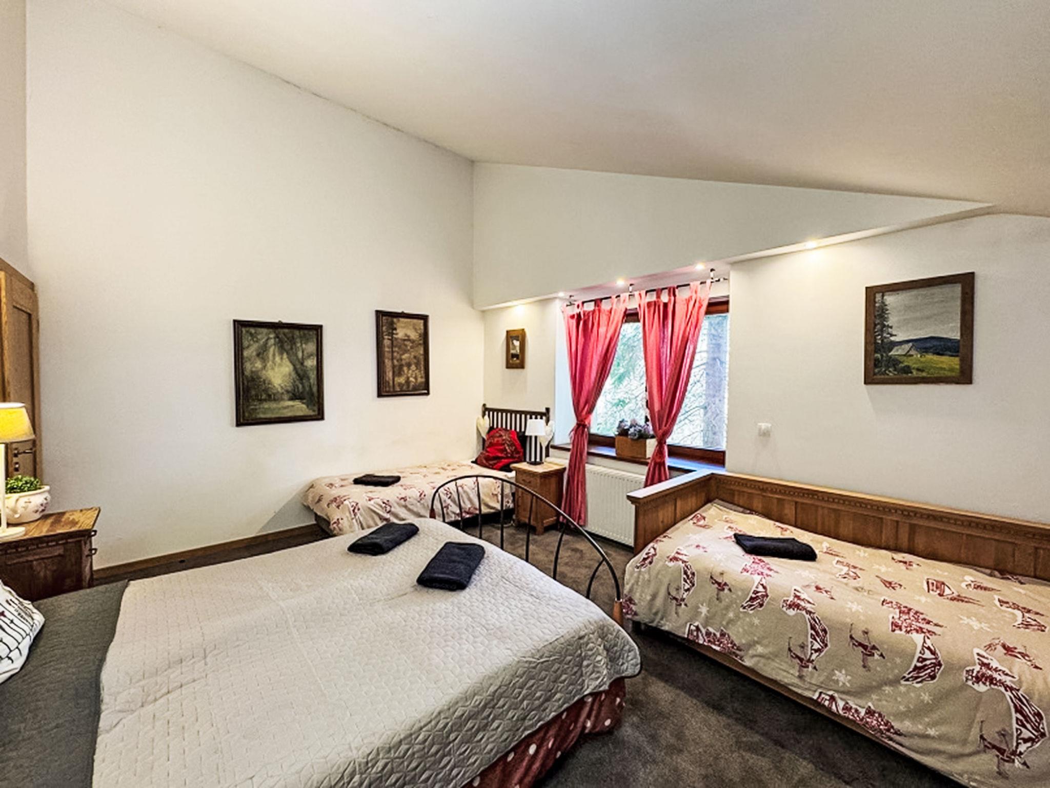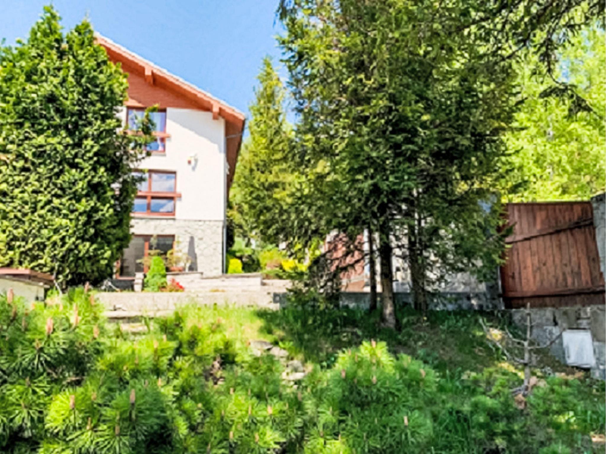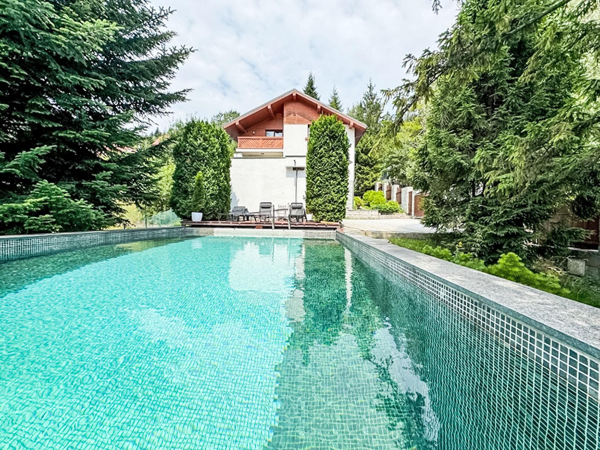 Comfortable, luxurious manor house "Willa Swierkowa". In a quiet position on a slope, in the countryside. Private: property 800 m2 (fenced), garden (fenced), swimming pool angular (4 x 8 m, seasonal availability: 01.May. - 31.Sep.). In the house: WiFi, sauna, hot tub, spa area, playroom, central heating system, washing machine, tumble dryer. Steep motor access to the house. In Winter: please take snow chains. Parking at the house, single garage. Shop 1 km, grocery, supermarket 200 m, restaurant 250 m, bus stop 15 km, indoor swimming pool 2.5 km. Cable car, ski lift 200 m, cross country ski track 700 m. There are 4 parking spaces available, including 1 space in the garage. Fun room for children: equipped with DVD, books, toys.