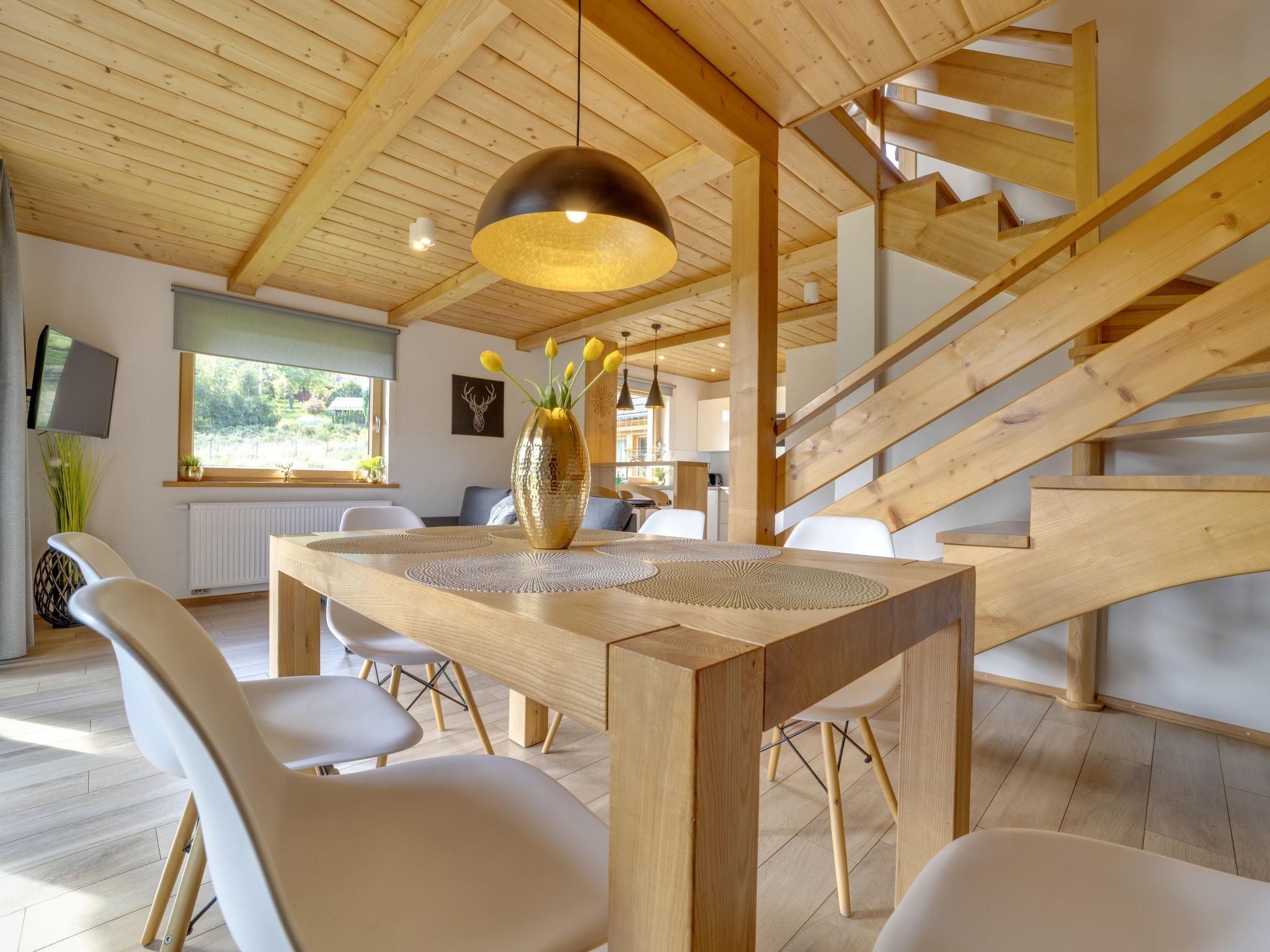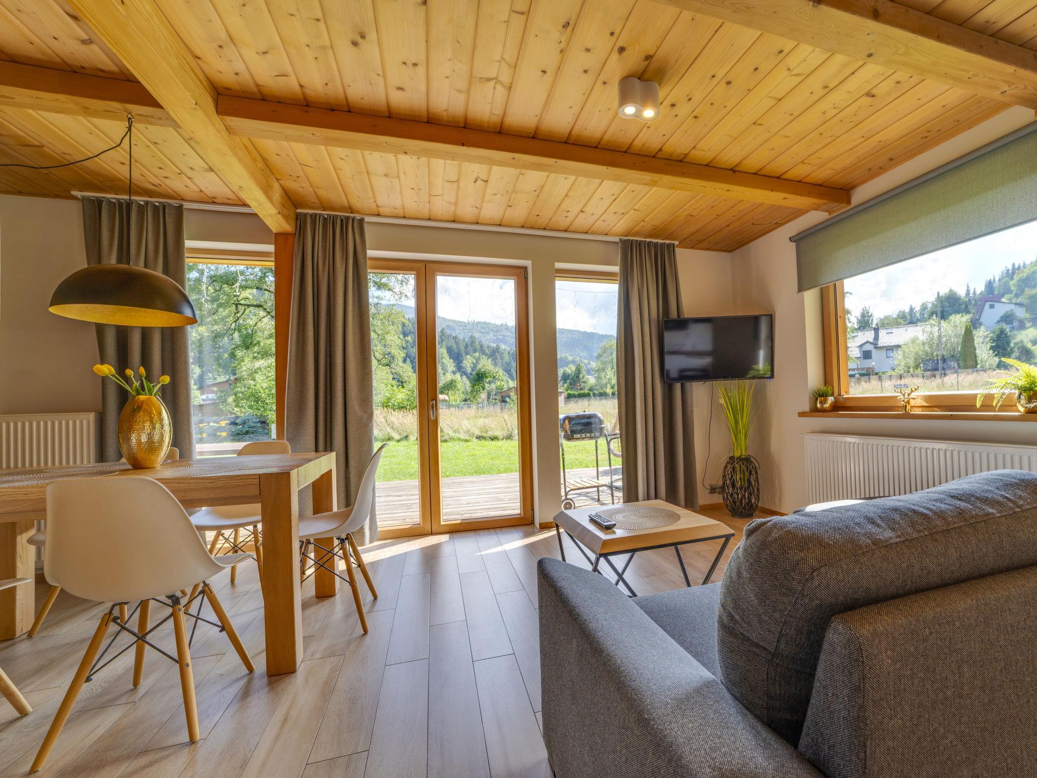 Modern, beautiful, comfortable holiday village "Chaty Pod Beskidkiem", built in 2017. In a quiet, sunny position, 800 m from the skiing area, in the countryside. For shared use: property, garden. Barbecue. In the house: internet access, central heating system. Motor access (via unmade road). Parking at the house. Grocery, supermarket 500 m, restaurant 400 m, bus stop 500 m. Cable car, ski lift, ski school 800 m. Please note: the photograph shows a typical example. Additional accommodations can be booked.