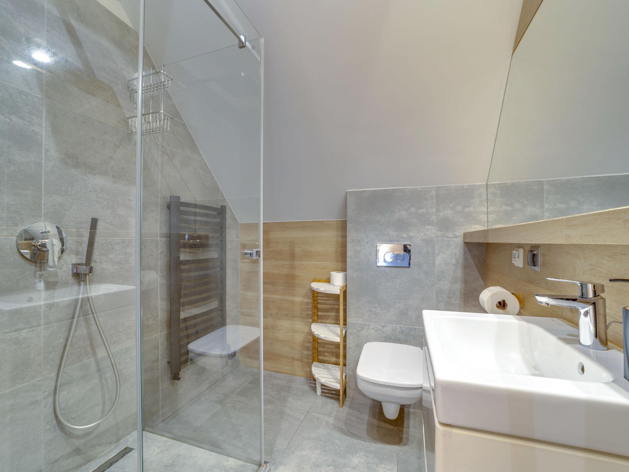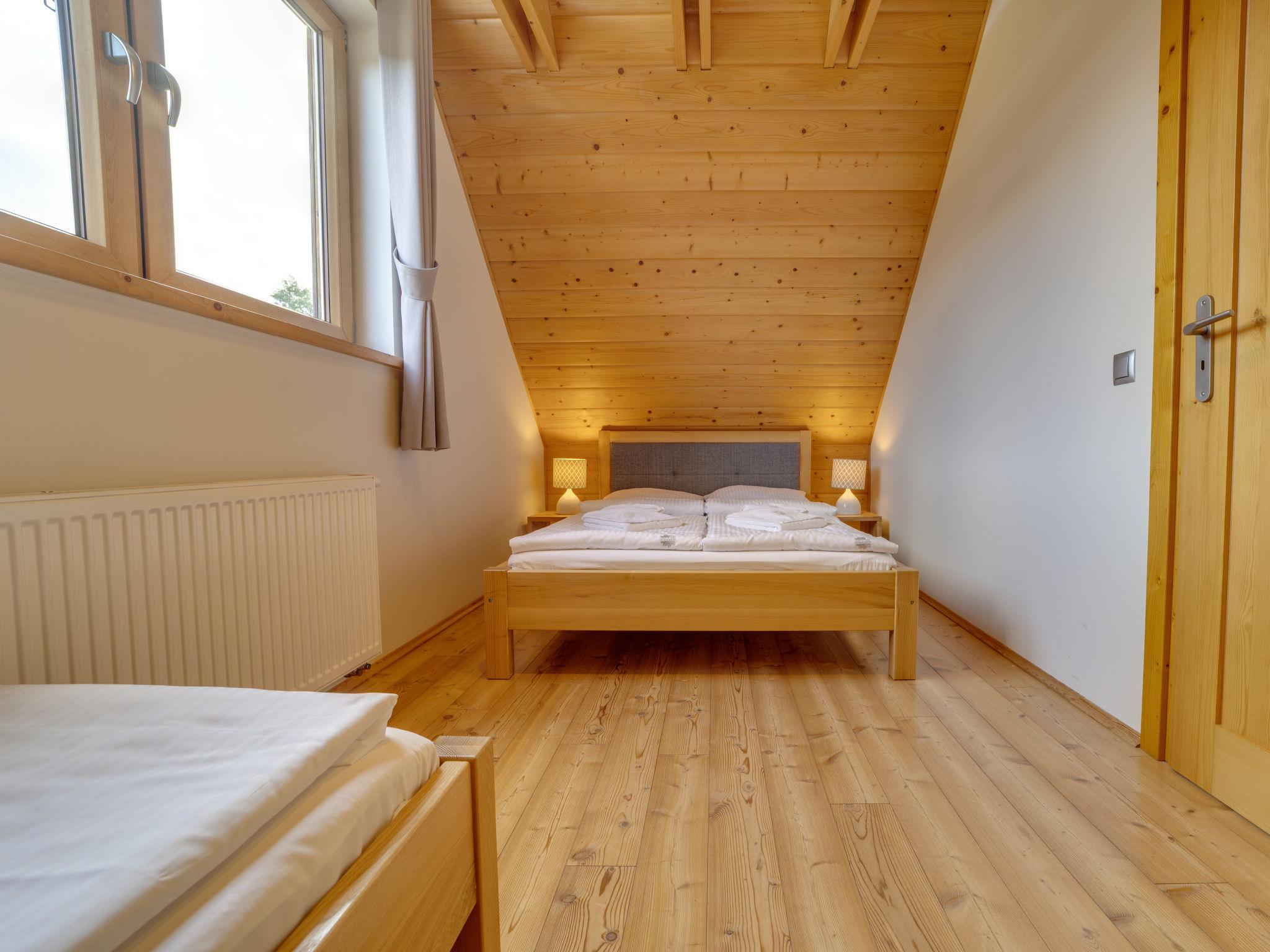 3-room chalet 70 m2 on 2 levels. Partly with sloping ceilings: lounge with 1 double sofabed, dining table and TV. Exit to the terrace. Open kitchen (dishwasher, 2 ceramic glass hob hotplates, microwave, freezer). Sep. WC. Upper floor: 1 room with 1 bed (80 cm, length 200 cm), 1 double bed (140 cm, length 200 cm). 1 room with 1 bed (80 cm, length 200 cm), 1 double bed (140 cm, length 200 cm). Shower/WC. Gas heating. Terrace 18 m2. Terrace furniture, deck chairs (3). Beautiful view of the countryside. Facilities: hair dryer. Internet (WiFi). Please note: smoke alarm. House for maximum 6 adults and 2 children.
