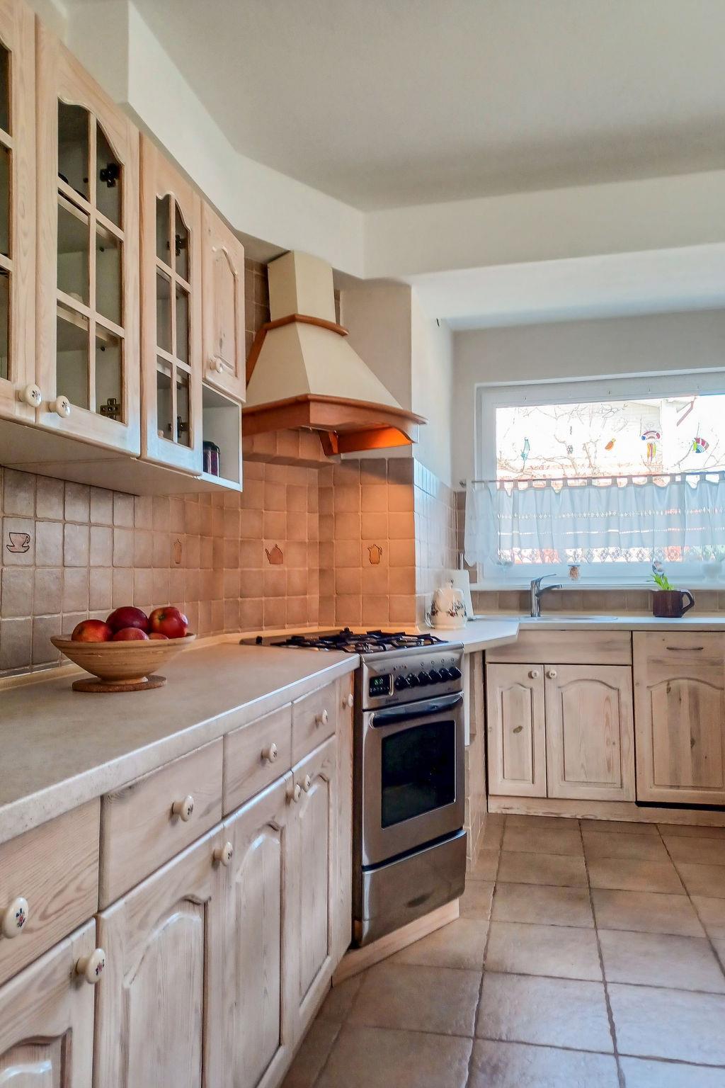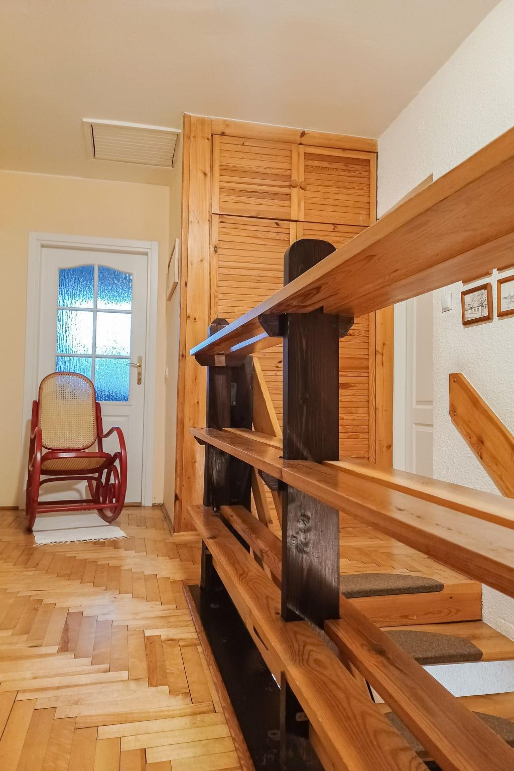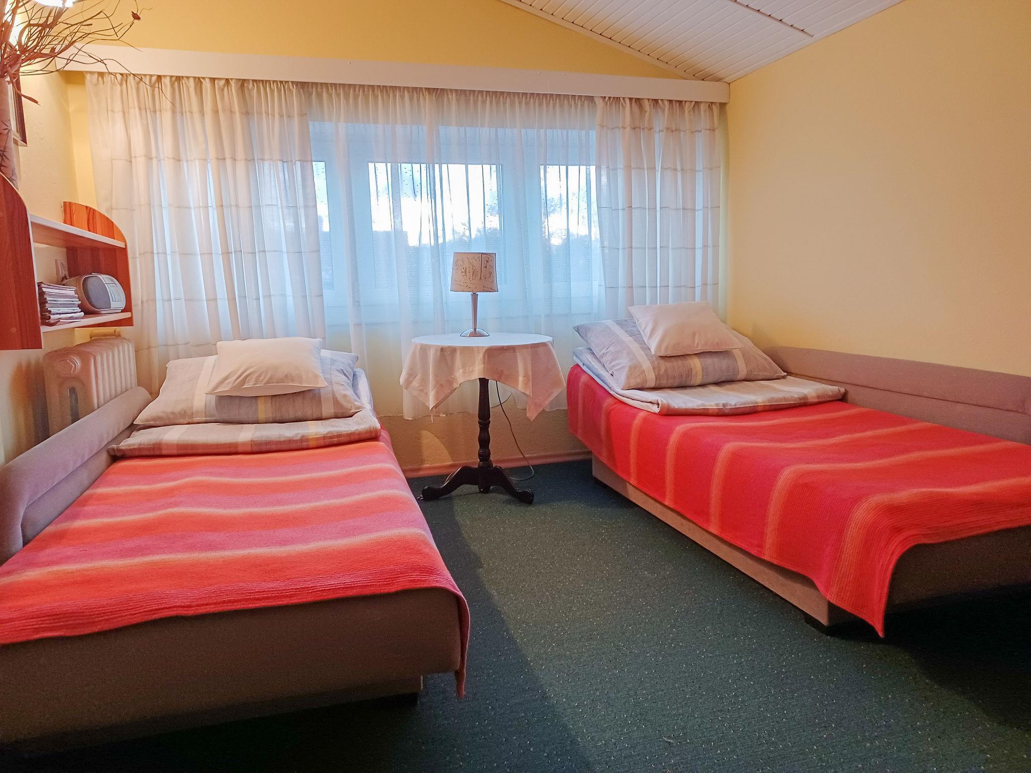 4-room apartment 105 m2 on 2 levels. Entrance hall with 1 sofabed, satellite TV and radio. Exit to the garden. Kitchen (oven, dishwasher, electric coffee machine) with dining nook. Shower/WC. Upper floor: 1 room 13 m2 with 1 french bed (180 cm, length 200 cm). Exit to the balcony. 1 room 10 m2 with 1 french bed (160 cm, length 200 cm). 1 room 12 m2 with 2 beds (80 cm, length 200 cm). 1 room 10 m2 with 2 beds (80 cm, length 200 cm). Shower/WC, bath/shower/WC. Gas heating, solar energy heating, boiler (300 litres). Balcony 8 m2. Facilities: children's high chair. Internet (WiFi, free). Parking (2 cars). Please note: non-smokers only. Private entrance. The kitchen has a dining table for 8 people.