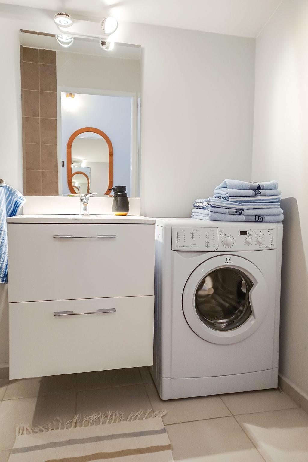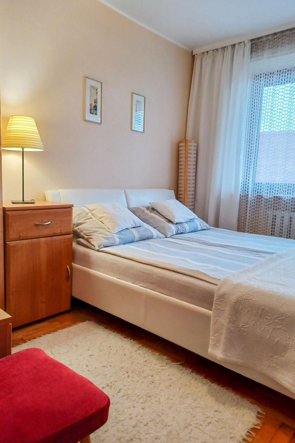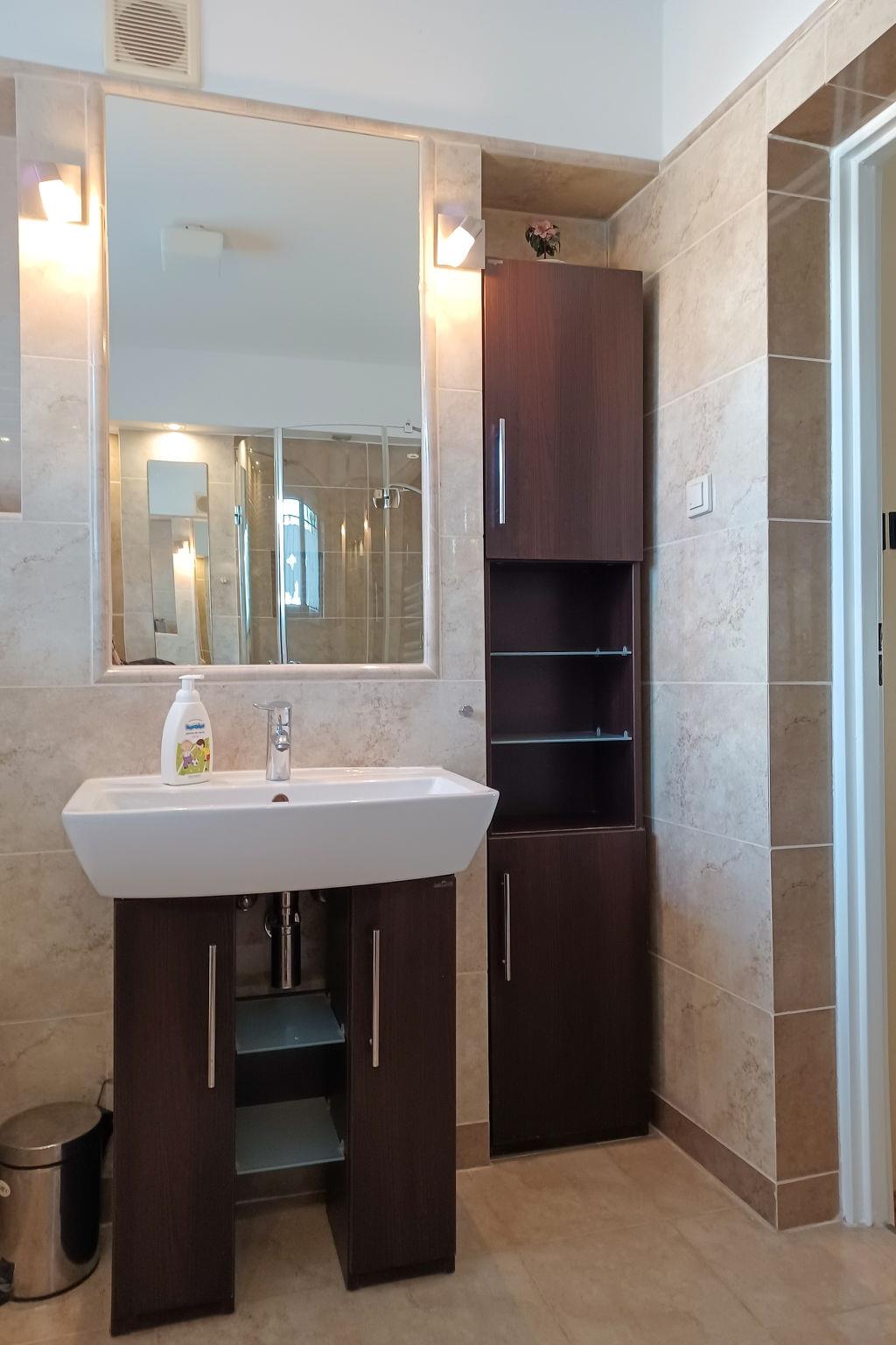 4-room apartment 105 m2 on 2 levels. Entrance hall with 1 sofabed, satellite TV and radio. Exit to the garden. Kitchen (oven, dishwasher, electric coffee machine) with dining nook. Shower/WC. Upper floor: 1 room 13 m2 with 1 french bed (180 cm, length 200 cm). Exit to the balcony. 1 room 10 m2 with 1 french bed (160 cm, length 200 cm). 1 room 12 m2 with 2 beds (80 cm, length 200 cm). 1 room 10 m2 with 2 beds (80 cm, length 200 cm). Shower/WC, bath/shower/WC. Gas heating, solar energy heating, boiler (300 litres). Balcony 8 m2. Facilities: children's high chair. Internet (WiFi, free). Parking (2 cars). Please note: non-smokers only. Private entrance. The kitchen has a dining table for 8 people.