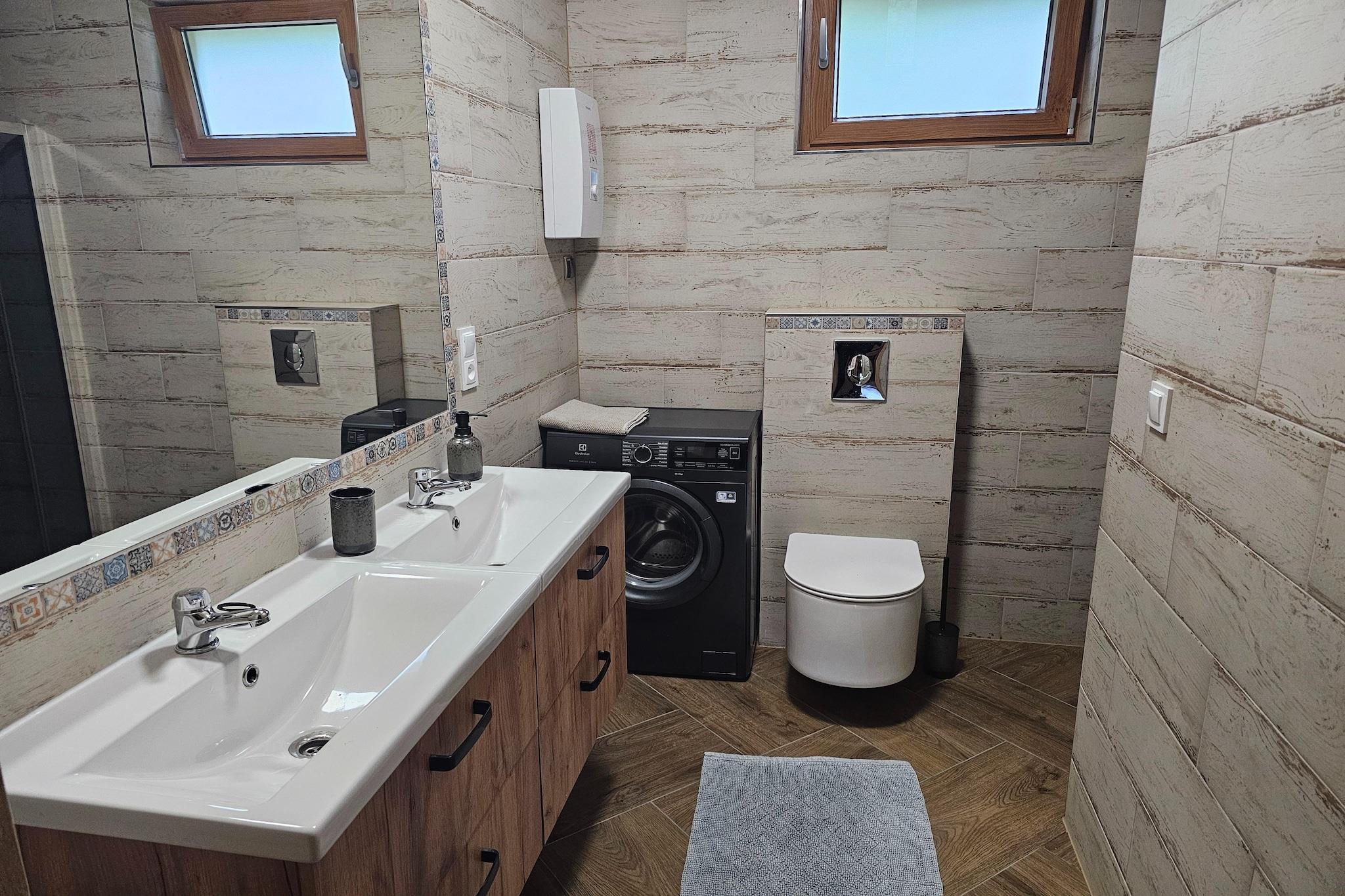 Single-storey holiday home directly on the shore of Lake Wierzchowo (protected landscape area). On the private property there are 2 identical houses, whose guests have at their disposal 1 hectare of fenced area (including 200 m of private beach on the lake). The comfortable holiday home offers a spacious living room (fireplace, satellite TV, sofa bed, large table) with a direct view of the lake. The living room is connected to a well-equipped kitchen. The house has 3 separate double bedrooms, and 2 bathrooms with showers (additionally, one of them has a washing machine). The holiday home has a covered terrace with a set of garden furniture. The view of the lake from the terrace is just as picturesque as from the living room. The house is heated by a fireplace in the living room (this is an efficient source of heating). Wireless internet is available. There is a barbecue and a fishing pier by the private beach, and several rowing boats are moored there. The boats can be used free of charge, but a reservation with the owner is required. For an additional fee, you can rent a boat engine. You can also rent bikes from the owner of the facility. The price of your stay includes: bed linen, towels, electricity and water consumption, firewood, final cleaning, internet, parking. The price also includes the use of a rowing boat, but this requires prior reservation. A high chair is available free of charge upon prior notification. Lake Wierzchowo is a paradise for fishing enthusiasts. The reservoir has an area of ??750 hectares. The water in it is crystal clear, so the lake is also extremely inviting for lovers of bathing. The owner of the facility lives in the center of the village of Grabczyn, approx. 3 km from the lake. On its premises, for an additional fee, you can use the tennis court and table tennis table.