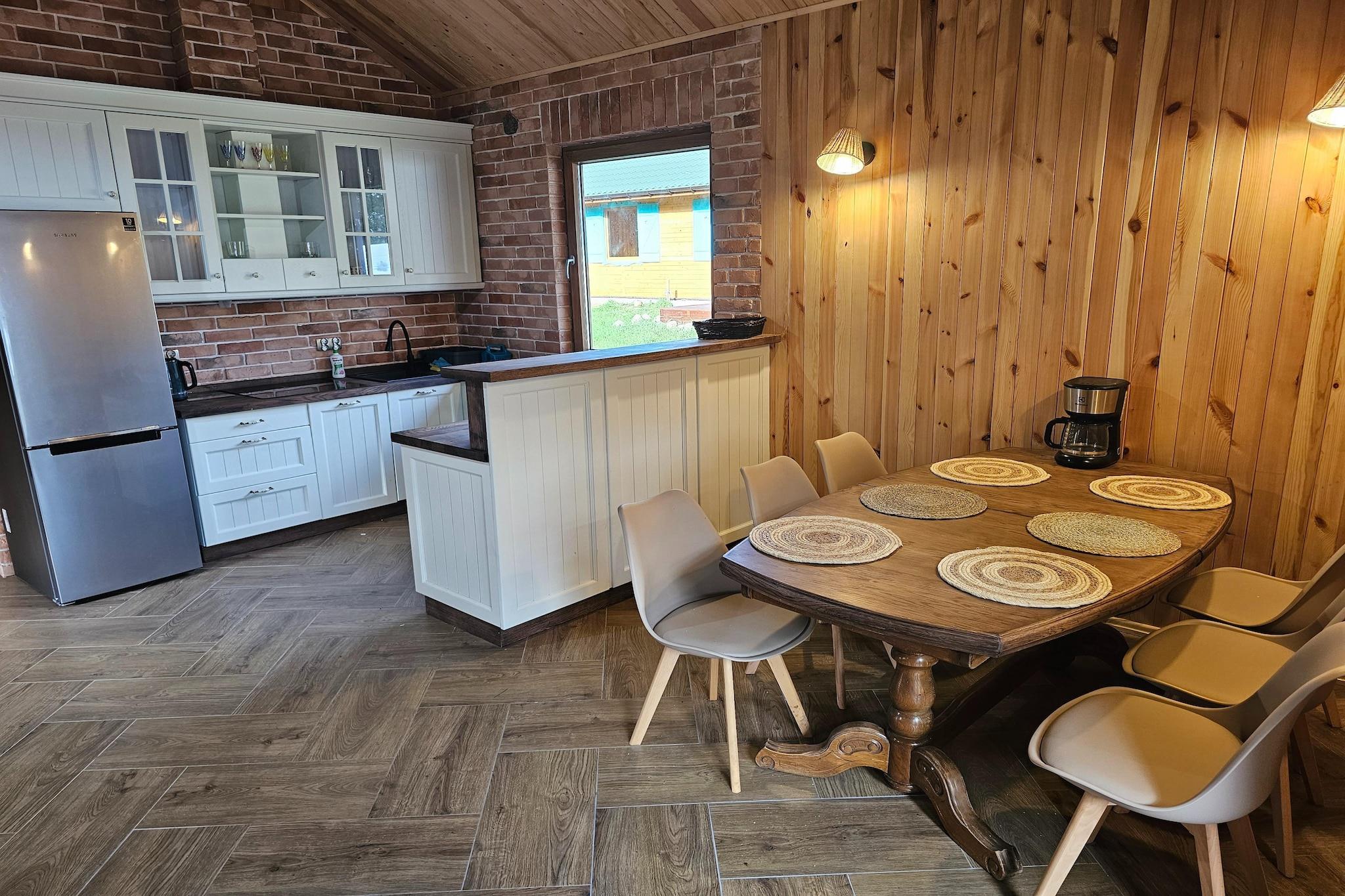 Single-storey holiday home directly on the shore of Lake Wierzchowo (protected landscape area). On the private property there are 2 identical houses, whose guests have at their disposal 1 hectare of fenced area (including 200 m of private beach on the lake). The comfortable holiday home offers a spacious living room (fireplace, satellite TV, sofa bed, large table) with a direct view of the lake. The living room is connected to a well-equipped kitchen. The house has 3 separate double bedrooms, and 2 bathrooms with showers (additionally, one of them has a washing machine). The holiday home has a covered terrace with a set of garden furniture. The view of the lake from the terrace is just as picturesque as from the living room. The house is heated by a fireplace in the living room (this is an efficient source of heating). Wireless internet is available. There is a barbecue and a fishing pier by the private beach, and several rowing boats are moored there. The boats can be used free of charge, but a reservation with the owner is required. For an additional fee, you can rent a boat engine. You can also rent bikes from the owner of the facility. The price of your stay includes: bed linen, towels, electricity and water consumption, firewood, final cleaning, internet, parking. The price also includes the use of a rowing boat, but this requires prior reservation. A high chair is available free of charge upon prior notification. Lake Wierzchowo is a paradise for fishing enthusiasts. The reservoir has an area of ??750 hectares. The water in it is crystal clear, so the lake is also extremely inviting for lovers of bathing. The owner of the facility lives in the center of the village of Grabczyn, approx. 3 km from the lake. On its premises, for an additional fee, you can use the tennis court and table tennis table.