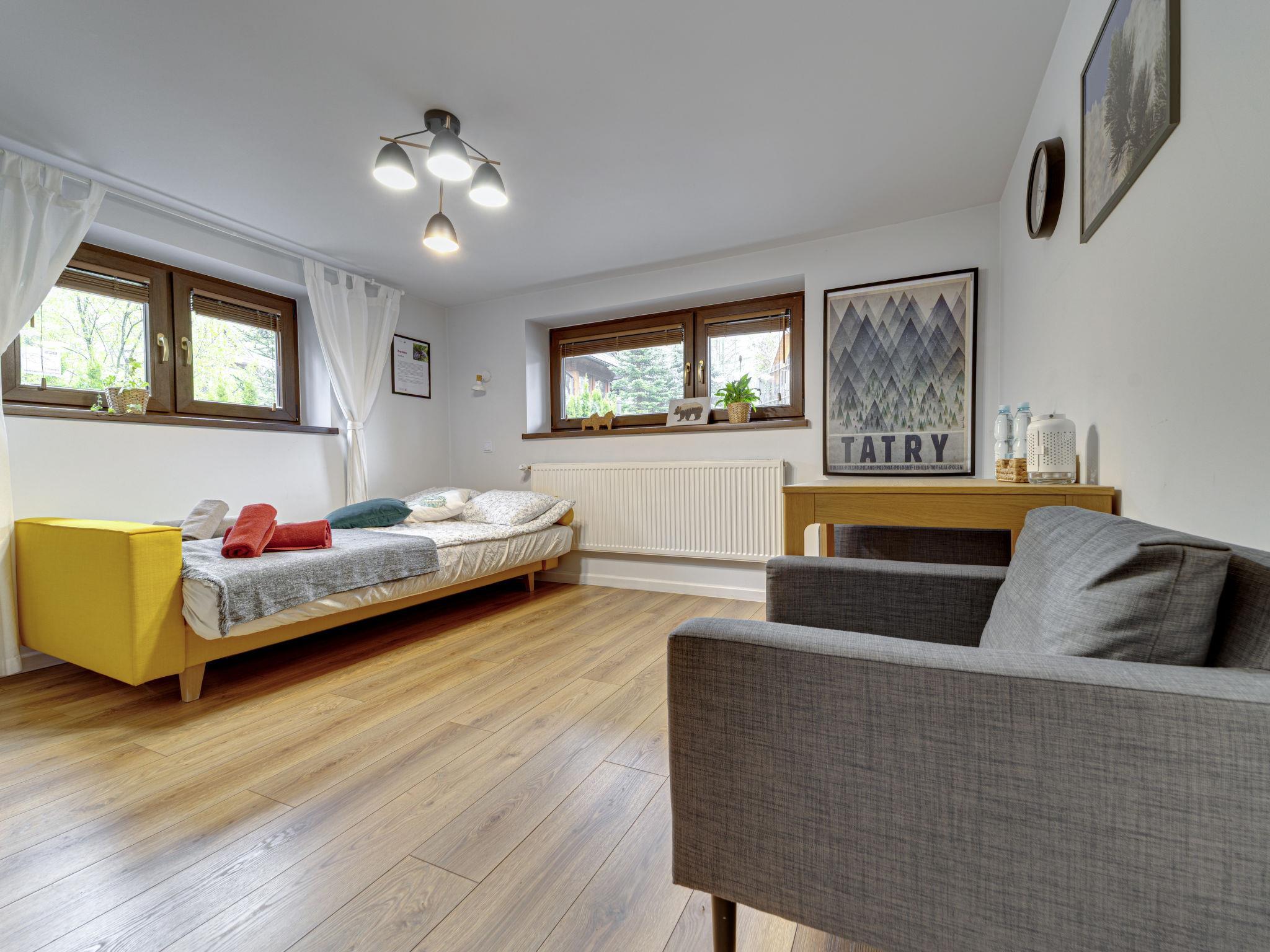 Modern, cosy chalet "Gosciniec Skorusa", 3 storeys, built in 1995, renovated in 2022. In a sunny position, 5500 km from the lake, in the countryside. Private: property 1'300 m2, garden 500 m2. Arbour (15 m2), pergola (15 m2), garden furniture, barbecue, barbecue house, children's playground (swing). In the house: WiFi, central heating system, burglar alarm system, washing machine, tumble dryer, ski boot dryer. Steep motor access. Parking (for 8 cars) at the house. Shop 2 km, grocery 100 m, supermarket 2 km, restaurant 800 m, bus stop 200 m, railway station 8 km, pebble beach 4.5 km, indoor swimming pool 9 km, swimming bay 5.5 km, public bathing area 4.5 km. Tennis 8 km, riding stable 800 m, cable car 9 km, ski lift 4 km, ice rink 9 km. Nearby attractions: Tatra National Park 600 m, Polana Strazyska 4.8 km, Zjezdzalnia grawitacyjna 5 km. Well-known ski regions can easily be reached: Chotarz 2.5 km, Polana Butowy Wierch 4 km, Zakopane 7 km. The cross-country skiing routes of the Koscielisko-Kiry biathlon center are located 20 m from the building, availability of 8 km of ski-in-out routes. The facility may employ staff to maintain the area in summer and refresh it in winter.