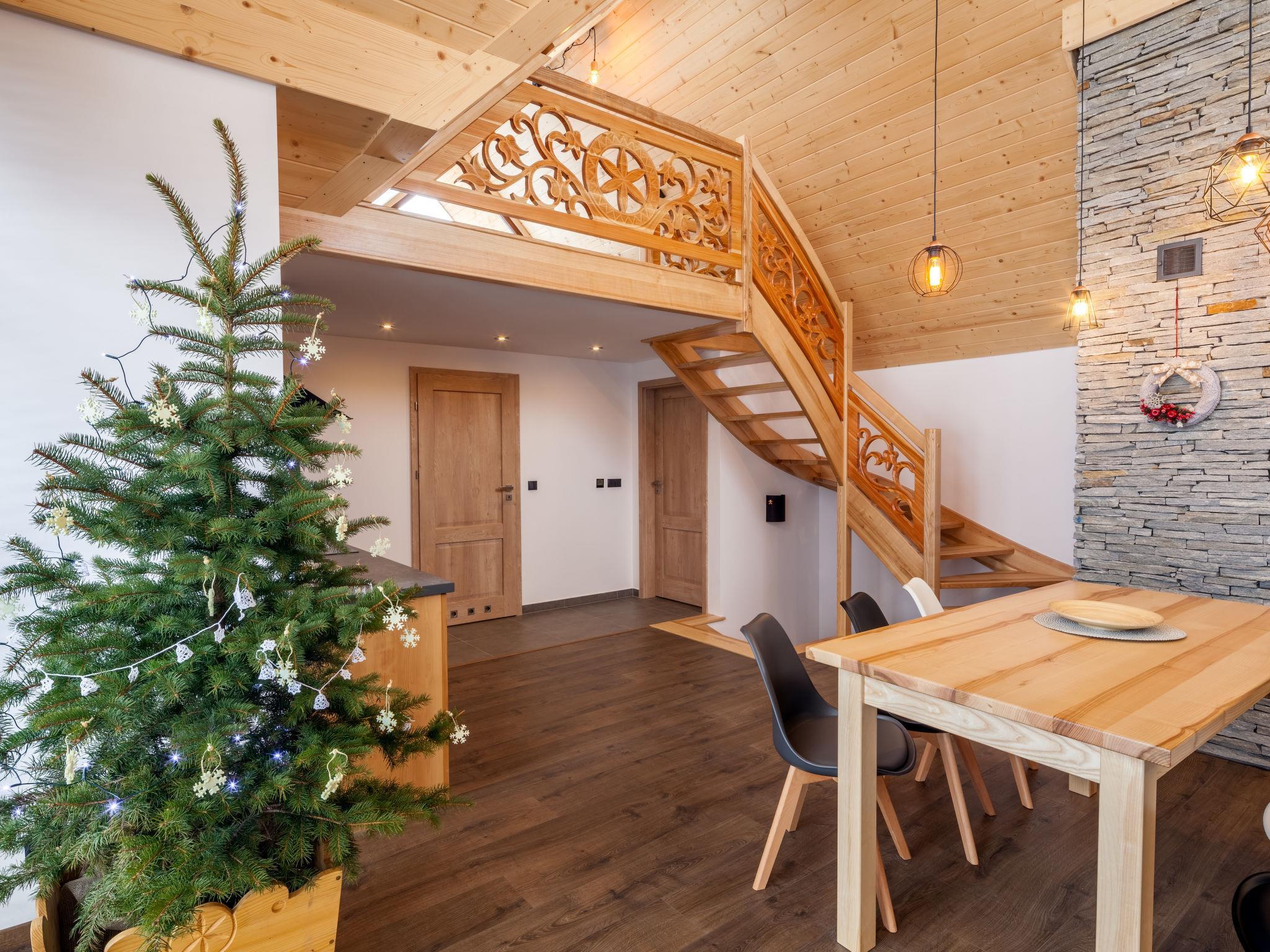 "Lilia", 3-room chalet 120 m2 on 2 levels. Partly with sloping ceilings, comfortable furnishings: open gallery with 2 beds, 1 sofabed and flat screen. Open kitchen (dishwasher, 2 ceramic glass hob hotplates, electric coffee machine) with dining table. Shower/WC. Electric heating. Upper floor: 1 room with 1 double bed and shower/WC. Exit to the terrace. 1 room with 2 beds and separate WC. Exit to the terrace. Balcony, terrace. Terrace furniture, barbecue. Beautiful view of the mountains and the resort. Facilities: Internet (WiFi). Parking at the house. Please note: maximum 1 pet/ dog allowed. Smoke alarm. A total of 3 rooms: an open living room with a gallery with 2 beds and 2 separate bedrooms upstairs. One parking space available next to the house, other cars park 100 meters below in the parking lot indicated by the resident. Advance reservation and additional fee required. Instead of an enclosed bedroom, some sleeping areas are located in an open-plan area (gallery, alcove, etc.).