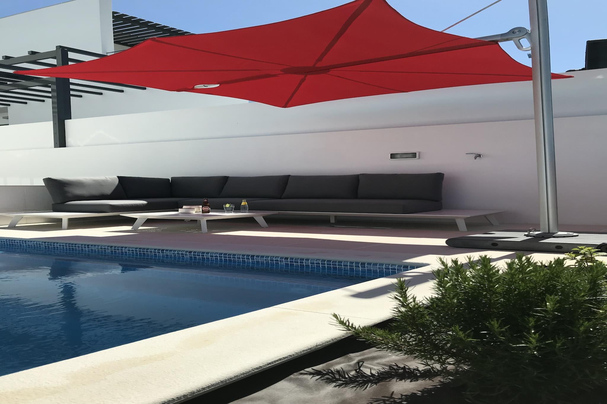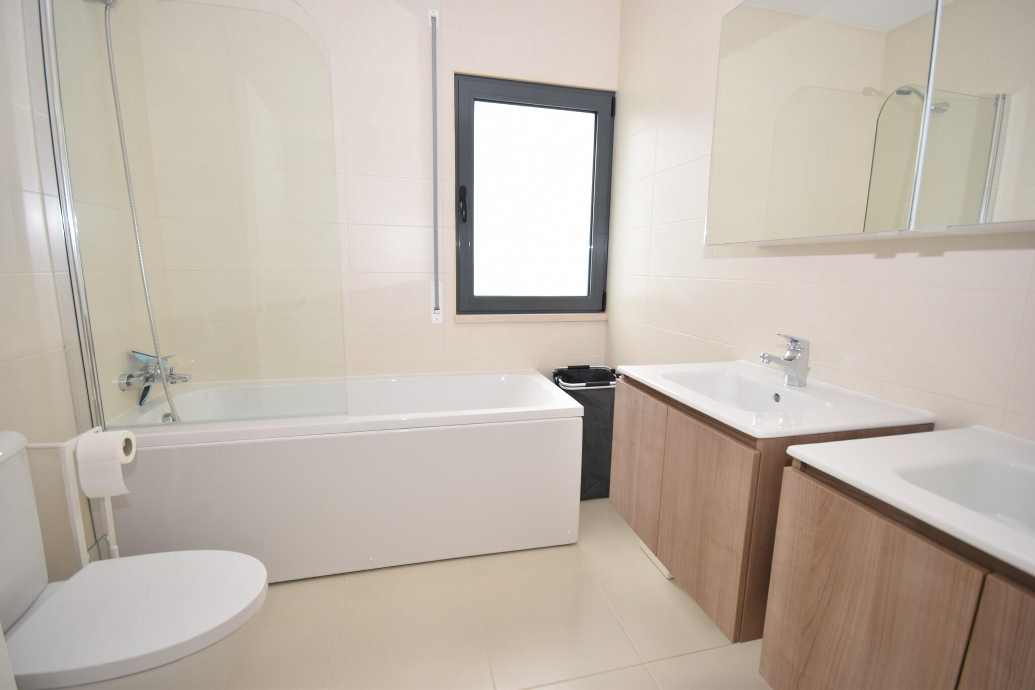 Ground floor: (open kitchen(hob(induction), electric kettle, coffee machine(pads), oven, microwave, dishwasher, fridge-freezer), Living/diningroom(TV(international television channels), dining table, seating area), bedroom(double bed(160 x 200 cm)), bathroom(bathtub with shower, 2x washbasin, toilet)) On the 1st floor: (bedroom(double bed(150 x 200 cm), balcony), bedroom(2x single bed(90 x 200 cm), balcony), bathroom(shower, washbasin, toilet, bidet)) washing machine, air conditioning, terrace, garden furniture, sun loungers, swimming pool(private, heated, 9 x 3 m.), children's bed, high chair