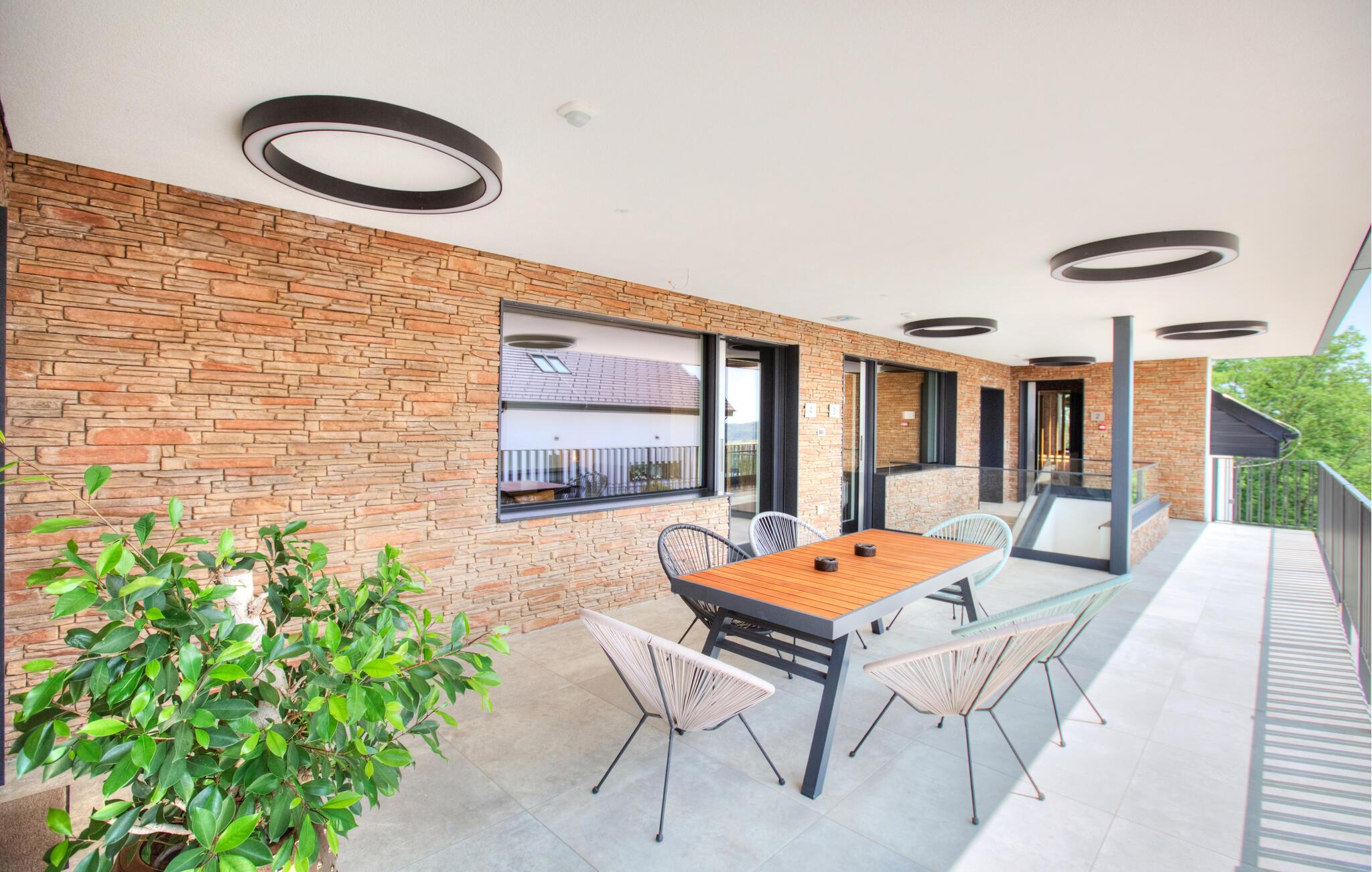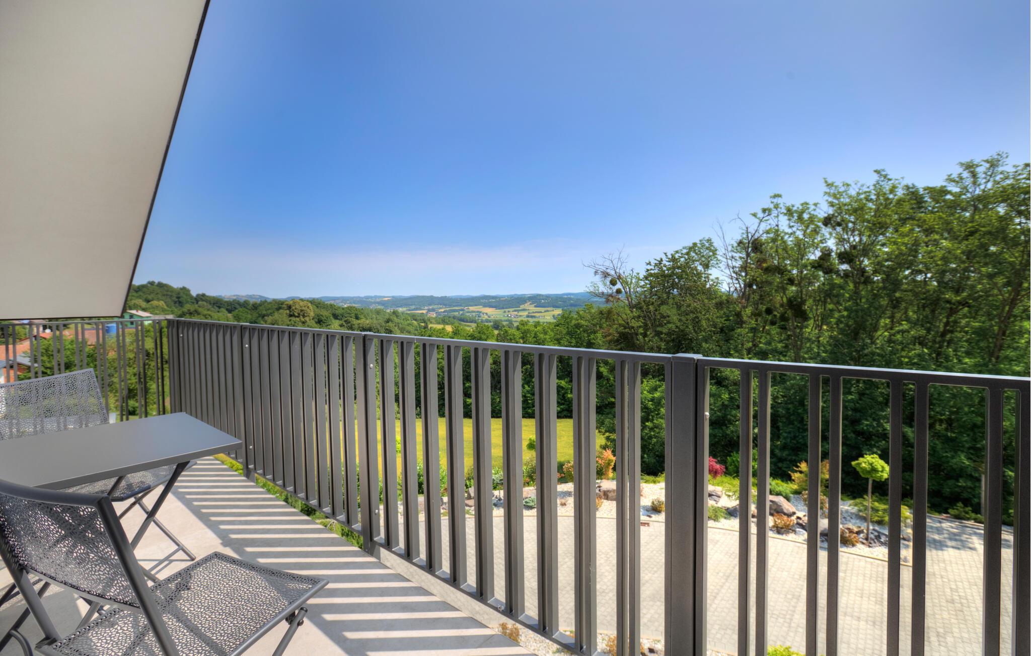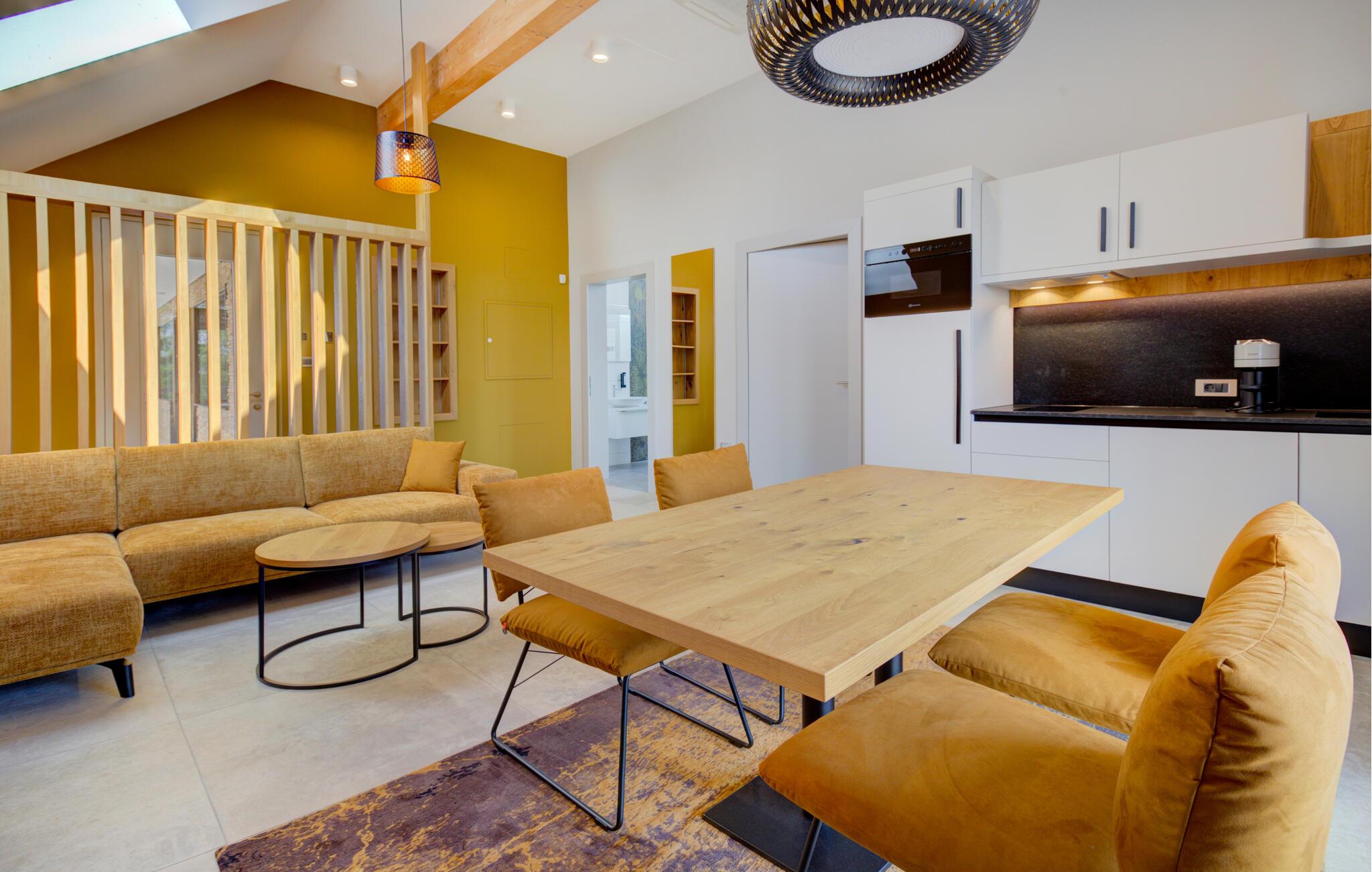 Verbringen Sie entspannte Tage zu zweit in dieser eleganten Ferienwohnung im ersten Stock, die sich auf einem großzügigen Anwesen mitten in einer grünen Hügellandschaft befindet. Freuen Sie sich auf Erholung, Komfort und eine moderne Ausstattung inmitten ruhiger Natur. Richten Sie sich im hellen Wohn- und Essbereich und entspannen Sie sich auf dem gemütlichen Sofa. Neben einer wundervollen Aussicht bietet Ihnen Ihre Wohnung auch einen gemeinschaftlich zugänglichen Wellnessbereich mit Sauna, Indoorpool und Fitnessraum für eine erholsame Auszeit.