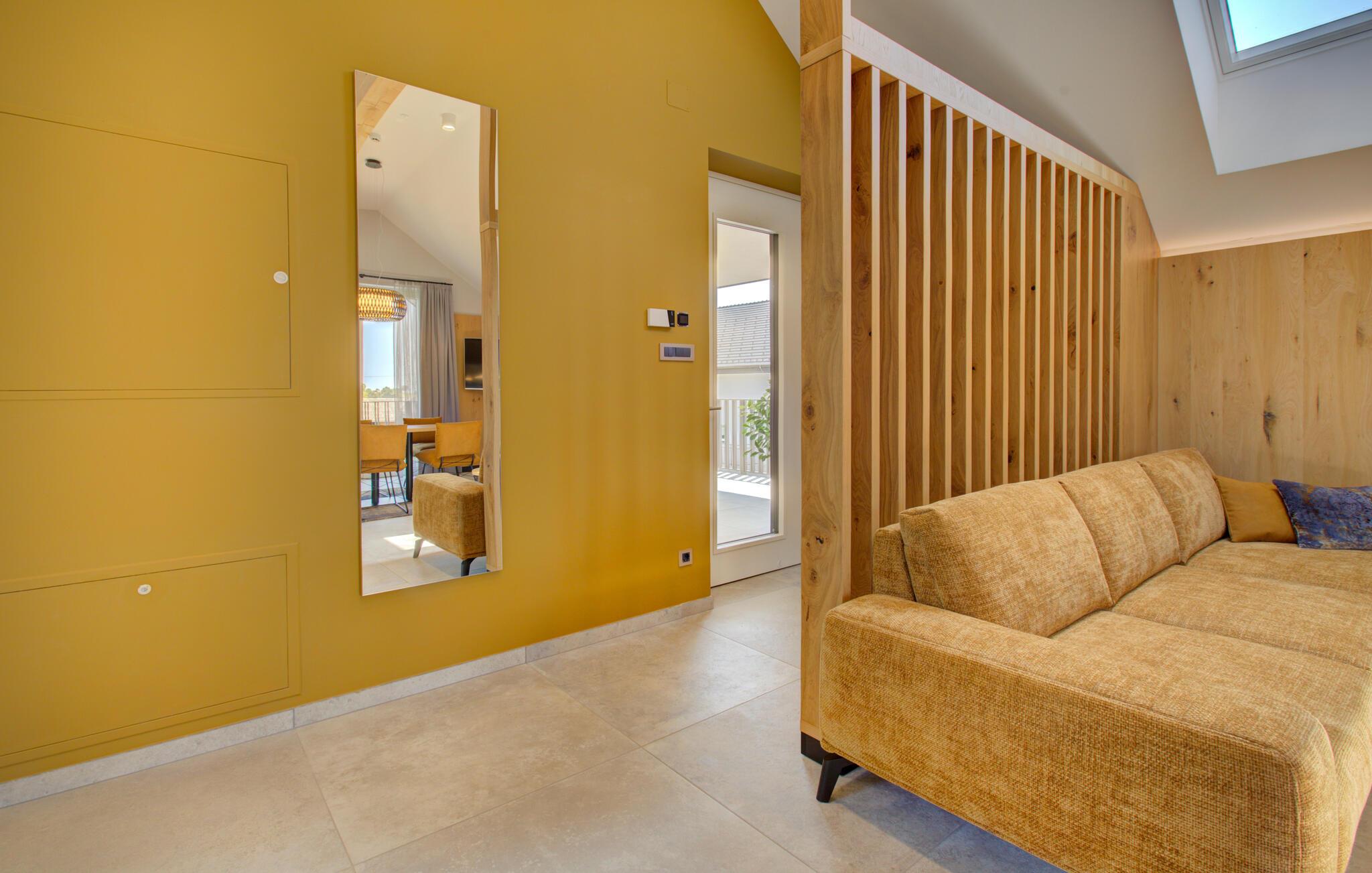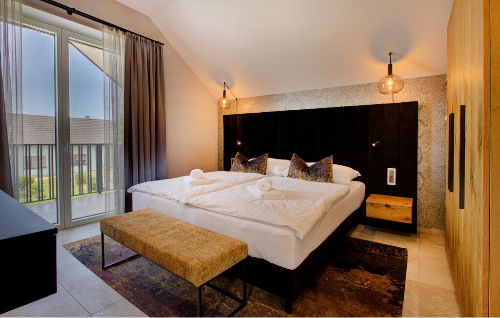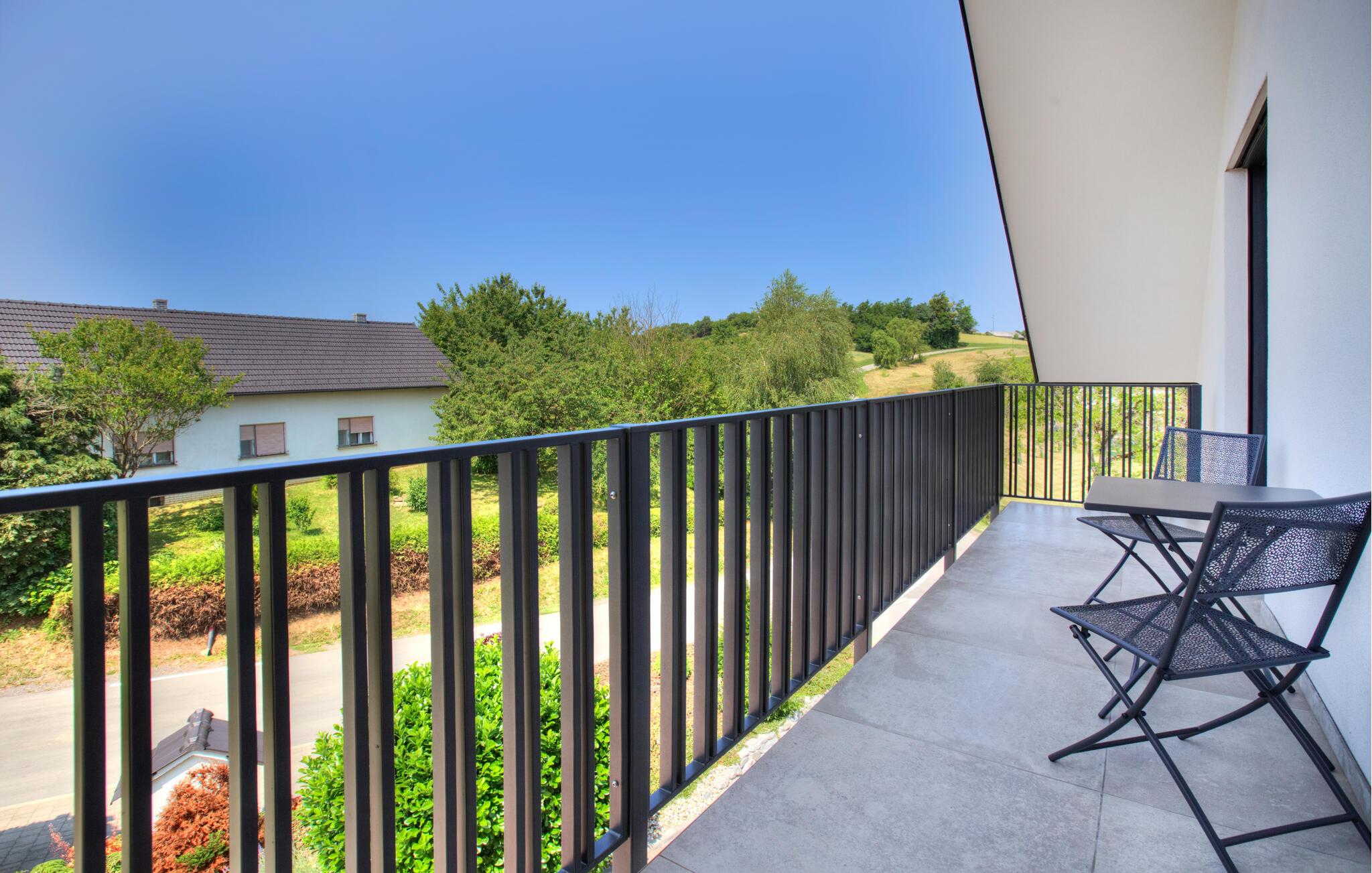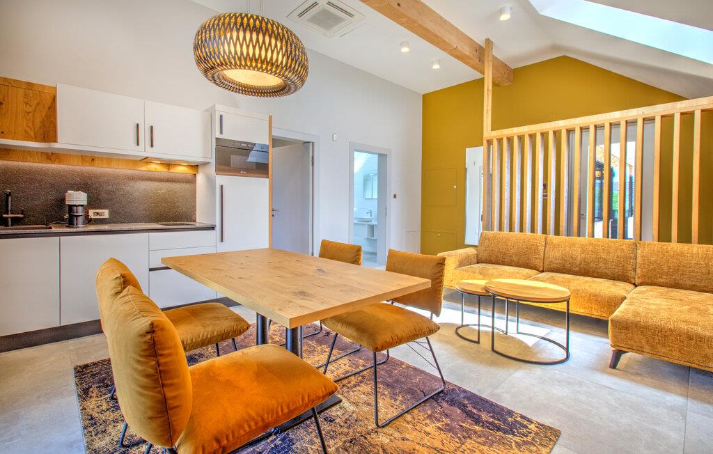 Verbringen Sie entspannte Tage zu zweit in dieser eleganten Ferienwohnung im ersten Stock, die sich auf einem großzügigen Anwesen mitten in einer grünen Hügellandschaft befindet. Freuen Sie sich auf Erholung, Komfort und eine moderne Ausstattung inmitten ruhiger Natur. Richten Sie sich im hellen Wohn- und Essbereich und entspannen Sie sich auf dem gemütlichen Sofa. Neben einer wundervollen Aussicht bietet Ihnen Ihre Wohnung auch einen gemeinschaftlich zugänglichen Wellnessbereich mit Sauna, Indoorpool und Fitnessraum für eine erholsame Auszeit.