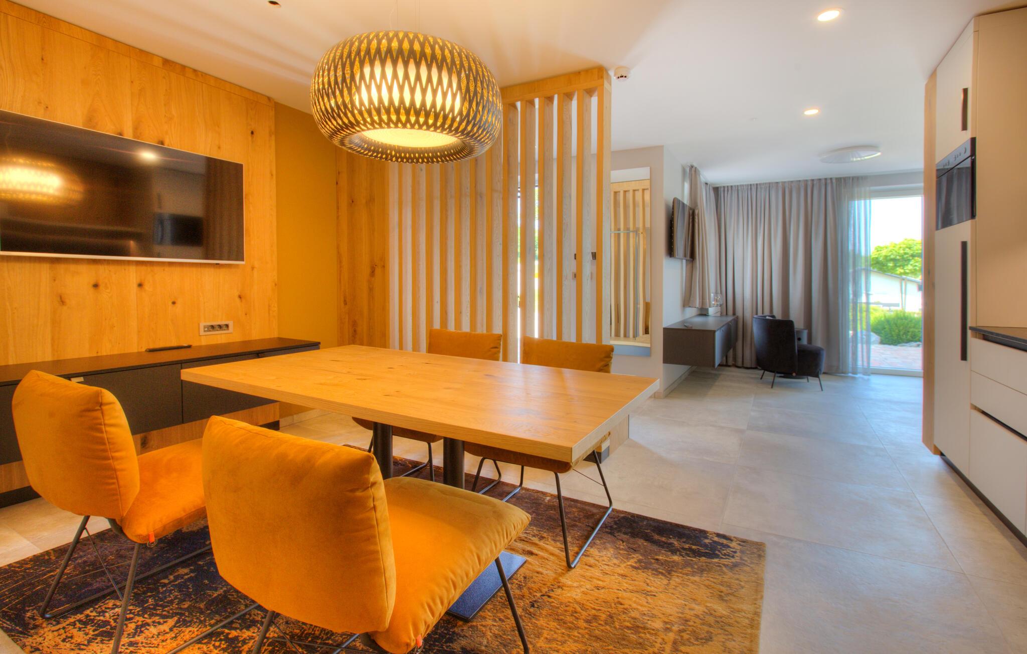 Verbringen Sie entspannte Tage zu zweit in dieser eleganten Ferienwohnung im ersten Stock, die sich auf einem großzügigen Anwesen mitten in einer grünen Hügellandschaft befindet. Freuen Sie sich auf Erholung, Komfort und eine moderne Ausstattung inmitten ruhiger Natur. Richten Sie sich im hellen Wohn- und Essbereich und entspannen Sie sich auf dem gemütlichen Sofa. Neben einer wundervollen Aussicht bietet Ihnen Ihre Wohnung auch einen gemeinschaftlich zugänglichen Wellnessbereich mit Sauna, Indoorpool und Fitnessraum für eine erholsame Auszeit.