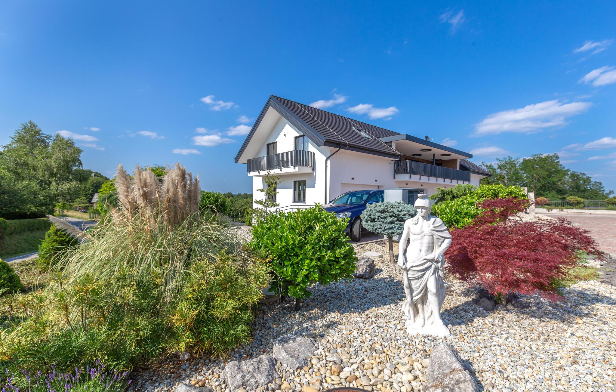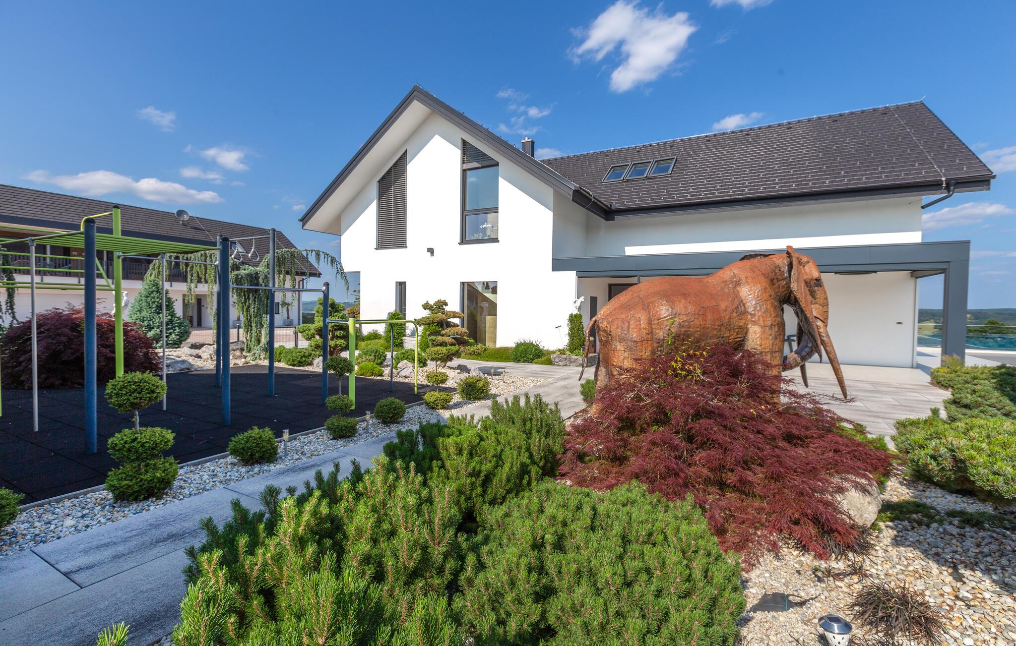Verbringen Sie entspannte Tage zu zweit in dieser eleganten Ferienwohnung im ersten Stock, die sich auf einem großzügigen Anwesen mitten in einer grünen Hügellandschaft befindet. Freuen Sie sich auf Erholung, Komfort und eine moderne Ausstattung inmitten ruhiger Natur. Richten Sie sich im hellen Wohn- und Essbereich und entspannen Sie sich auf dem gemütlichen Sofa. Neben einer wundervollen Aussicht bietet Ihnen Ihre Wohnung auch einen gemeinschaftlich zugänglichen Wellnessbereich mit Sauna, Indoorpool und Fitnessraum für eine erholsame Auszeit.