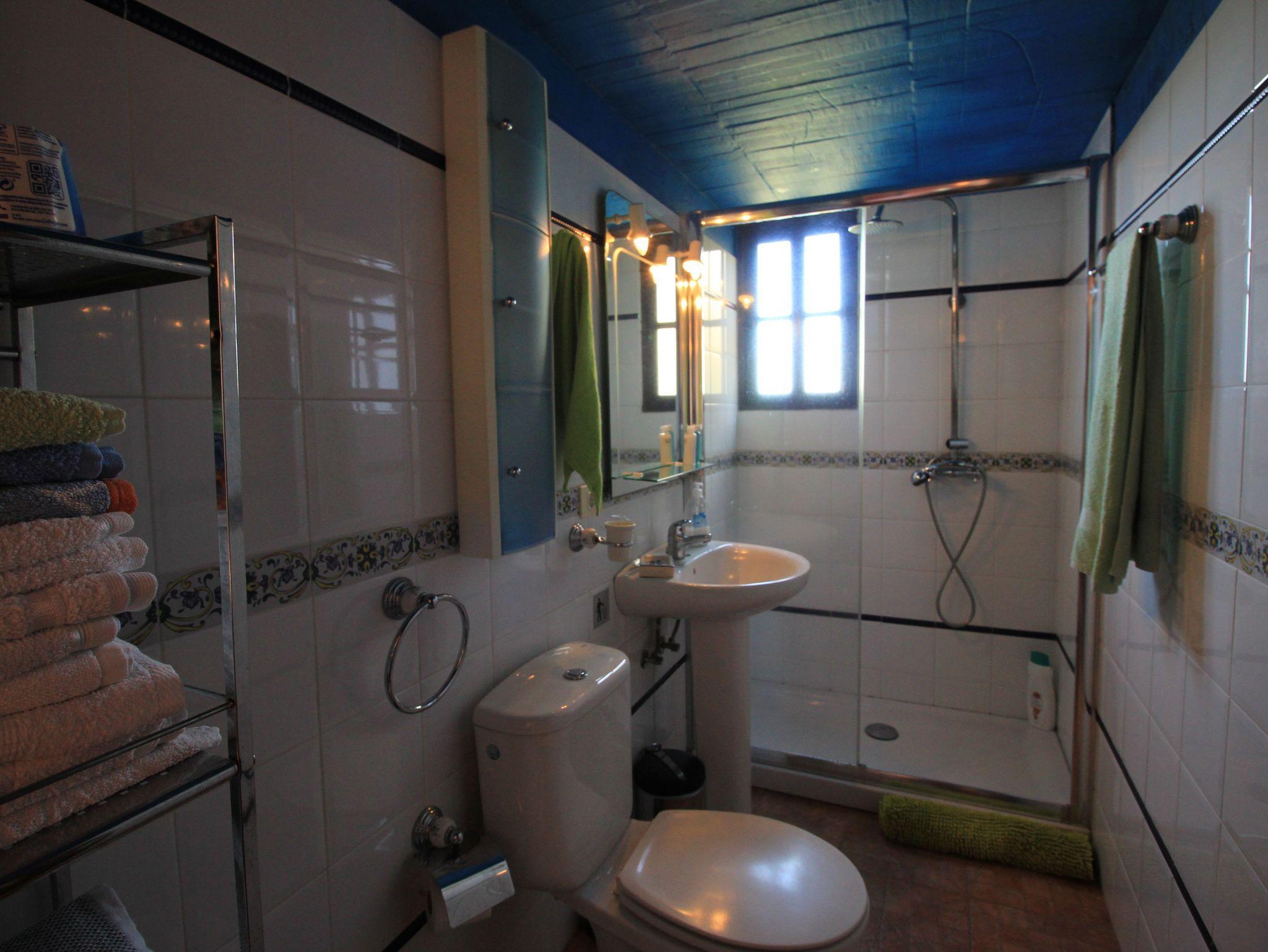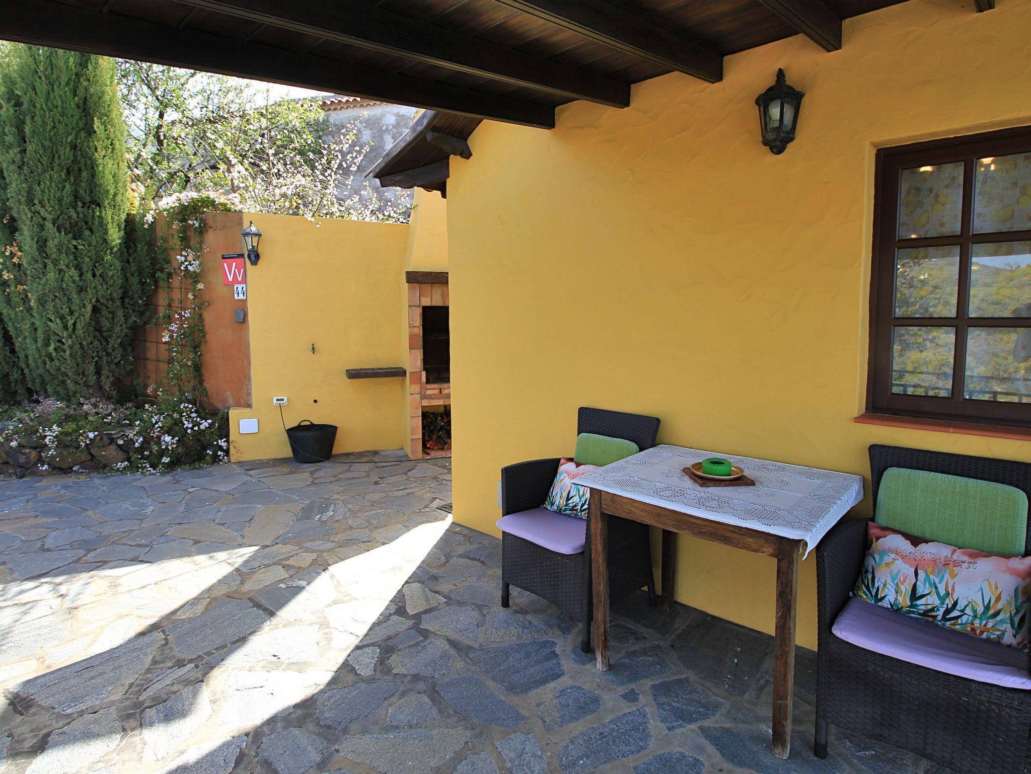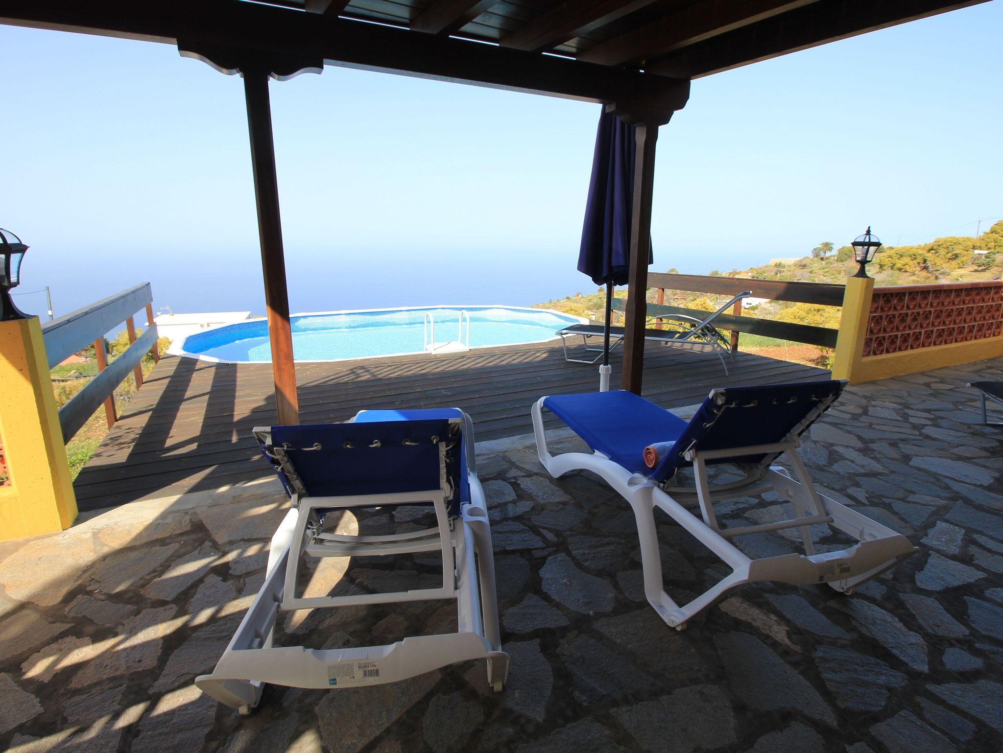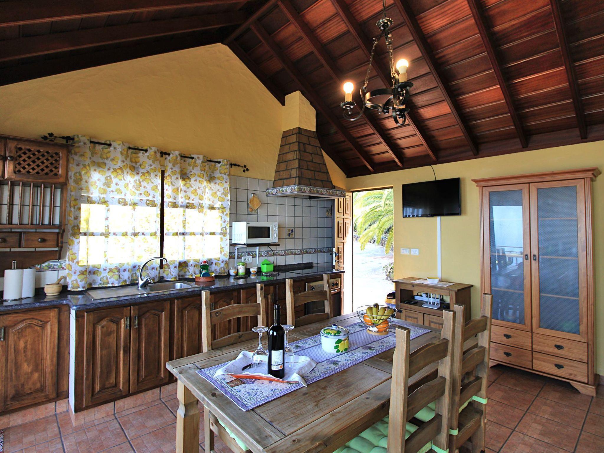 Beim Eingang hinter dem Haus und direkt an der Küche befindet sich ein gemauerter Grill sowie ein grosser Steinterrassenbereich mit überdachtem Sitzplatz. Betreten Sie die Unterkunft, kommen Sie in den Wohnraum mit offener Küche und kanarischer Holzdecke. Ein grosser Esstisch aus Holz steht in der Mitte des Raumes, seitlich befindet sich das Sofa. In diesem Raum finden Sie auch den Fernseher. Davor liegt eine weitere Holzterrasse mit Sitzgelegenheiten und beeindruckendem Meerblick. Zur Linken führt eine Treppe zur Pool-Ebene.