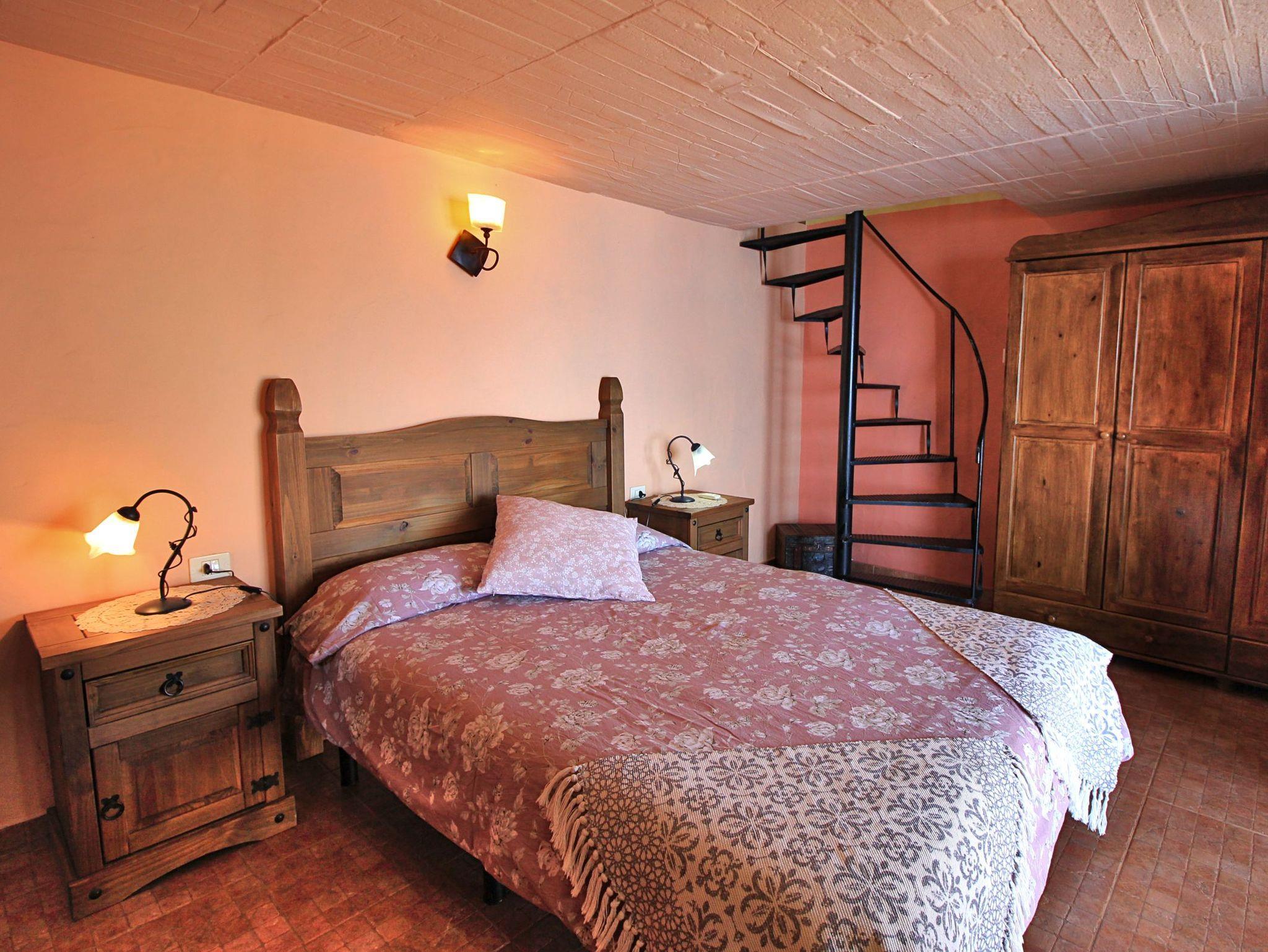 Es ist ebenfalls im rustikalen Stil möbliert und dazu passend in einem alt-rosa Ton gehalten. Neben dem Doppelbett mit Nachtschränkchen finden Sie hier einen großen Kleiderschrank sowie eine Kommode. Das Bad mit Dusche schließt sich dem Schlafzimmer an. Auf dieser Ebene befindet sich die Poolterrasse. Sie könnten, wenn Sie möchten, am Morgen direkt aus dem Bett ins Nass springen. Der Bereich vor dem Schlafzimmer ist mit einer Holzpergola überdacht. Mehrere Liegestühle und Sitzmöglichkeiten stehen Ihnen hier zum Sonnen, Lesen und die Seele baumeln lassen zur Verfügung.