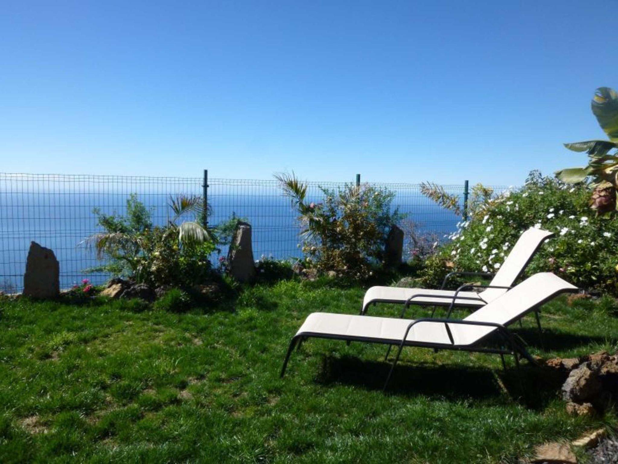 Der gepflegt angelegte Aussenbereich mit unverbautem Meerblick bietet zwei möblierte Terrassen (teilüberdacht), eine vor dem Schlafzimmer und eine vor dem Wohnbereich. Die Türen können aufgeschoben werden daher ist das Haus schön hell und man hat direkten Zugang zum Garten und Pool. Der Pool (6 x 3m) kann gegen Extragebühren beheizt werden. Beim Sonnenbad auf den zahlreichen Liegestühlen hat man einen sehr schönen Blick auf die Westküste und das Meer. Ein Grill steht den Gästen auch zur Verfügung.