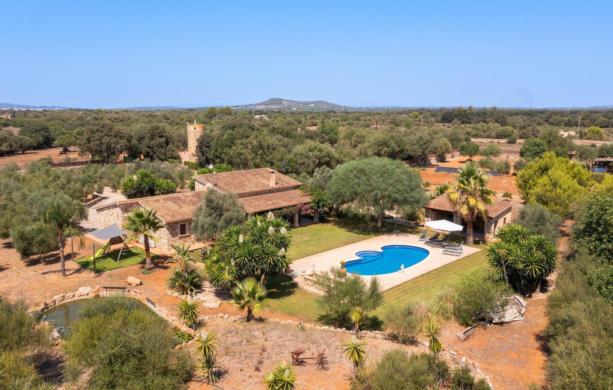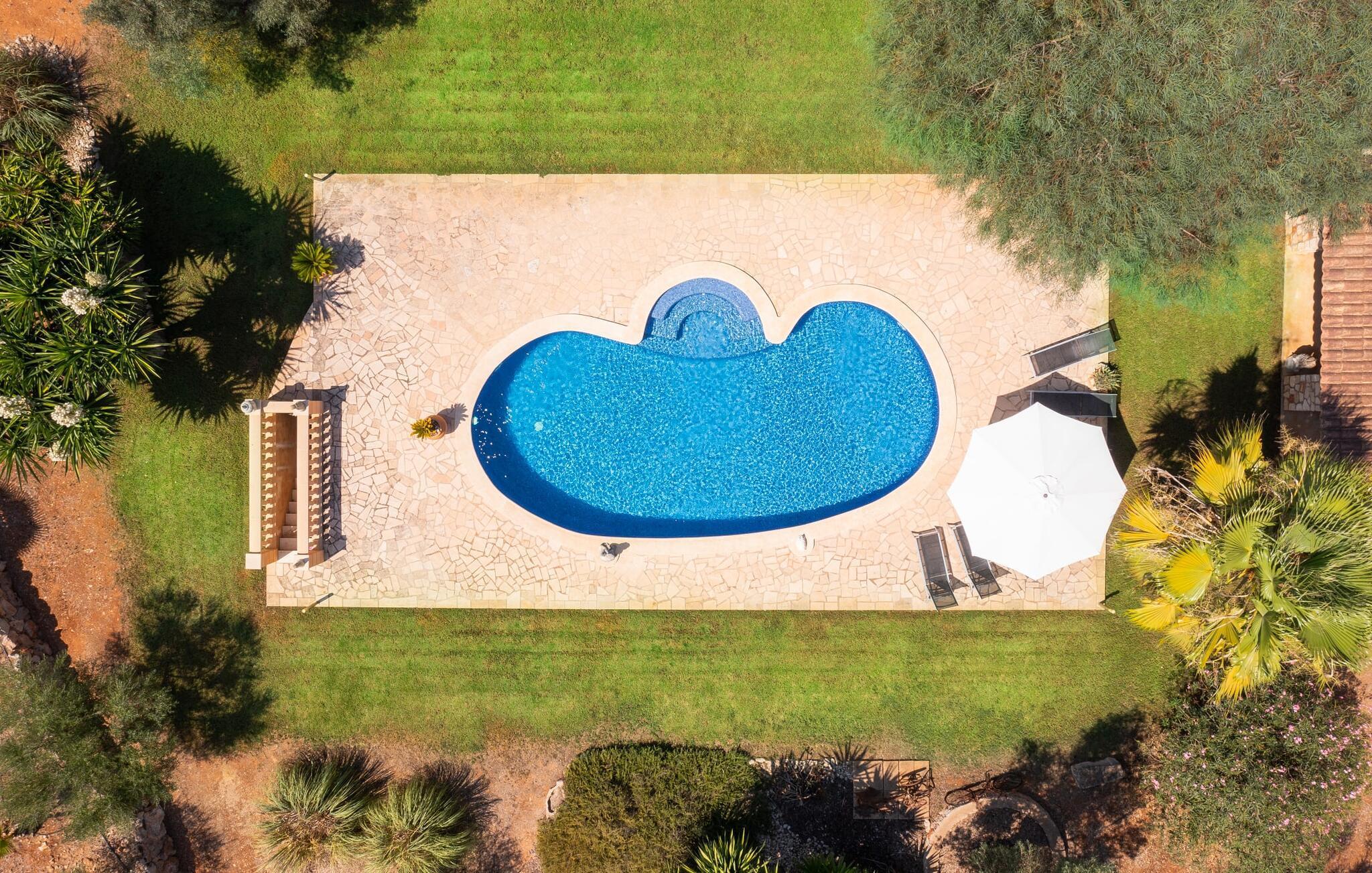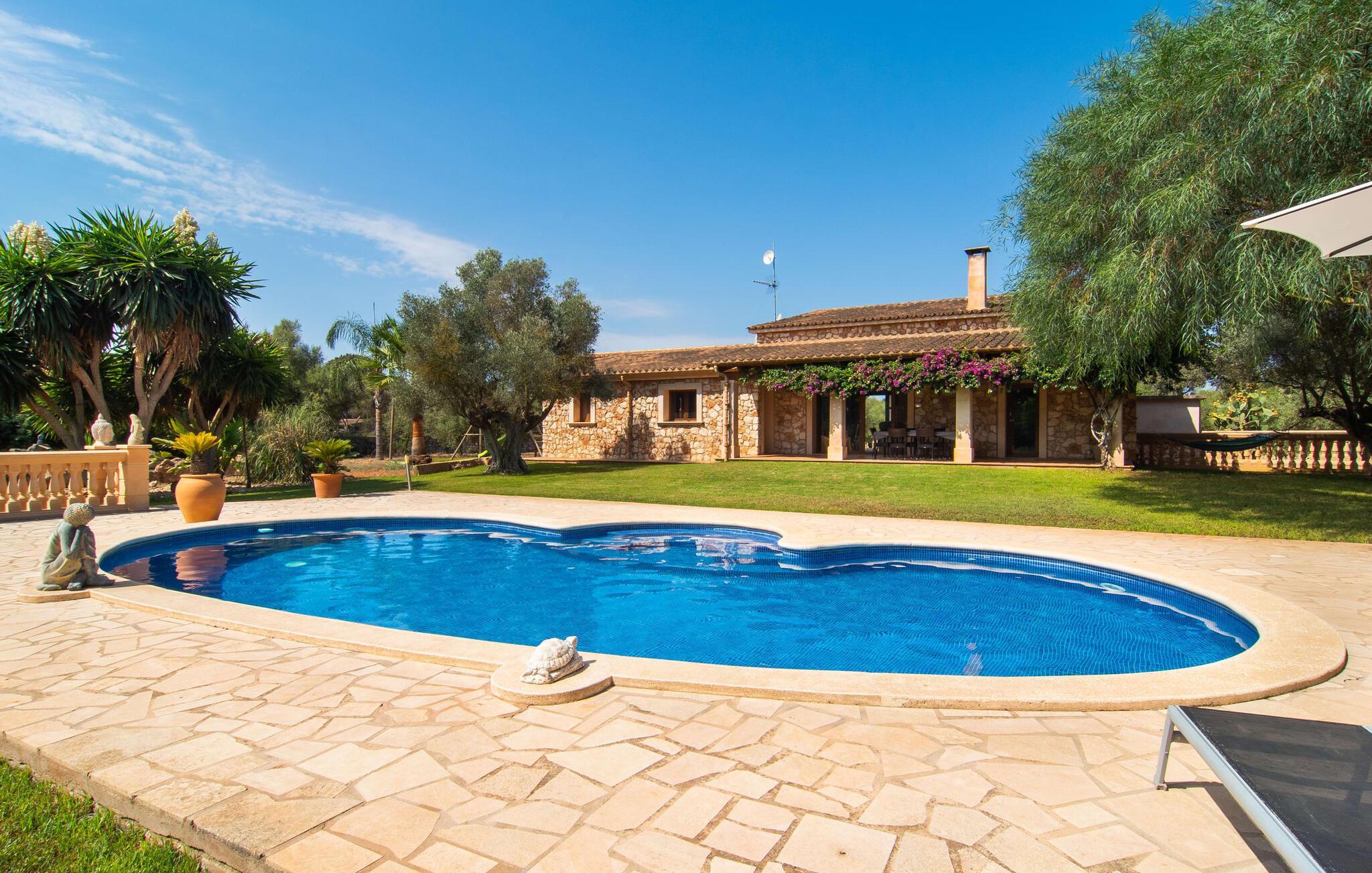 Sind Sie ein Mallorca-Fan und auf der Suche nach Ruhe und Frieden? Oder möchtest du es sein? Lesen Sie in jedem Fall weiter – es wird sich lohnen. Die Villa „Ailen“ bietet einen oasenähnlichen Ort, an dem Sie ungestörten Komfort und Entspannung genießen können, ohne auf die Anbindung an die Infrastruktur der Insel verzichten zu müssen. Das mit Mandel- und Olivenbäumen übersäte Anwesen liegt in ländlicher Umgebung, umgeben von Feldern und weiten Freiflächen. Sie werden es kaum erwarten können, im schönen Garten Platz zu nehmen, der von einer wunderschönen grünen Rasenfläche geschmückt ist, wo Sie sitzen, sich zurücklehnen oder den Kindern beim Spielen zusehen können. Der große Pool in seiner ursprünglichen Form ist mit hübschen, tiefblauen Mosaiken gefliest und lädt an heißen Tagen zu einem langen Bad ein. Er ist über 11 m lang und variiert in der Tiefe von angenehmen 1,2 m bis hin zu 1,7 m. Über eine halbrunde Treppe gelangt man bequem zum Pool, wo sich auch ein toller Whirlpool befindet. Auf der umlaufenden Terrasse, die mit Sonnenliegen und Sonnenschirm ausgestattet ist, findet jeder Sonnenanbeter ein Plätzchen nach seinem Geschmack. Die umliegenden Bäume schaffen eine wunderbar idyllische und malerische Atmosphäre, in der Sie leicht entspannen und loslassen können. Wer sich einen überdachten Sitzplatz an einem Tisch wünscht, findet direkt neben dem Haus den perfekten Platz. Sitzen Sie vor der Natursteinfassade, mit eleganten Fliesen unter Ihren Füßen und einer freiliegenden Balkendecke darüber – Sie werden feststellen, dass dies ein ausgezeichneter Ort für Mahlzeiten und mehr ist. Am Esstisch ist ausreichend Platz für alle. Ein weiterer überdachter Raum in der Nähe des Pools bildet den Grillbereich – perfekt, um an einem lauen Abend zusammenzukommen und etwas auf den Grill zu werfen. Praktischerweise verfügt der Außenbereich auch über ein kleines WC.