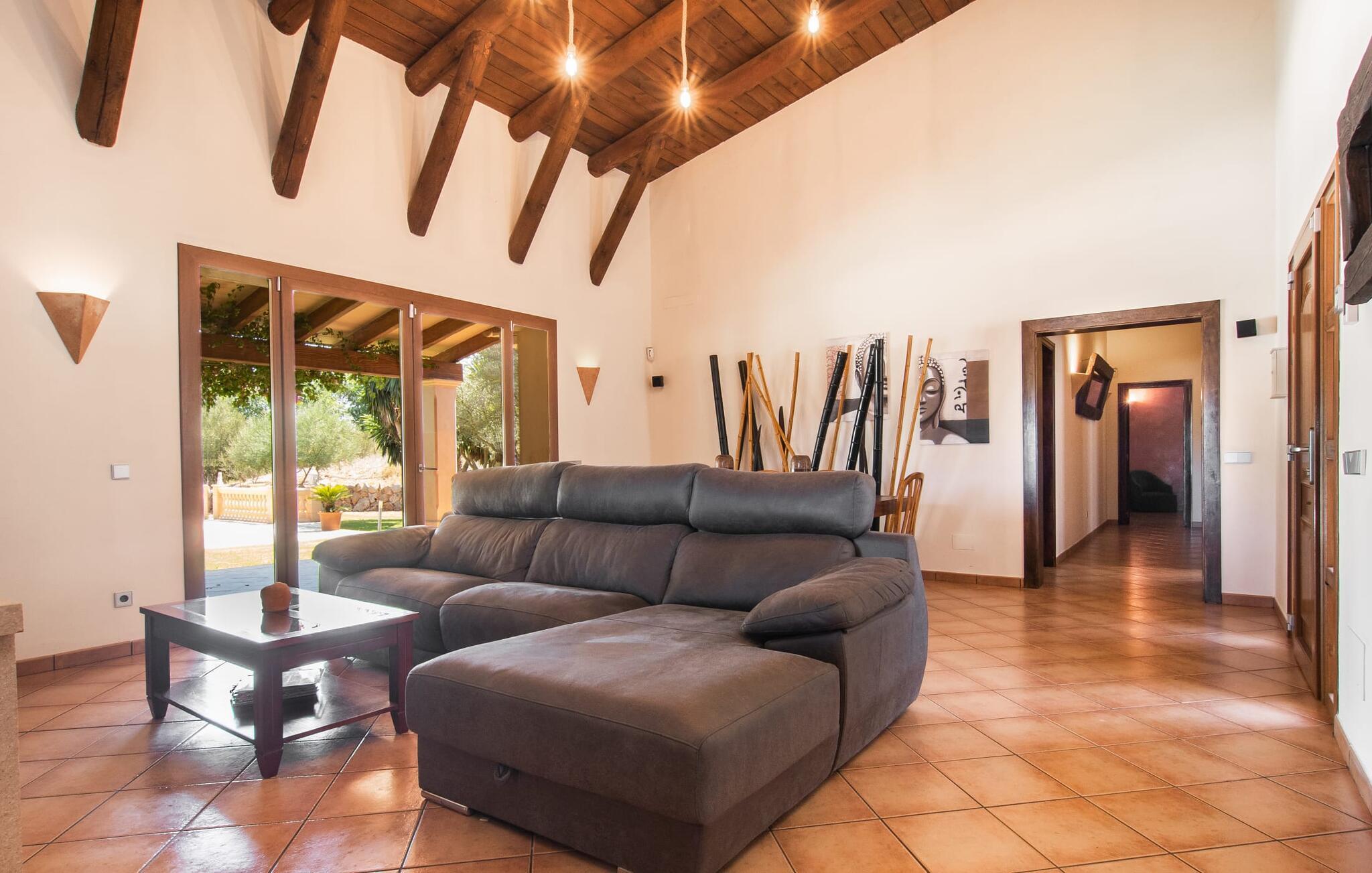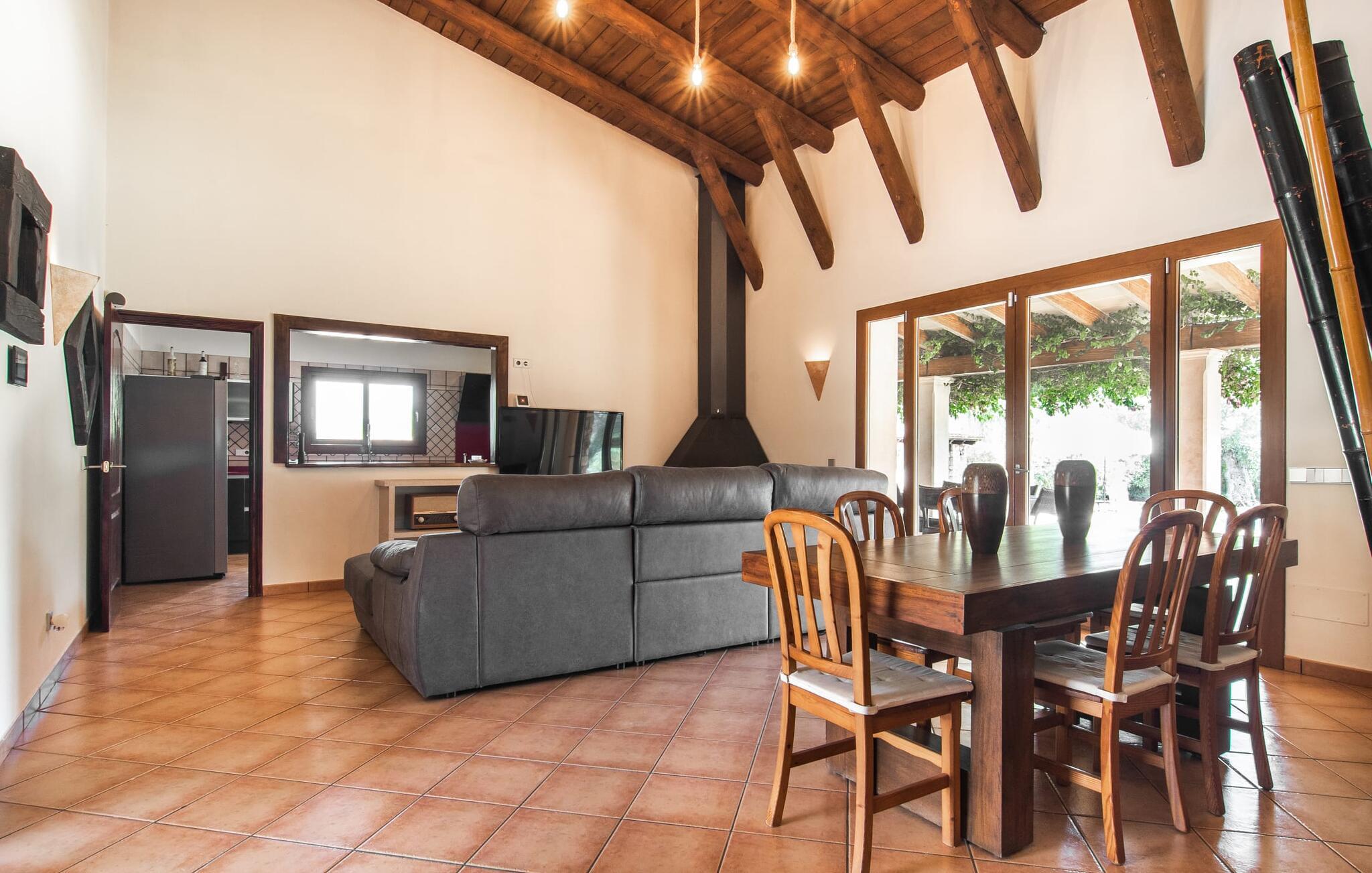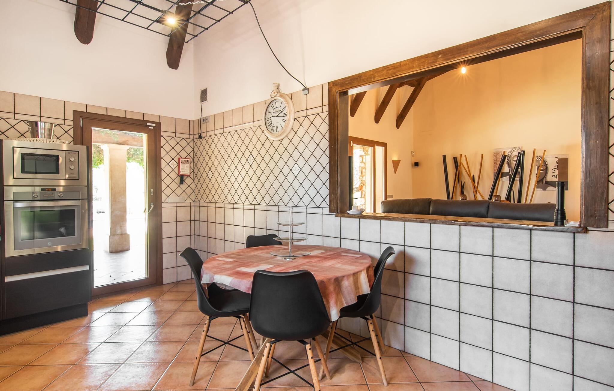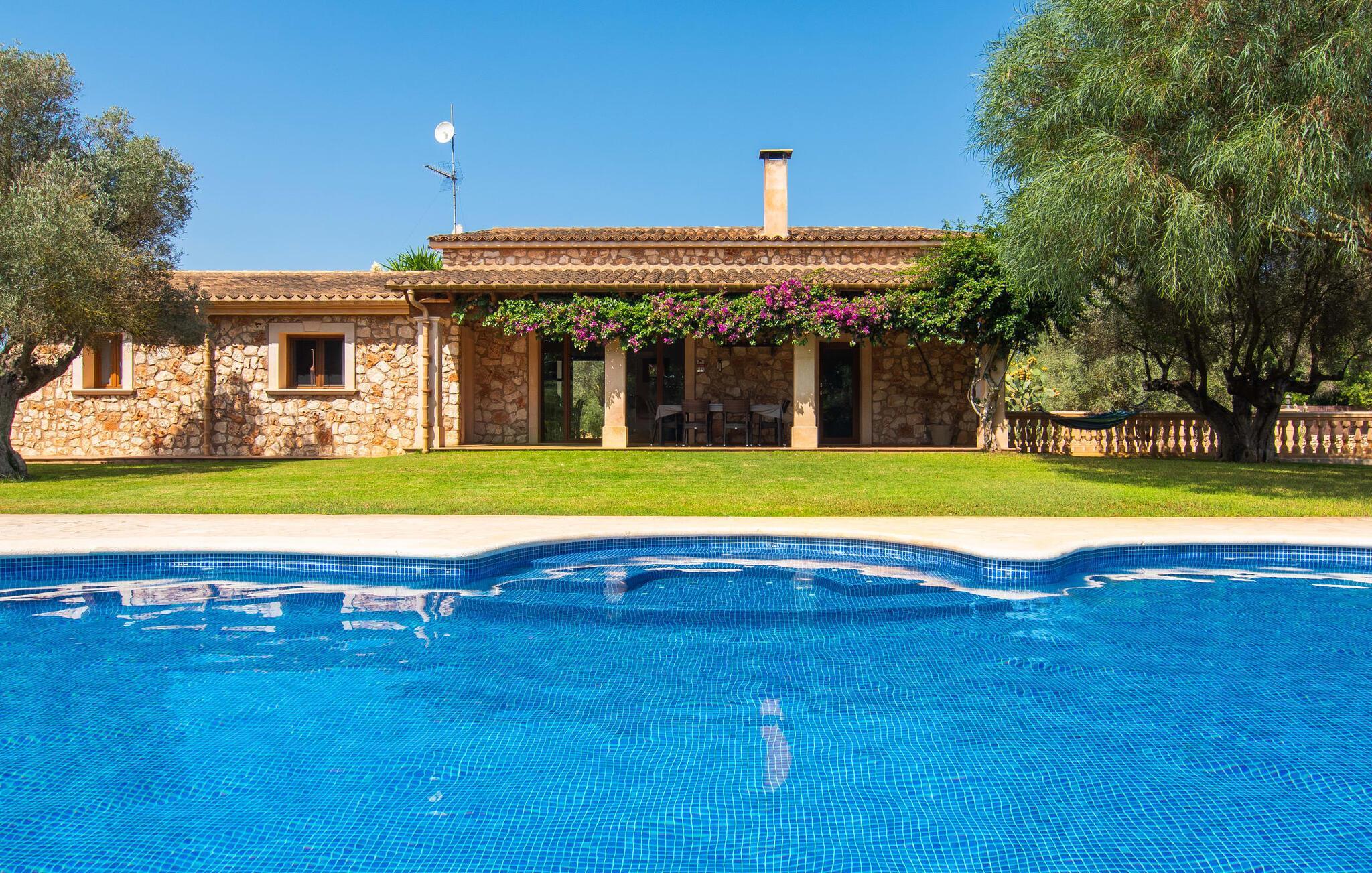 Sind Sie ein Mallorca-Fan und auf der Suche nach Ruhe und Frieden? Oder möchtest du es sein? Lesen Sie in jedem Fall weiter – es wird sich lohnen. Die Villa „Ailen“ bietet einen oasenähnlichen Ort, an dem Sie ungestörten Komfort und Entspannung genießen können, ohne auf die Anbindung an die Infrastruktur der Insel verzichten zu müssen. Das mit Mandel- und Olivenbäumen übersäte Anwesen liegt in ländlicher Umgebung, umgeben von Feldern und weiten Freiflächen. Sie werden es kaum erwarten können, im schönen Garten Platz zu nehmen, der von einer wunderschönen grünen Rasenfläche geschmückt ist, wo Sie sitzen, sich zurücklehnen oder den Kindern beim Spielen zusehen können. Der große Pool in seiner ursprünglichen Form ist mit hübschen, tiefblauen Mosaiken gefliest und lädt an heißen Tagen zu einem langen Bad ein. Er ist über 11 m lang und variiert in der Tiefe von angenehmen 1,2 m bis hin zu 1,7 m. Über eine halbrunde Treppe gelangt man bequem zum Pool, wo sich auch ein toller Whirlpool befindet. Auf der umlaufenden Terrasse, die mit Sonnenliegen und Sonnenschirm ausgestattet ist, findet jeder Sonnenanbeter ein Plätzchen nach seinem Geschmack. Die umliegenden Bäume schaffen eine wunderbar idyllische und malerische Atmosphäre, in der Sie leicht entspannen und loslassen können. Wer sich einen überdachten Sitzplatz an einem Tisch wünscht, findet direkt neben dem Haus den perfekten Platz. Sitzen Sie vor der Natursteinfassade, mit eleganten Fliesen unter Ihren Füßen und einer freiliegenden Balkendecke darüber – Sie werden feststellen, dass dies ein ausgezeichneter Ort für Mahlzeiten und mehr ist. Am Esstisch ist ausreichend Platz für alle. Ein weiterer überdachter Raum in der Nähe des Pools bildet den Grillbereich – perfekt, um an einem lauen Abend zusammenzukommen und etwas auf den Grill zu werfen. Praktischerweise verfügt der Außenbereich auch über ein kleines WC.