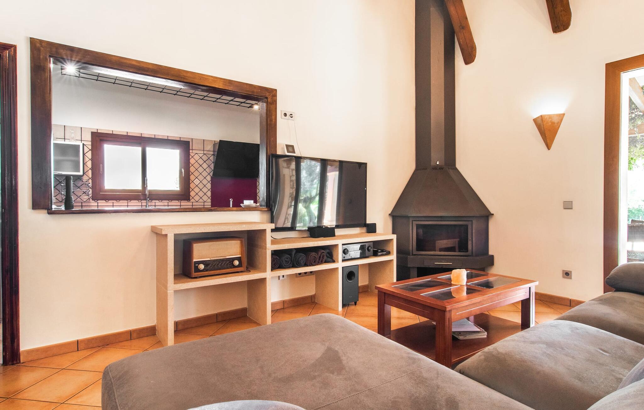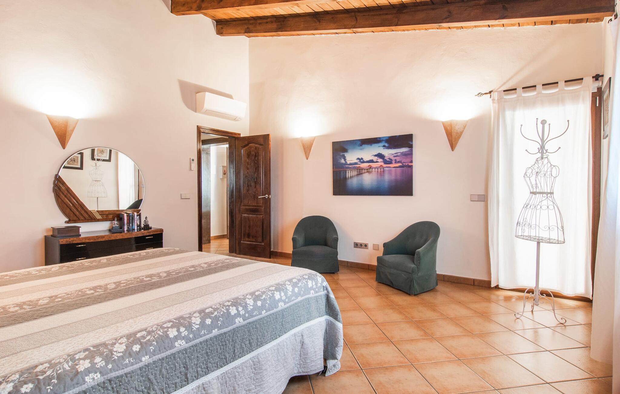 Eine angenehm helle Atmosphäre prägt das Innere der Villa. Naturfarbene Decken, Wände und Böden, ergänzt durch sorgfältig ausgewählte Möbel, sorgen für eine angenehme, harmonische Stimmung. Die große moderne Küche mit ihren magentafarbenen Arbeitsplatten bildet das Herzstück des Hauses. Es ist komplett ausgestattet, sodass Sie alle Vorteile der Selbstversorgung optimal nutzen können. Sowohl eine amerikanische als auch eine italienische Kaffeemaschine sorgen dafür, dass Sie beim morgendlichen Frühstück auf der Terrasse nicht auf Ihr bevorzugtes Heißgetränk verzichten müssen. Auch im Innenbereich ist der runde Tisch in der Küche ein gemütlicher Ort zum gemeinsamen Essen. Eine Besonderheit ist das originale Fenster zum Wohnzimmer, das zudem über einen attraktiven Essbereich und eine gemütliche Sofazone für ausgiebige Entspannungsmomente verfügt. Der große Flachbildfernseher mit Satellitenanschluss erfüllt alle Ansprüche an mediale Unterhaltung, während der Kamin für eine gemütliche Atmosphäre an kühlen Abenden sorgt. Ein Schlafzimmer im modernen Design mit eigenem Bad und begehbarem Kleiderschrank bietet ausreichend Platz; Die beiden anderen Schlafzimmer setzen auf ein fröhlich-rustikales Ambiente. Die beiden Badezimmer sind im modernen Stil ausgestattet und bieten ausreichend Platz für alle Mitreisenden.