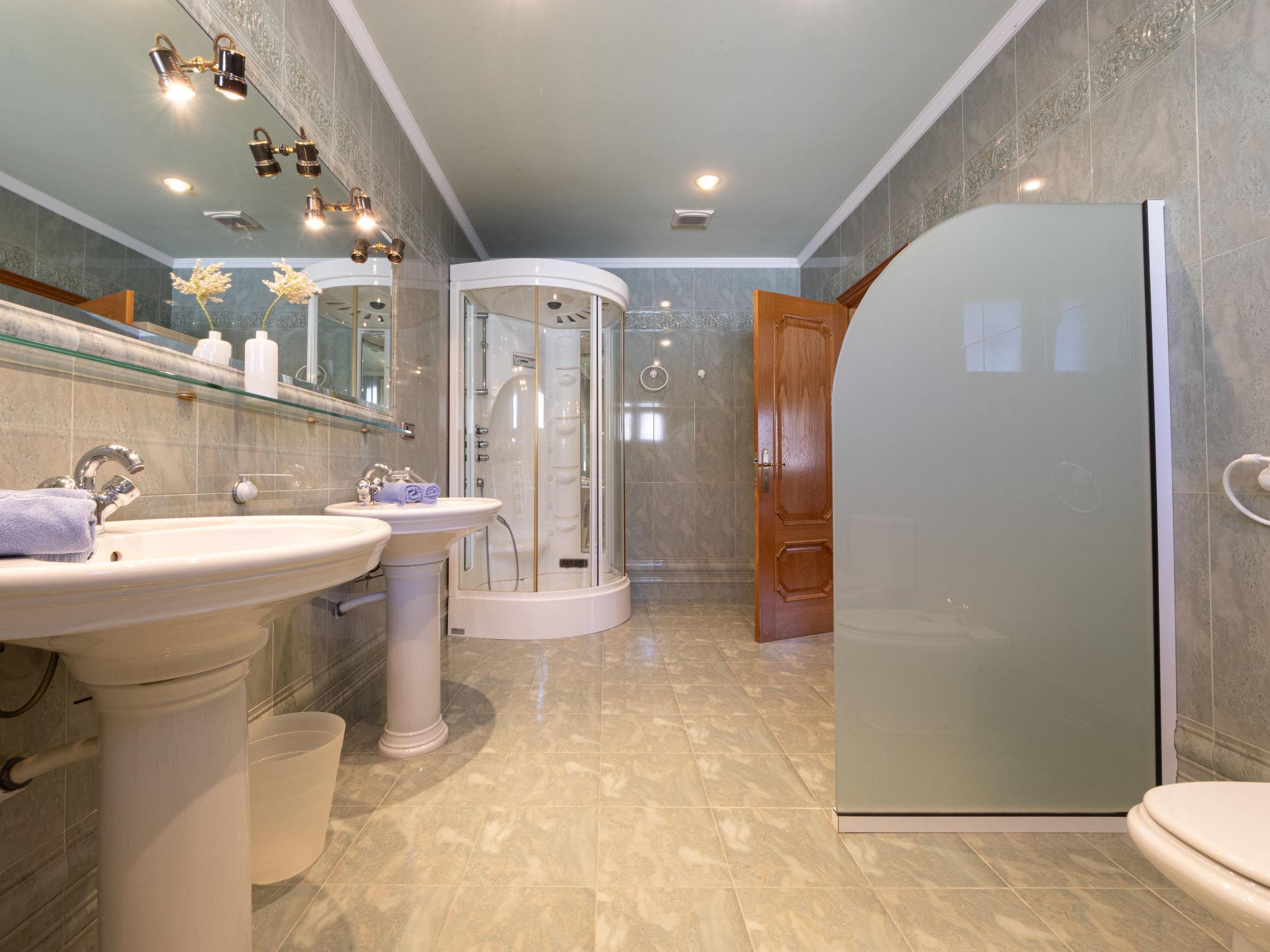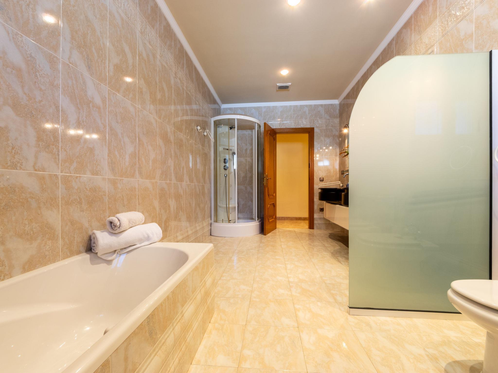 "Gladiols", 6-room house 168 m2. Comfortable furnishings: living/dining room with digital TV and air conditioning. 1 room with 1 french bed (1 x 150 cm, length 190 cm), shower/WC and forced-air heating. 1 room with 1 bed (90 cm, length 190 cm), 1 french bed (1 x 150 cm, length 190 cm), air conditioning and forced-air heating. 1 room with 1 bed (90 cm, length 190 cm), 1 french bed (1 x 150 cm, length 190 cm), air conditioning and forced-air heating. 1 room with 1 bed (90 cm, length 190 cm), 1 french bed (1 x 150 cm, length 190 cm), air conditioning and forced-air heating. 1 room with 1 bed (90 cm, length 190 cm), 1 french bed (1 x 150 cm, length 190 cm), air conditioning and forced-air heating. Large kitchen (dishwasher, 4 ceramic glass hob hotplates, toaster, kettle, microwave, freezer, electric coffee machine) with open-hearth fireplace (only for decoration). Bath/shower/bidet/WC. On the lower ground floor: shower/WC. View of the sea. Facilities: washing machine, iron, hair dryer. Internet (WiFi, free). HUTTE-001381 // Reg. Nr.: ESFCTU0000430110001099020000000000000000HUTTE-0013812