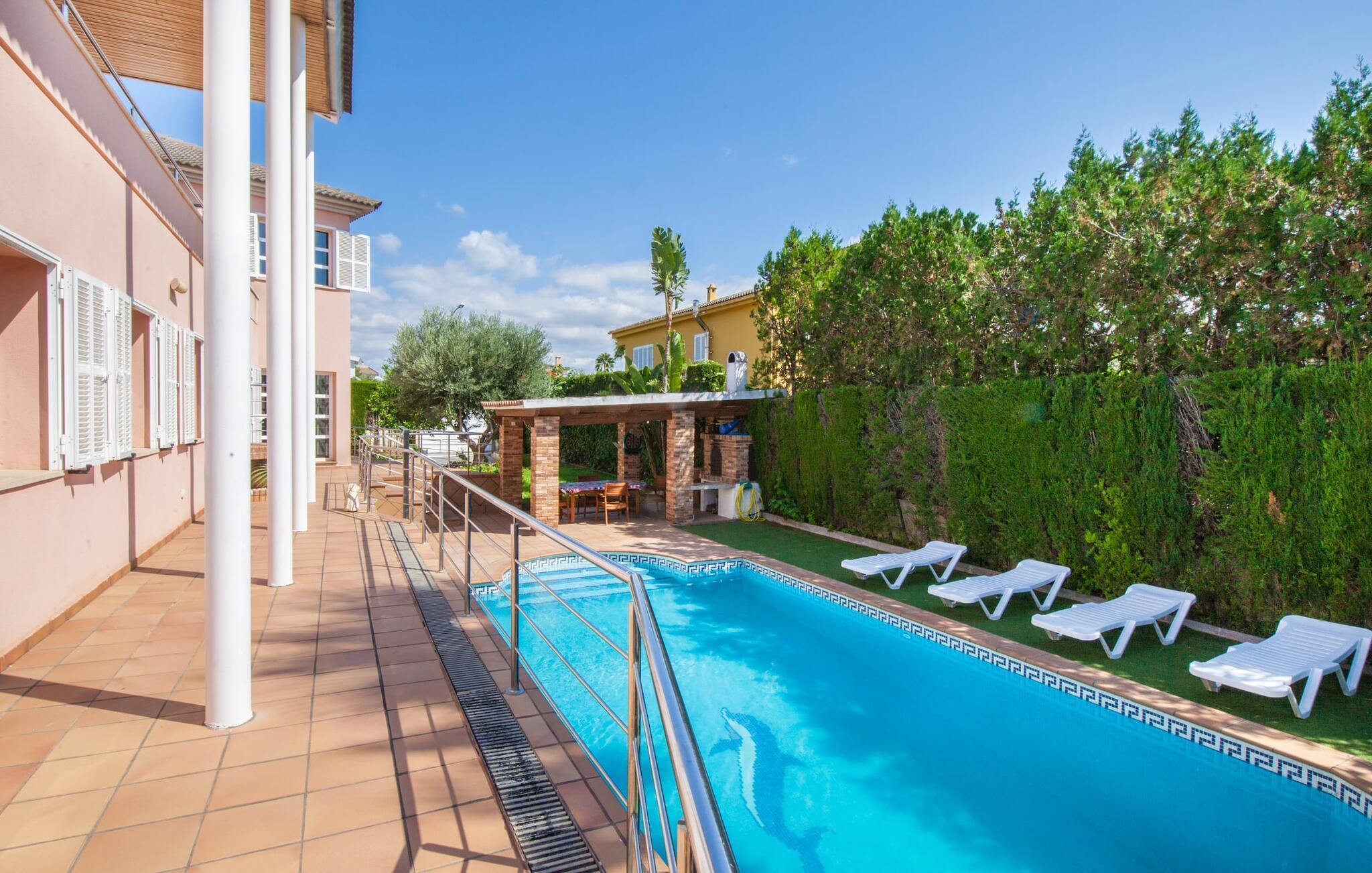 „Alfabia“ bietet den perfekten Rückzugsort nach einem langen Spaziergang durch Palmas geschäftige Straßen. Eine hohe Hecke, die Privatsphäre garantiert, ein großer Pool mit abgestuftem Bodenbelag, umgeben von gepflegtem Kunstrasen – hier dreht sich alles um Entspannung. Direkt neben dem Pool wartet eine gemütliche, überdachte Terrasse darauf, von Ihnen etwas Leben einzuhauchen. Während sich die Lust auf ein erfrischendes Bad noch in der Außendusche aufhält, können sich andere hungrige Besucher daran machen, den Grill anzuzünden. Frischer Fisch, dazu Wein – was braucht man mehr? Und wer noch Lust auf mehr Unterhaltung hat, probiert sich am Abend vielleicht mal bei einer Runde Darts. Oberhalb des Pools beherbergt die Villa eine weitere Dachterrasse mit herrlichem Blick auf die umliegenden Dächer und Berge in der Ferne. Eine kleine Theke, schicke Kunstrattanmöbel, viel Platz und eine tolle Aussicht – das ist eindeutig der perfekte Ort für ein Treffen im Freien. Eine asphaltierte Auffahrt führt direkt bis zur Villa, auf der Straße vor dem Haus sind ausreichend Parkplätze vorhanden.