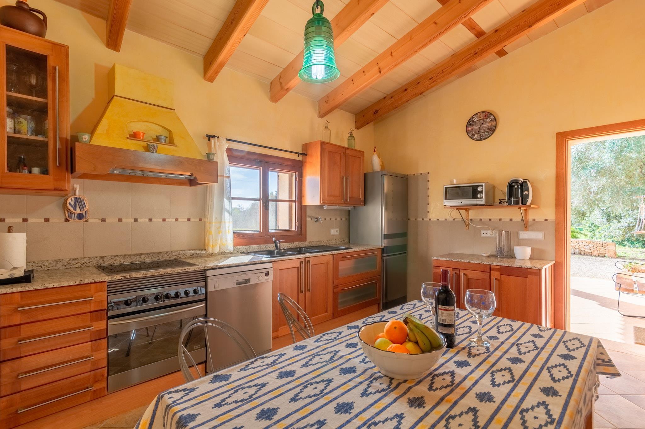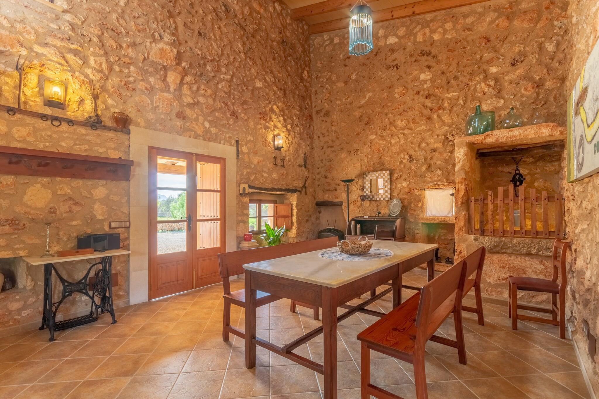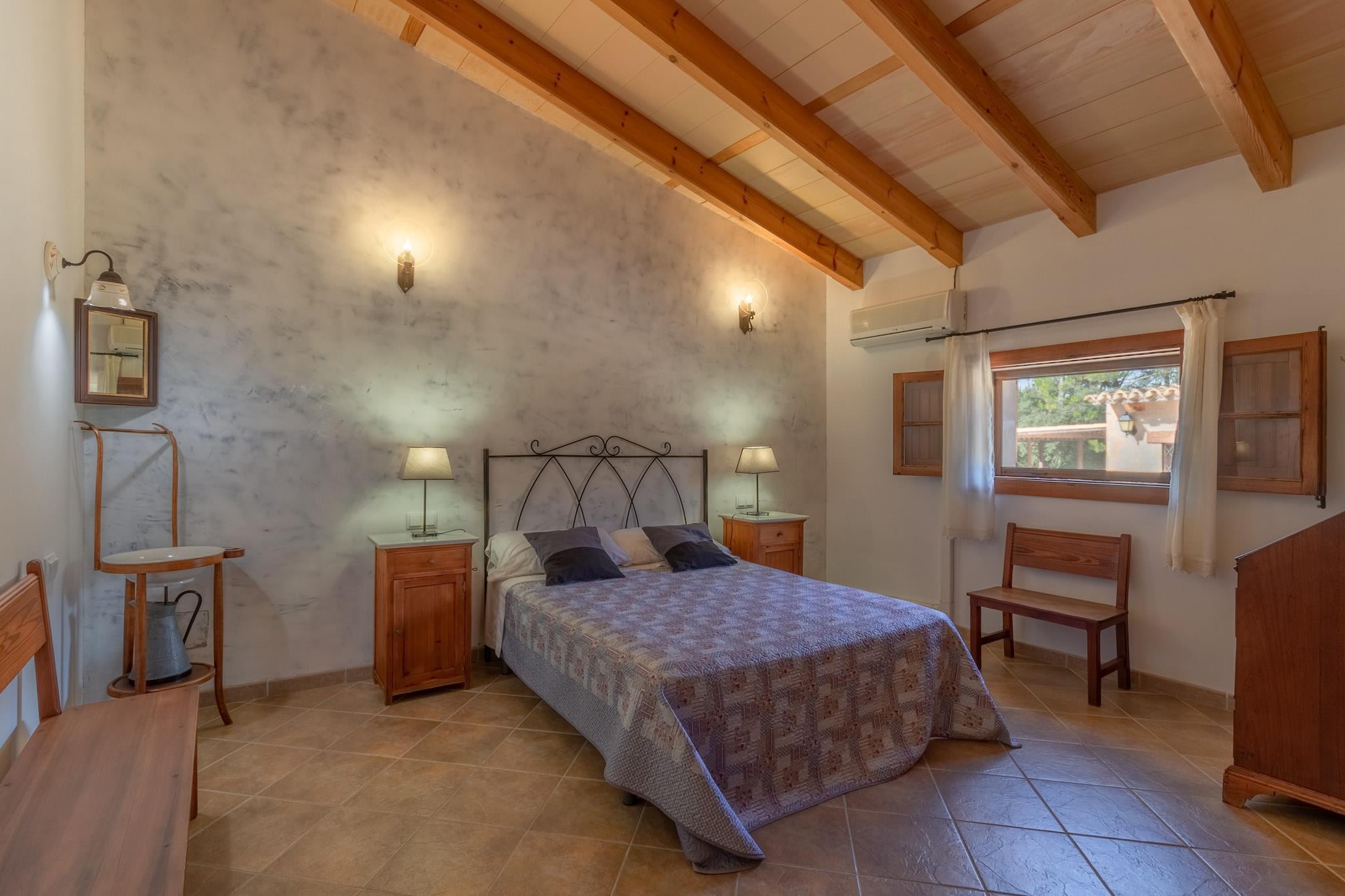 This inviting country house-Son Garbi, nestled on a private and peaceful plot near Algaida, offers a serene escape for couples and small families. The home features one comfortable double bedroom and a loft area with two single beds, accommodating up to four guests. The property is equipped with air conditioning (hot/cold) for year-round comfort, free WiFi, and a cozy fireplace for cooler evenings. Outside, guests can enjoy the 8m x 4.5m swimming pool, comfortable loungers, and a barbecue area perfect for al fresco dining. The garden is fully fenced, ensuring privacy, and includes a playground for children. The country house is just a short distance from Algaida, a charming village known for its lively market life, local cafés, and traditional Mallorcan atmosphere. The area is famous for its delicious "Pa amb Oli" and the renowned "Ca'l Dimoni" restaurant, where you can sample local grilled specialties. The nearby Gordiola glassworks offers a fascinating museum and the opportunity to purchase unique souvenirs. Algaida also boasts a selection of supermarkets, bakeries, and pharmacies, as well as the organic winery, Can Majoral, one of the oldest in Spain. For beach lovers, the Arenal beach is just 15 minutes away by car. The interior of the country house is rustic yet cozy, featuring charming natural stone walls, wooden ceiling beams, and comfortable furniture. The living room is divided into a TV area with a fireplace and an integrated dining space with wooden benches. The fully equipped kitchen includes a microwave, coffee machine, dishwasher, fridge, oven, stove, and cooking utensils, making meal preparation easy.