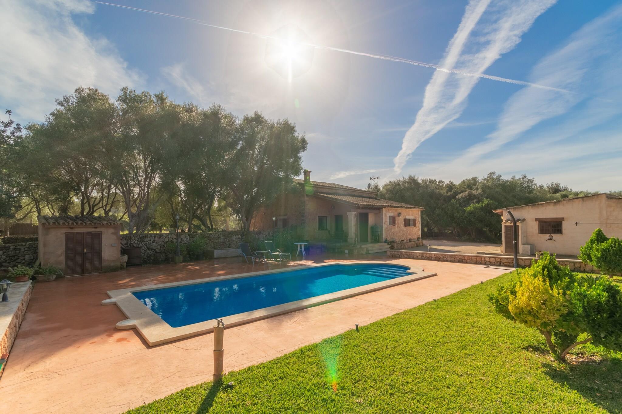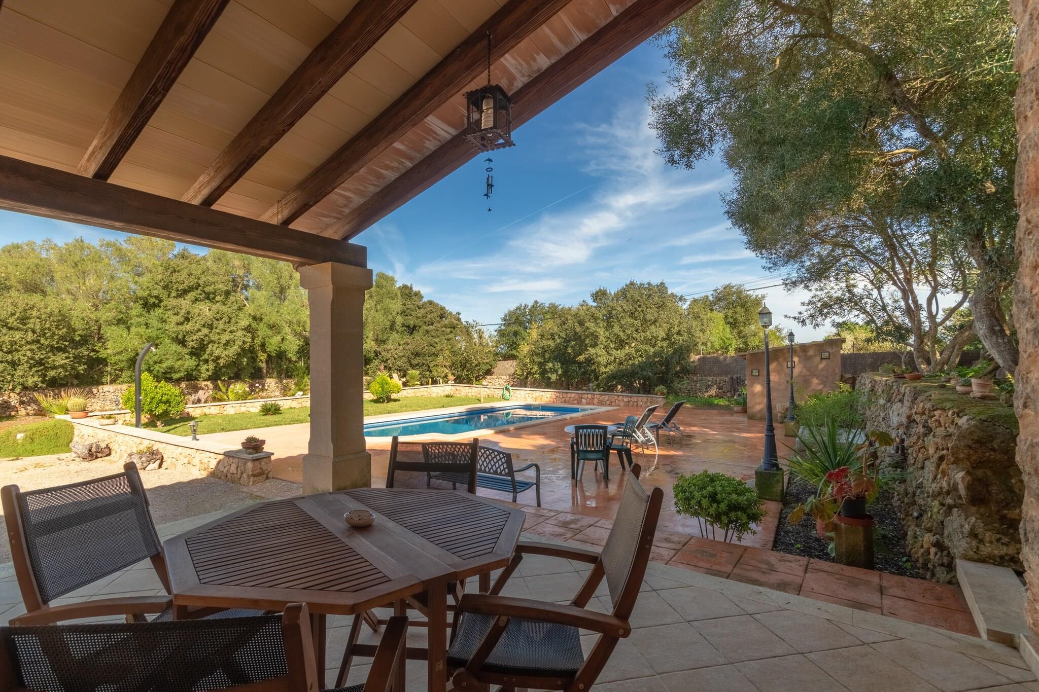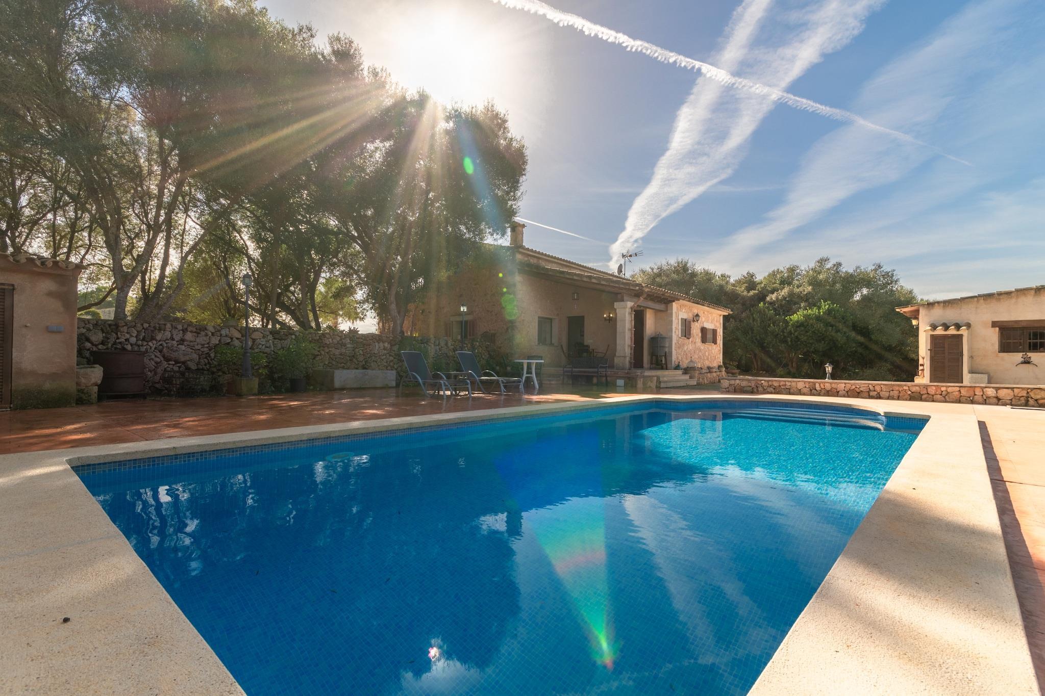 This inviting country house-Son Garbi, nestled on a private and peaceful plot near Algaida, offers a serene escape for couples and small families. The home features one comfortable double bedroom and a loft area with two single beds, accommodating up to four guests. The property is equipped with air conditioning (hot/cold) for year-round comfort, free WiFi, and a cozy fireplace for cooler evenings. Outside, guests can enjoy the 8m x 4.5m swimming pool, comfortable loungers, and a barbecue area perfect for al fresco dining. The garden is fully fenced, ensuring privacy, and includes a playground for children. The country house is just a short distance from Algaida, a charming village known for its lively market life, local cafés, and traditional Mallorcan atmosphere. The area is famous for its delicious "Pa amb Oli" and the renowned "Ca'l Dimoni" restaurant, where you can sample local grilled specialties. The nearby Gordiola glassworks offers a fascinating museum and the opportunity to purchase unique souvenirs. Algaida also boasts a selection of supermarkets, bakeries, and pharmacies, as well as the organic winery, Can Majoral, one of the oldest in Spain. For beach lovers, the Arenal beach is just 15 minutes away by car. The interior of the country house is rustic yet cozy, featuring charming natural stone walls, wooden ceiling beams, and comfortable furniture. The living room is divided into a TV area with a fireplace and an integrated dining space with wooden benches. The fully equipped kitchen includes a microwave, coffee machine, dishwasher, fridge, oven, stove, and cooking utensils, making meal preparation easy.