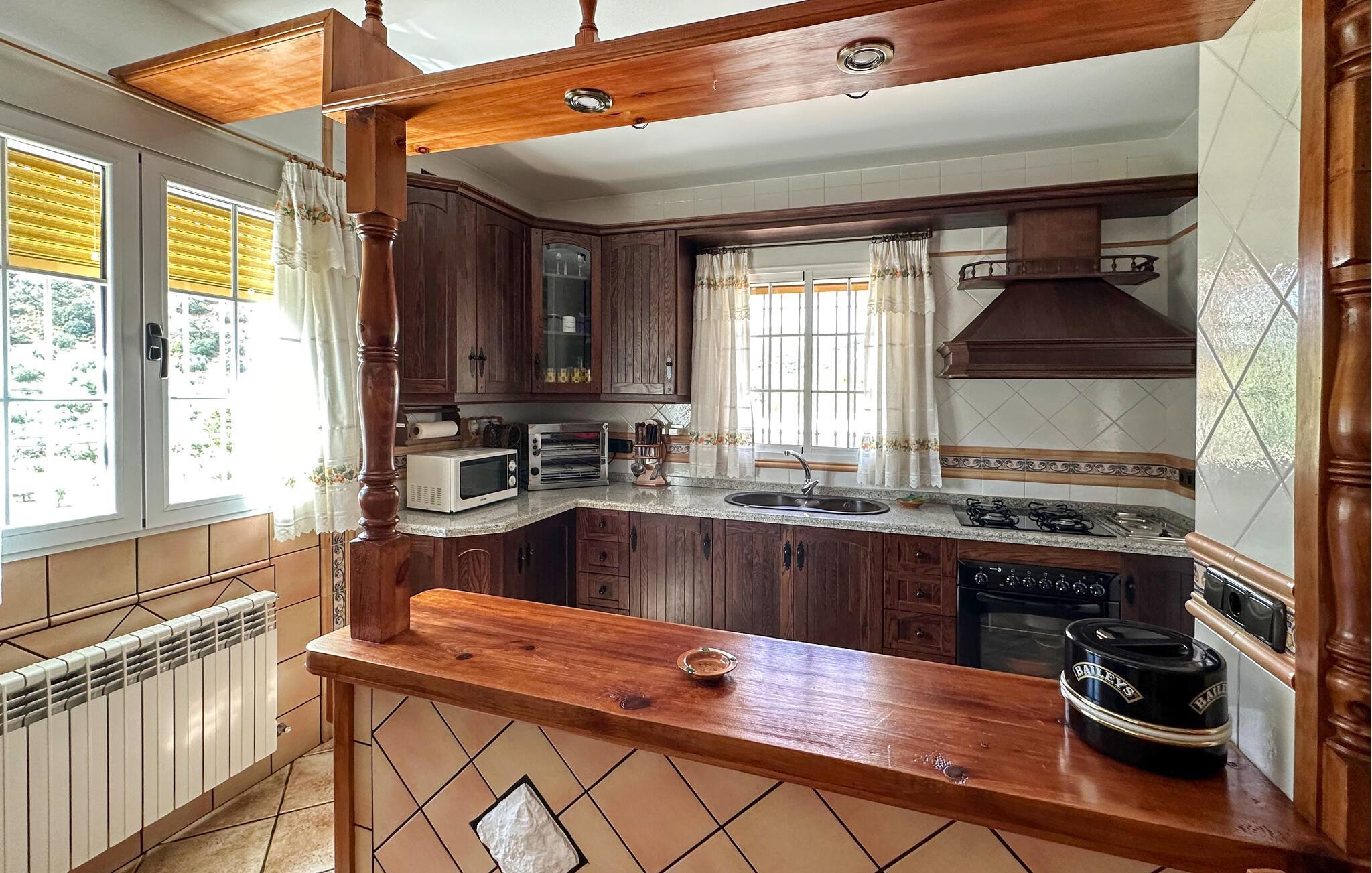 Beginnen Sie Ihren Tag in Ihrem Ferienhaus nahe Algarinejo mit einem Frühstück auf der überdachten Terrasse, während Sie den Blick auf die umliegenden Hügel und Olivenhaine genießen. Die voll ausgestattete Küche bietet Ihnen alles, um selbst leckere Mahlzeiten zuzubereiten, die Sie gemeinsam am einladenden Esstisch genießen können. Der großzügige Wohnbereich mit Holzbalkendecke und gemütlichem Sofa lädt zu entspannten Stunden ein, sei es bei einem guten Buch oder einer gemeinsamen Brettspielrunde.