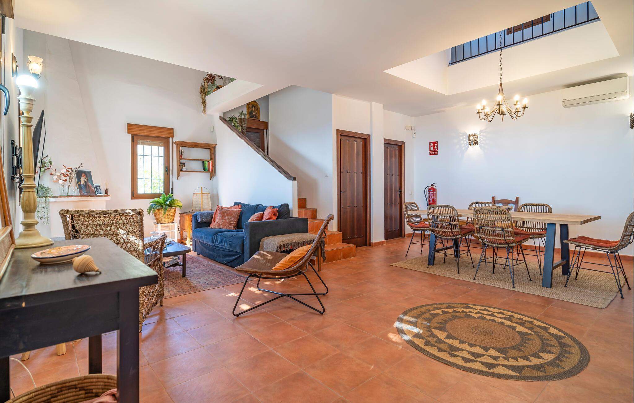 Etwas zurückgezogen von der Küste begrüßt Sie in erreichbarer Nähe der sonnigen Küstenstadt Málaga dieses einladende Haus, das wunderschön in die ländliche Umgebung von Algarrobo eingebettet ist. Das gemütliche Innere mit Erdfarben und rustikalen Elementen versprüht eine warme und angenehme Atmosphäre zum Wohlfühlen und bietet Ihnen alles, was Sie für einen gelungenen Aufenthalt mit Ihrer Großfamilie suchen. Die Terrasse mit Pool bietet wohltuende Sonnenbäder und Badespaß. Abends können Sie auf der überdachten Terrasse Köstlichkeiten vom gemauerten Grill einnehmen, während Sie das Meerpanorama genießen.