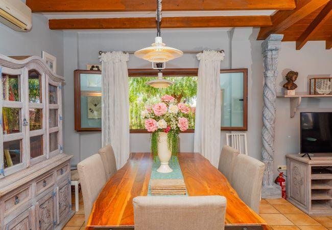 The property extends over 1,300 m² of private plot with well-maintained gardens, a heated salt chlorination swimming pool and a children's area for the little ones. With capacity for 12 people in 5 double bedrooms, the villa is designed for maximum comfort with 240 m² distributed over two floors. The 40 m² living-dining room is equipped with Smart TV and access to platforms such as Netflix, HBO and Amazon Prime, ideal for moments of relaxation. The independent kitchen is fully equipped so you can prepare your best meals.